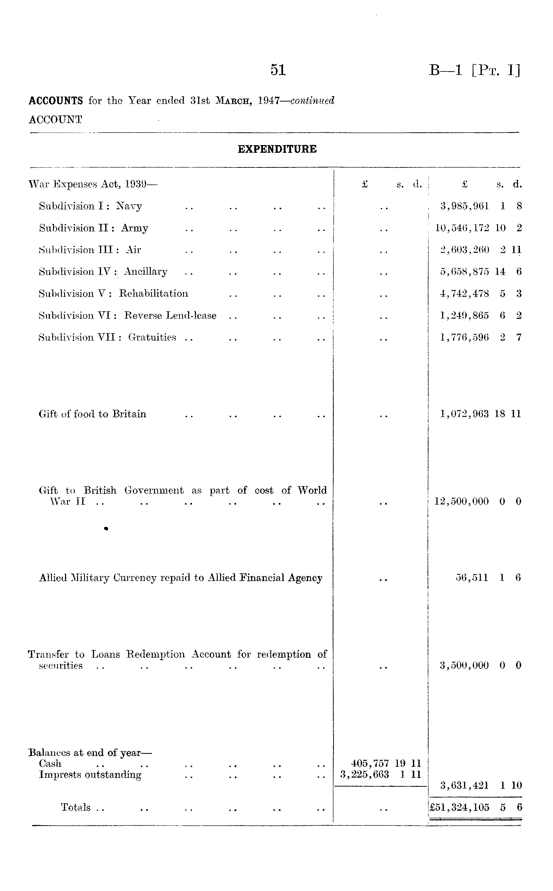 EXPENDITURE War Expenses Act, 1939 — £ s. d. £ s. d. Subdivision I: Navy 3,985,961 1 8 Subdivision II: Army 10,546,172 10 2 Subdivision III: Air 2,603,260 2 11 Subdivision IV : Ancillary .. .. .. 5,658,875 14 6 Subdivision V : Rehabilitation .. .. 4,742,478 5 3 Subdivision VI: Reverse Lend-lease 1,249,865 6 2 Subdivision VII: Gratuities 1,776,596 2 7 Gift of food to Britain 1,072,963 18 11 Gift to British. Government as part of cost of World War II .. •- •• 12,500,000 0 0 Allied Military Currency repaid to Allied Financial Agency •• 56,511 1 6 Transfer to Loans Redemption Account for redemption of securities •• 3,500,000 0 0 Balances at end of year — Cash Imprests outstanding 405,757 19 11 3,225,663 1 11 3,631,421 1 10 Totals £51,324,105 5 6