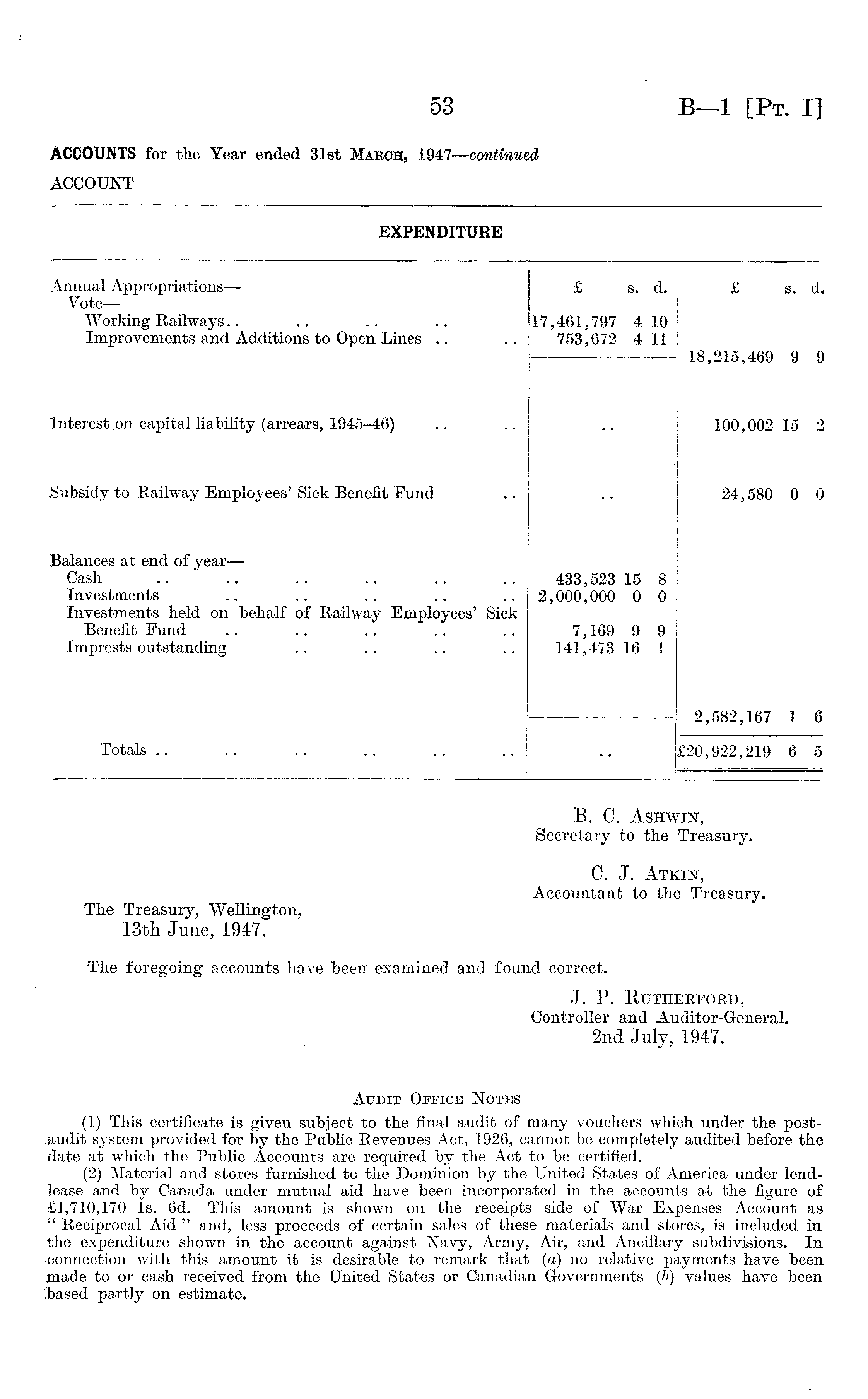 B. C. Ashwin, Secretary to the Treasury. C. J. Atkin, Accountant to the Treasury. The Treasury, Wellington, 13th June, 1947. The foregoing accounts have been examined and found correct. J. P. Rutherford, Controller and 'Auditor-General. 2nd July, 1947.