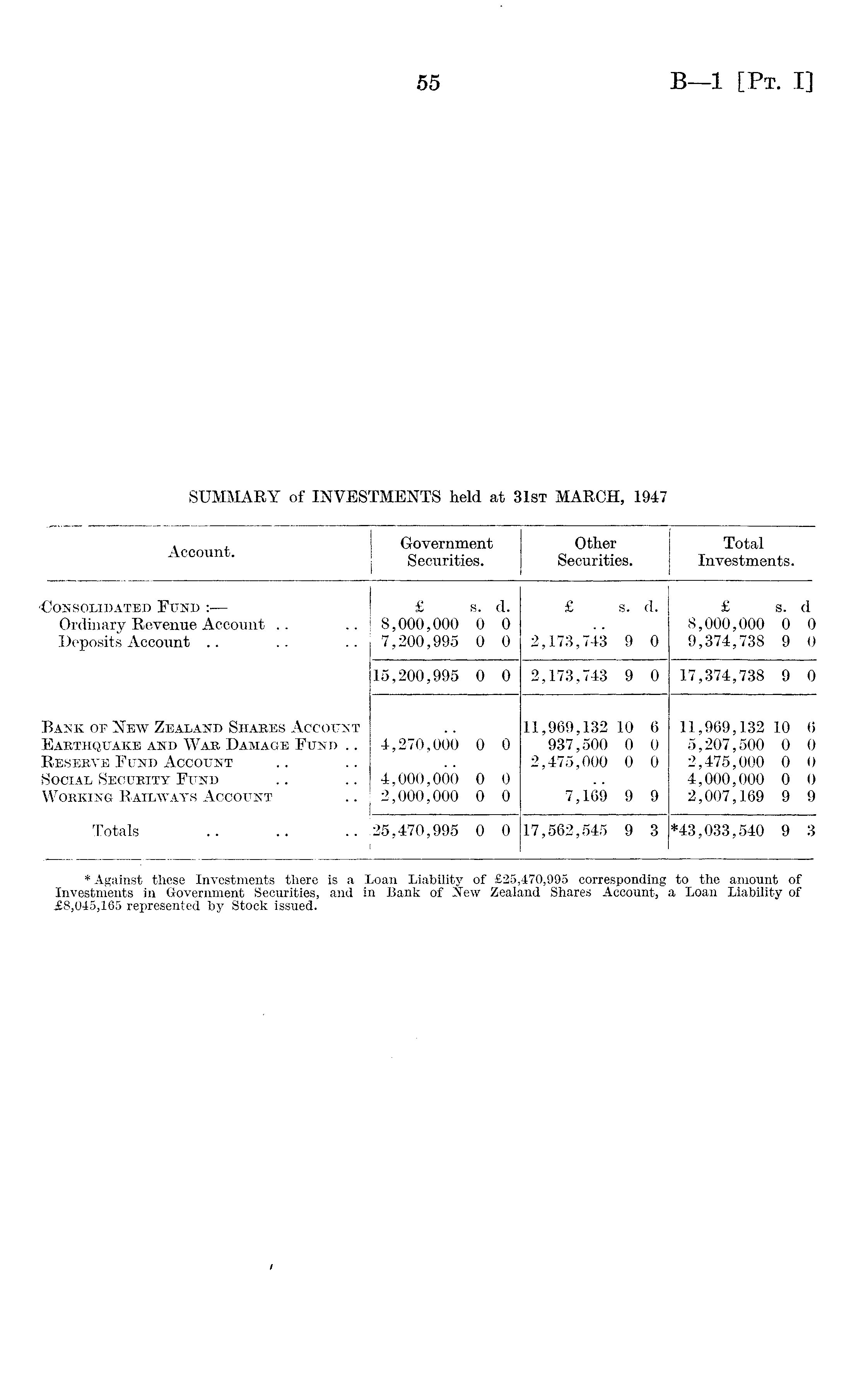 * Against these Investments there is a Loan Liability of £25,470,995 corresponding to the amount of Investments in Government Securities, and in Bank of New Zealand Shares Account, a Loan Liability of £8,045,165 represented by Stock issued.