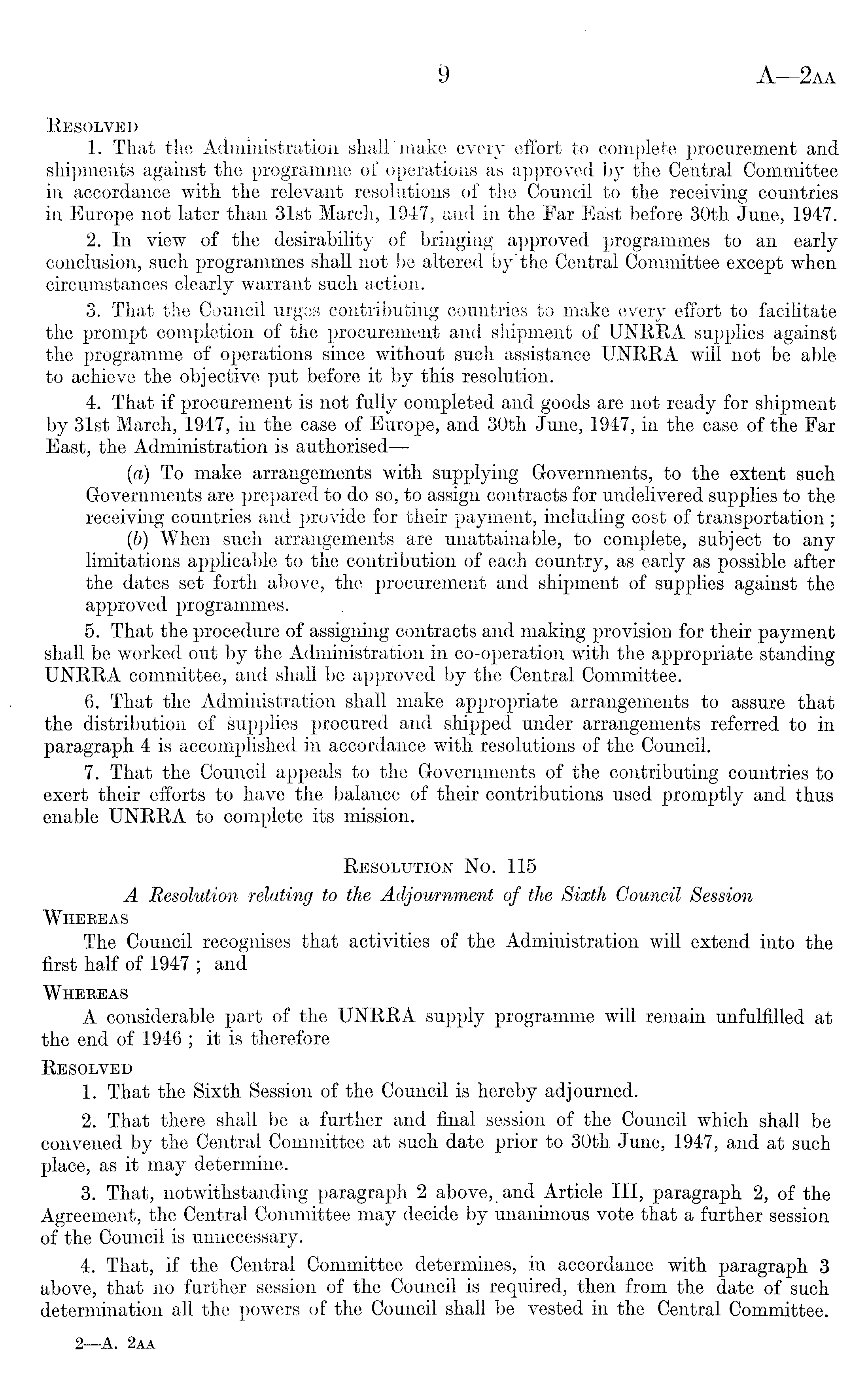 Resolved 1. That the Administration shallmake every effort to complete procurement and shipments against the programme of operations as approved by the Central Committee in accordance with the relevant resolutions of the Council to the receiving countries in Europe not later than 31st March, 1947, and in the Far East before 30th June, 1947. 2. In view of the desirability of bringing approved programmes to an early conclusion, such programmes shall not be altered by'the Central Committee except when circumstances clearly warrant such action. 3. That the Council urges contributing countries to make every effort to facilitate the prompt completion of the procurement and shipment of UNRRA supplies against the programme of operations since without such assistance UNRRA will not be able to achieve the objective put before it by this resolution. 4. That if procurement is not fully completed and goods are not ready for shipment by 31st March, 1947, in the case of Europe, and 30th June, 1947, in the case of the Far East, the Administration is authorised — (a) To make arrangements with supplying Governments, to the extent such Governments are prepared to do so, to assign contracts for undelivered supplies to the receiving countries and provide for their payment, including cost of transportation ; (b) When such arrangements are unattainable, to complete, subject to any limitations applicable to the contribution of each country, as early as possible after the dates set forth above, the procurement and shipment of supplies against the approved programmes. 5. That the procedure of assigning contracts and making provision for their payment shall be worked out by the Administration in co-operation with the appropriate standing UNRRA committee, and shall be approved by the Central Committee. 6. That the Administration shall make appropriate arrangements to assure that the distribution of supplies procured and shipped under arrangements referred to in paragraph 4 is accomplished in accordance with resolutions of the Council. 7. That the Council appeals to the Governments of the contributing countries to exert their efforts to have the balance of their contributions used promptly and thus enable UNRRA to complete its mission. Resolution No. 115 A Resolution relating to the Adjournment of the Sixth Council Session Whereas The Council recognises that activities of the Administration will extend into the first half of 1947 ; and Whereas A considerable part of the UNRRA supply programme will remain unfulfilled at the end of 1946 ; it is therefore Resolved 1. That the Sixth Session of the Council is hereby adjourned. 2. That there shall be a further and final session of the Council which shall be convened by the Central Committee at such date prior to 30th June, 1947, and at such place, as it may determine. 3. That, notwithstanding paragraph 2 above, and Article 111, paragraph 2, of the Agreement, the Central Committee may decide by unanimous vote that a further session of the Council is unnecessary. 4. That, if the Central Committee determines, in accordance with paragraph 3 above, that no further session of the Council is required, then from the date of such determination all the powers of the Council shall be vested in the Central Committee. 2—A. 2aa