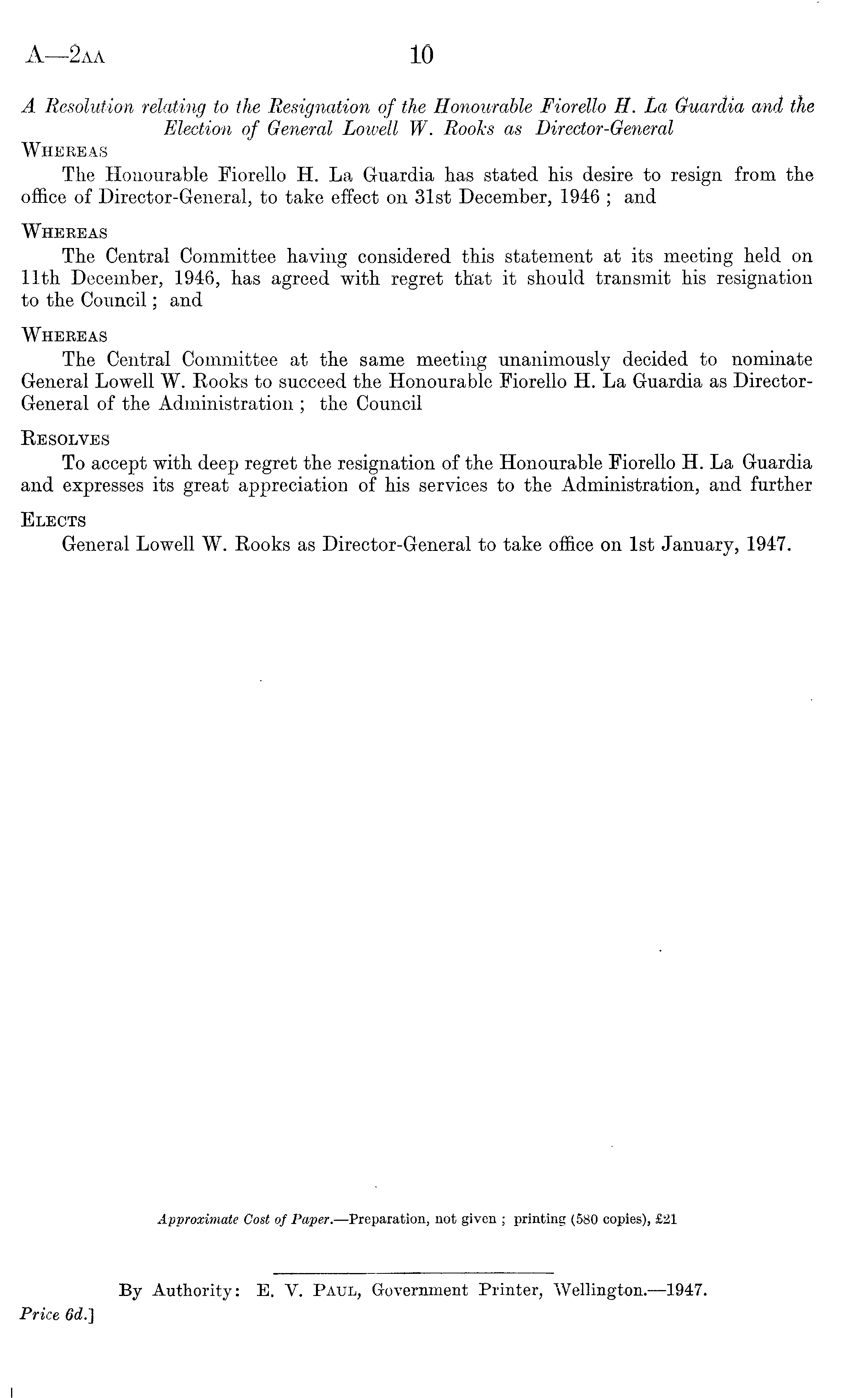 A Resolution relating to the Resignation of the Honourable Fiorello H. La Guardia and the Election of General Lowell W. Rooks as Director-General Whereas The Honourable Fiorello H. La Guardia has stated his desire to resign from the office of Director-General, to take effect on 31st December, 1946 ; and Whereas The Central Committee having considered this statement at its meeting held on 11th December, 1946, has agreed with regret that it should transmit his resignation to the Council; and Whereas The Central Committee at the same meeting unanimously decided to nominate General Lowell W. Rooks to succeed the Honourable Fiorello H. La Guardia as DirectorGeneral of the Administration ; the Council Resolves To accept with deep regret the resignation of the Honourable Fiorello H. La Guardia and expresses its great appreciation of his services to the Administration, and further Elects General Lowell W. Rooks as Director-General to take office on Ist January, 1947. Approximate Cost of Paper.—Preparation, not given ; printing (580 copies), £2l By Authority: E. V. Paul, Government Printer, Wellington.—l 947. Price 6d.]