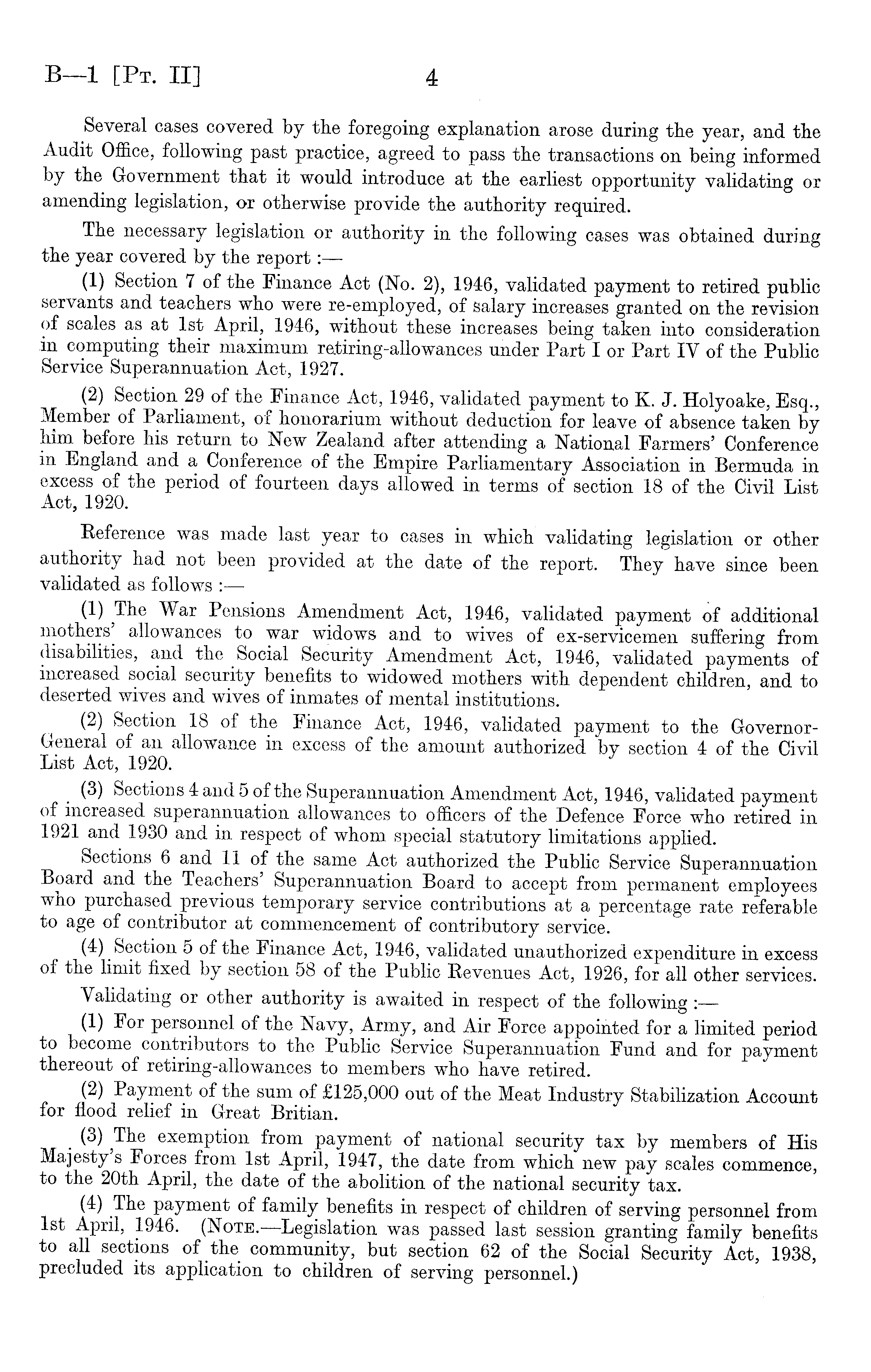 Several cases covered by the foregoing explanation arose during the year, and the Audit Office, following past practice, agreed to pass the transactions on being informed by the Government that it would introduce at the earliest opportunity validating or amending legislation, or otherwise provide the authority required. The necessary legislation or authority in the following cases was obtained during the year covered by the report:— (1) Section 7 of the Finance Act (No. 2), 1946, validated payment to retired public servants and teachers who were re-employed, of Salary increases granted on the revision of scales as at Ist April, 1946, without these increases being taken into consideration in computing their maximum retiring-allowances under Part I or Part IY of the Public Service Superannuation Act, 1927. (2) Section 29 of the Finance Act, 1946, validated payment to K. J. Holyoake, Esq., Member of Parliament, of honorarium without deduction for leave of absence taken by him before his return to New Zealand after attending a National Farmers' Conference in England and a Conference of the Empire Parliamentary Association in Bermuda in excess of the period of fourteen days allowed in terms of section 18 of the Civil List Act, 1920. Reference was made last year to cases in which validating legislation or other authority had not been provided at the date of the report. They have since been validated as follows : (1) The War Pensions Amendment Act, 1946, validated payment of additional mothers' allowances to war widows and to wives of ex-servicemen suffering from disabilities, and the Social Security Amendment Act, 1946, validated payments of increased social security benefits to widowed mothers with dependent children, and to deserted wives and wives of inmates of mental institutions. (2) Section 18 of the Finance Act, 1946, validated payment to the GovernorGeneral of an allowance in excess of the amount authorized bv section 4 of the Civil List Act, 1920. (3) Sections 4 and sof the Superannuation Amendment Act, 1946, validated payment of increased superannuation allowances to officers of tlie Defence Force who retired in 1921 and 1930 and in respect of whom special statutory limitations applied. Sections 6 and 11 of the same Act authorized the Public Service Superannuation Board and the Teachers' Superannuation Board to accept from permanent employees who purchased previous temporary service contributions at a percentage rate referable to age of contributor at commencement of contributory service. (4) Section 5 of the Finance Act, 1946, validated unauthorized expenditure in excess of the limit fixed by section 58 of the Public Revenues Act, 1926, for all other services. Validating or other authority is awaited in respect of the following (1) For personnel of the Navy, Army, and Air Force appointed for a limited period to become contributors to the Public Service Superannuation Fund and for payment thereout of retiring-allowances to members who have retired. (2) Payment of the sum of £125,000 out of the Meat Industry Stabilization Account for flood relief in Great Britian. (3) The exemption from payment of national security tax by members of His Majesty's Forces from Ist April, 1947, the date from which new pay scales commence, to the 20th April, the date of the abolition of the national security tax. (4) The payment of family benefits in respect of children of serving personnel from Ist April, 1946. (Note.—Legislation was passed last session granting family benefits to all sections of the community, but section 62 of the Social Security Act, 1938, precluded its application to children of serving personnel.)