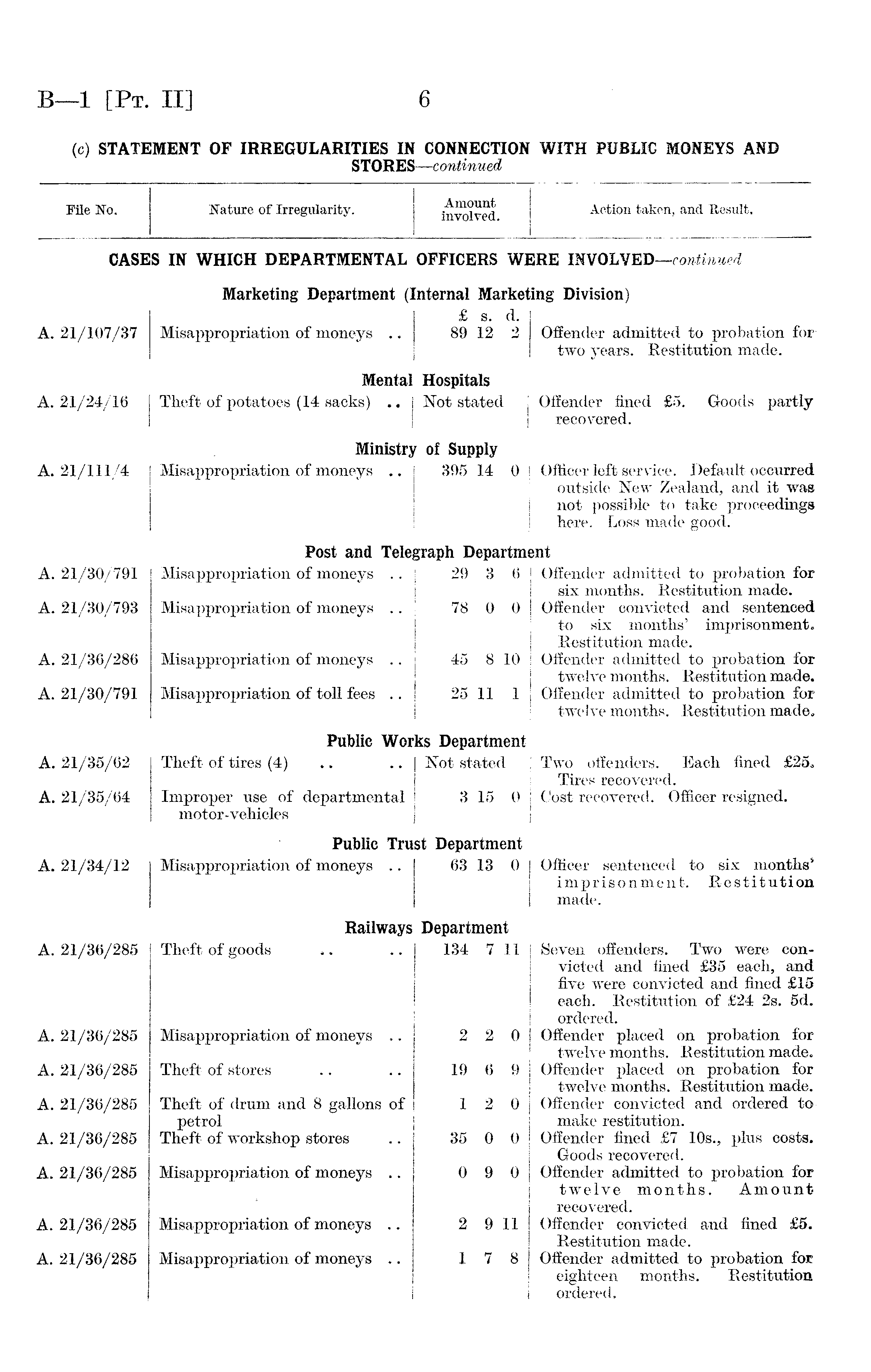 File No. Nature of Irregularity. Amount involved. Action taken, and Result. CASES IN WHICH DEPARTMENTAL OFFICERS WERE INVOLVED—continued Marketing Department (Internal Marketing Division) A. 21/107/37 Misappropriation of moneys .. x s. a. 89 12 2 Offender admitted to probation for two years. Restitution made. Mental Hospitals A. 21/24/16 Theft of potatoes (14 sacks) .. Not stated Offender fined £5. Goods partly recovered. Ministry of Supply A. 21/111/4 Misappropriation of moneys .. 395 14 0 1 Officer left service. Default occurred outside New Zealand, and it was not possible to take proceedings here. Loss made good. Post and Telegraph Department A. 21/30/791 Misappropriation of moneys .. 29 3 6 Offender admitted to probation for six months. Restitution made. A. 21/30/793 Misappropriation of moneys .. 78 0 0 Offender convicted and sentenced to six months' imprisonment. Restitution made. A. 21/36/286 Misappropriation of moneys .. 45 8 10 Offender admitted to probation for twelve months. Restitution made. A. 21/30/791 Misappropriation of toll fees .. 25 11 1 Offender admitted to probation for twelve months. Restitution made. Public Works Department A. 21/35/62 Theft of tires (4) Not stated Two offenders. Each fined £25. Tires recovered. A. 21/35/64 Improper use of departmental 3 15 0 Cost recovered. Officer resigned. motor-vehicles Public Trust Department A. 21/34/12 Misappropriation of moneys .. 63 13 0 Officer sentenced to six months' imprisonment. Restitution made. Railways Department A. 21/36/285 Theft of goods 134 7 11 Seven offenders. Two were convicted and fined £35 each, and five were convicted and fined £15 each. Restitution of £24 2s. 5d. ordered. A. 21/36/285 Misappropriation of moneys .. 2 2 0 Offender placed on probation for twelve months. Restitution made. A. 21/36/285 Theft of stores 19 6 9 Offender placed on probation for twelve months. Restitution made. A. 21/36/285 Theft of drum and 8 gallons of 12 0 Offender convicted and ordered to petrol make restitution. A. 21/36/285 Theft of workshop stores 35 0 0 Offender fined £7 10s., plus costs. Goods recovered. A. 21/36/285 Misappropriation of moneys .. 0 9 0 Offender admitted to probation for twelve months. Amount « " recovered. A. 21/36/285 Misappropriation of moneys .. 2 9 11 Offender convicted and fined £5. Restitution made. A. 21/36/285 Misappropriation of moneys .. 17 8 Offender admitted to probation for eighteen months. Restitution ordered.