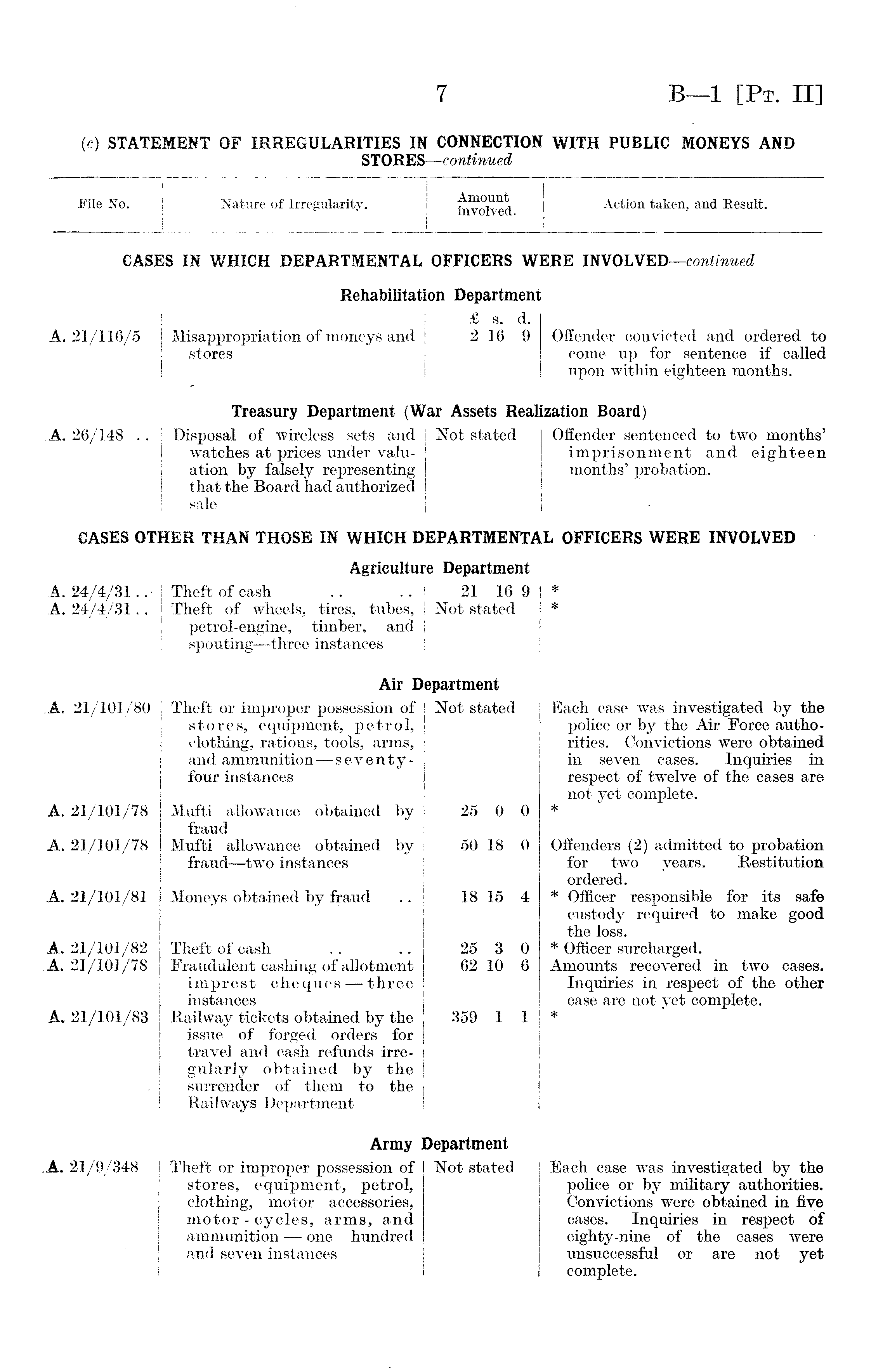 File No. Nature of Irregularity. Amount involved. Action taken, and Result. CASES IN WHICH DEPARTMENTAL OFFICERS WERE INVOLVED—continued Rehabilitation Department A. 21/116/5 Misappropriation of moneys and stores % s. a. 2 16 9 Offender convicted and ordered to come up for sentence if called upon within eighteen months. Treasury Department (War Assets Realization Board) A. 26/148 .. Disposal of wireless sets and watches at prices under valuation by falsely representing that the Board had authorized sale Not stated Offender sentenced to two months' imprisonment and eighteen months' probation. CASES OTHER THAN THOSE IN WHICH DEPARTMENTAL OFFICERS WERE INVOLVED Agriculture Department A. 24/4/31..A. 24/4/31.. Theft of cash Theft of wheels, tires, tubes, petrol-engine, timber, and spouting—three instances 21 16 9 Not stated * * Air Department A. 21/101/80 A. 21/101/78 A. 21/101/78 A. 21/101/81 Theft or improper possession of stores, equipment, petrol, clothing, rations, tools, arms, and ammunition —seventyfour instances Mufti allowance obtained by fraud Mufti allowance obtained by fraud—two instances Moneys obtained by fraud Not stated 25 0 0 50 18 0 18 15 4 Each case was investigated by the police or by the Air Force authorities. Convictions were obtained in seven cases. Inquiries in respect of twelve of the cases are not yet complete. * Offenders (2) admitted to probation for two years. Restitution ordered. * Officer responsible for its safe custody required to make good the loss. * Officer surcharged. Amounts recovered in two cases. Inquiries in respect of the other case are not yet complete. * A. 21/101/82 A. 21/101/78 A. 21/101/83 Theft of cash Fraudulent cashing of allotment imprest cheques — three instances Railway tickets obtained by the issue of forged orders for travel and cash refunds irregularly obtained by the surrender of them to the Railways Department 25 3 0 62 10 6 359 1 1 Army Department .A. 21/9/348 Theft or improper possession of stores, equipment, petrol, clothing, motor accessories, motor - cycles, arms, and ammunition —- one hundred and seven instances Not stated Each case was investigated by the police or by military authorities. Convictions were obtained in five cases. Inquiries in respect of eighty-nine of the cases were unsuccessful or are not yet complete.