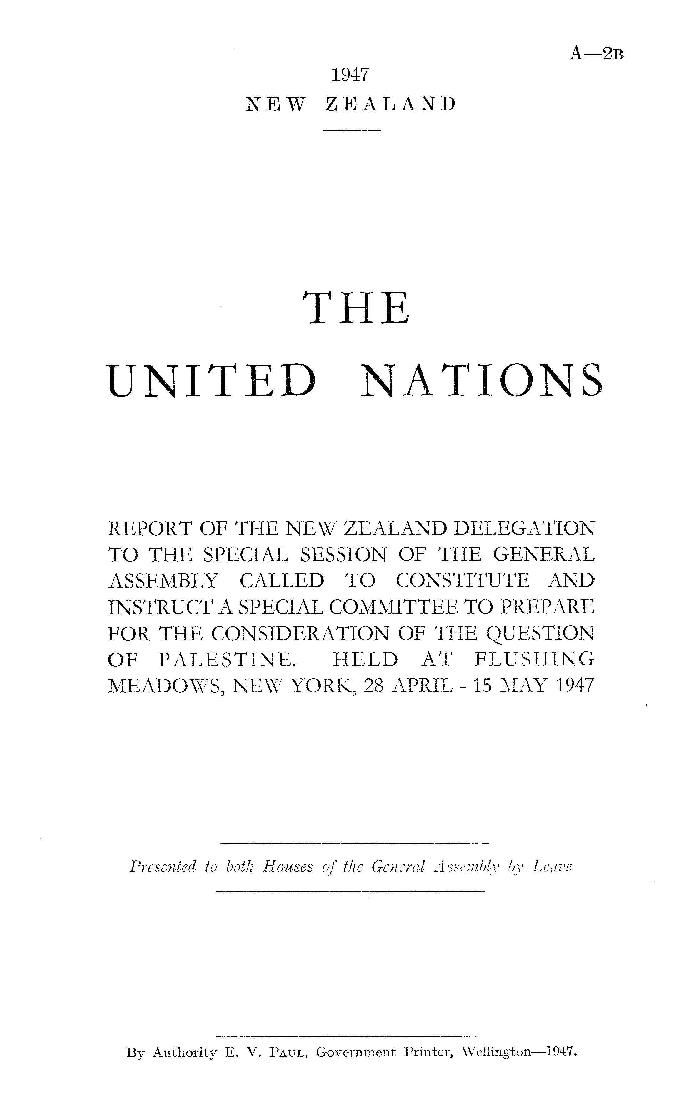 THE UNITED NATIONS REPORT OF THE NEW ZEALAND DELEGATION TO THE SPECIAL SESSION OF THE GENERAL ASSEMBLY CALLED TO CONSTITUTE AND INSTRUCT A SPECIAL COMMITTEE TO PREPARE FOR THE CONSIDERATION OF THE QUESTION OF PALESTINE, HELD AT FLUSHING MEADOWS, NEW YORK, 28 APRIL - 15 MAY 1947