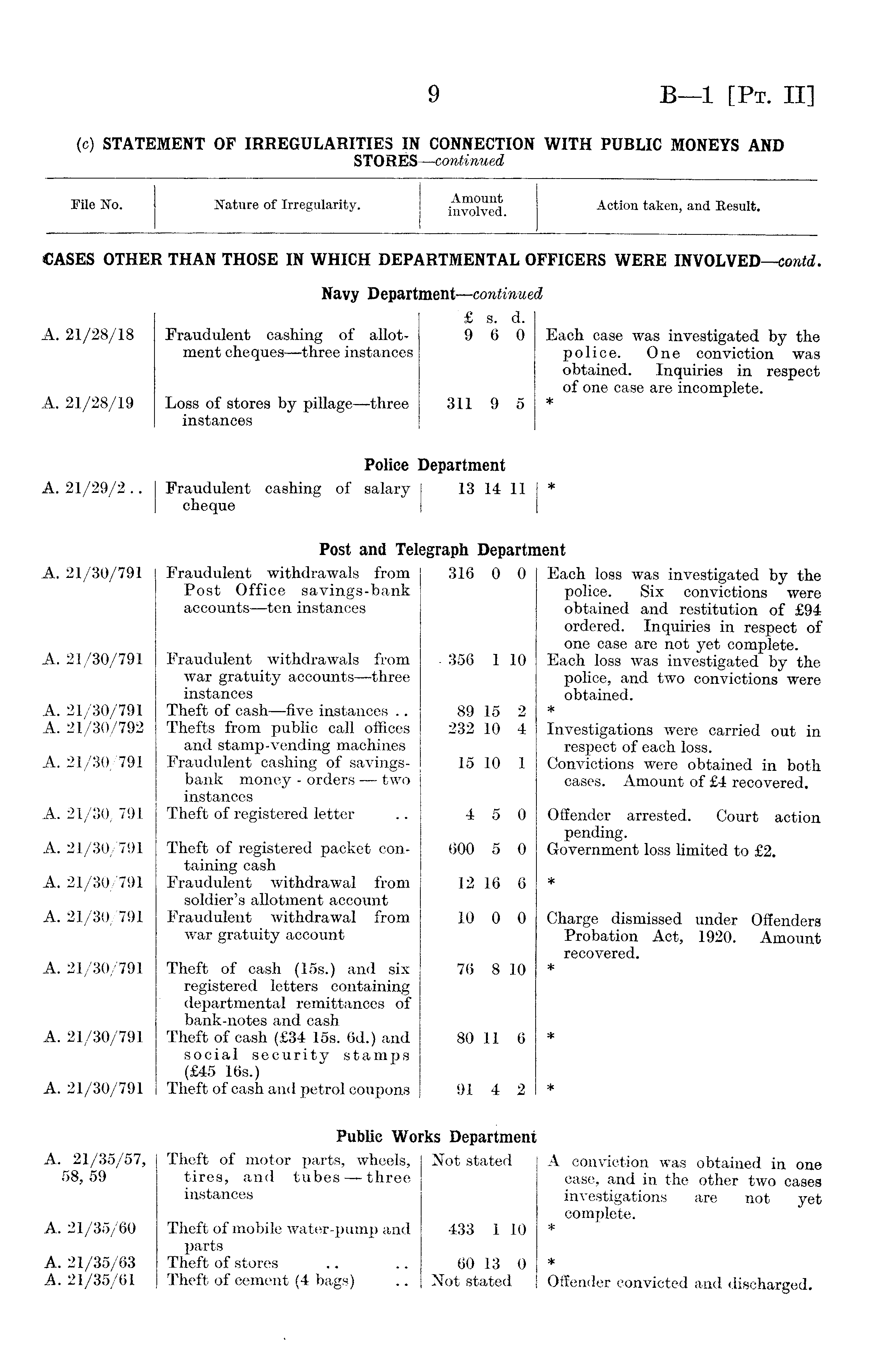 File No. Nature of Irregularity. Amount involved. Action taken, and Result. CASES OTHER THAN THOSE IN WHICH DEPARTMENTAL OFFICERS WERE INVOLVED —contd. Navy Department—continue* i A. 21/28/18 Fraudulent cashing of allotx s. a. 9 6 0 Each case was investigated by the ment cheques—three instances police. One conviction was obtained. Inquiries in respect of one case are incomplete. A. 21/28/19 Loss of stores by pillage—three 311 9 5 * instances Police Department A. 21/29/2., Fraudulent cashing of salary 13 14 11 cheque 1 Post and Telegraph Department A. 21/30/791 Fraudulent withdrawals from 316 0 0 Each loss was investigated by the Post Office savings-bank police. Six convictions were accounts—ten instances obtained and restitution of £94 ordered. Inquiries in respect of one case are not yet complete. A. 21/30/791 Fraudulent withdrawals from 356 1 10 Each loss was investigated by the war gratuity accounts —three police, and two convictions were instances obtained. A. 21/30/791 Theft of cash —five instances .. 89 15 2 * A. 21/30/792 Thefts from public call offices 232 10 4 Investigations were carried out in and stamp-vending machines respect of each loss. A. 21/30/791 Fraudulent cashing of savings15 10 1 Convictions were obtained in both bank money - orders — two cases. Amount of £4 recovered. instances A. 21/30/791 Theft of registered letter 4 5 0 Offender arrested. Court action pending. A. 21/30/791 Theft of registered packet con600 5 0 Government loss limited to £2. taining cash A. 21/30/791 Fraudulent withdrawal from 12 16 6 * soldier's allotment account A. 21/30/791 Fraudulent withdrawal from 10 0 0 Charge dismissed under Offenders war gratuity account Probation Act, 1920. Amount recovered. A. 21/30/791 Theft of cash (15s.) and six 76 8 10 * registered letters containing departmental remittances of bank-notes and cash A. 21/30/791 Theft of cash (£34 15s. 6d.) and 80 11 6 * social security stamps (£45 16s.) A. 21/30/791 Theft of cash and petrol coupons 91 4 2 * Public Works Department A. 21/35/57, Theft of motor parts, wheels, Not stated A conviction was obtained in one 58, 59 tires, and tubes —three case, and in the other two cases instances investigations are not yet complete. A. 21/35/60 Theft of mobile water-pump and 433 1 10 * parts A. 21/35/63 Theft of stores 60 13 0 * A. 21/35/61 Theft of cement (4 bags) Not stated Offender convicted and discharged.