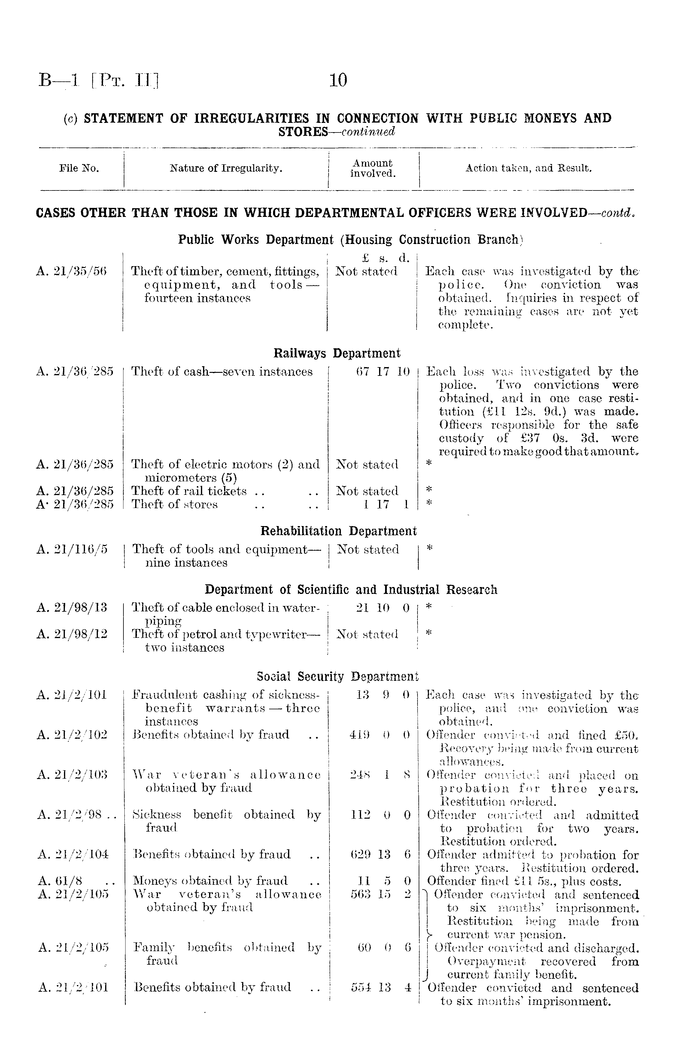 Pile No. Nature of Irregularity. Amount involved. Action taken, and Result. CASES OTHER THAN THOSE IN WHICH DEPARTMENTAL OFFICERS WERE INVOLVED—contd. Public Works Department (Housing Construction Branch) A. 21/35/56 Theft of timber, cement, fittings, i s. a. Not stated Each case was investigated by theequipment, and tools — police. One conviction was fourteen instances obtained. Inquiries in respect of the remaining cases are not yet complete. Railways Department A. 21/36/285 Theft of cash—seven instances 67 17 10 Each loss was investigated by the police. Two convictions were obtained, and in one case restitution (£11 12s. 9d.) was made. Officers responsible for the safe custody of £37 0s. 3d. were required to make good that amount. A. 21/36/285 Theft of electric motors (2) and Not stated * micrometers (5) A. 21/36/285 Theft of rail tickets Not stated * A- 21/36/285 Theft of stores 1 17 1 * Rehabilitation Department A. 21/116/5 Theft of tools and equipment— Not stated * nine instances Department of Scientific and Industrial Research A. 21/98/13 Theft of cable enclosed in water21 10 0 * piping A. 21/98/12 Theft of petrol and typewriter— Not stated * two instances Social Security Department A. 21/2/101 Fraudulent cashing of sickness13 9 0 Each case was investigated by the benefit warrants — three police, and one conviction was instances obtained. A. 21/2/102 Benefits obtained by fraud 419 0 0 Offender convicted and fined £50. Recovery being made from current allowances. A. 21/2/103 War veteran's allowance 248 1 8 Offender convicted and placed on obtained by fraud probation for three years. Restitution ordered. A. 21/2/98 .. Sickness benefit obtained by 112 0 0 Offender convicted and admitted fraud to probation for two years. Restitution ordered. A. 21/2/104 Benefits obtained by fraud 629 13 6 Offender admitted to probation for three years. Restitution ordered. A. 61/8 Moneys obtained by fraud 11 5 0 Offender fined £11 5s., plus costs. A. 21/2/105 War veteran's allowance 563 15 2 Offender convicted and sentenced obtained by fraud to six months' imprisonment; Restitution being made from > current war pension. A. 21/2/105 Family benefits obtained by 60 0 6 Offender convicted and discharged. fraud Overpayment recovered from current family benefit. A. 21/2/101 Benefits obtained by fraud 554 13 4 Offender convicted and sentenced to six months' imprisonment.
