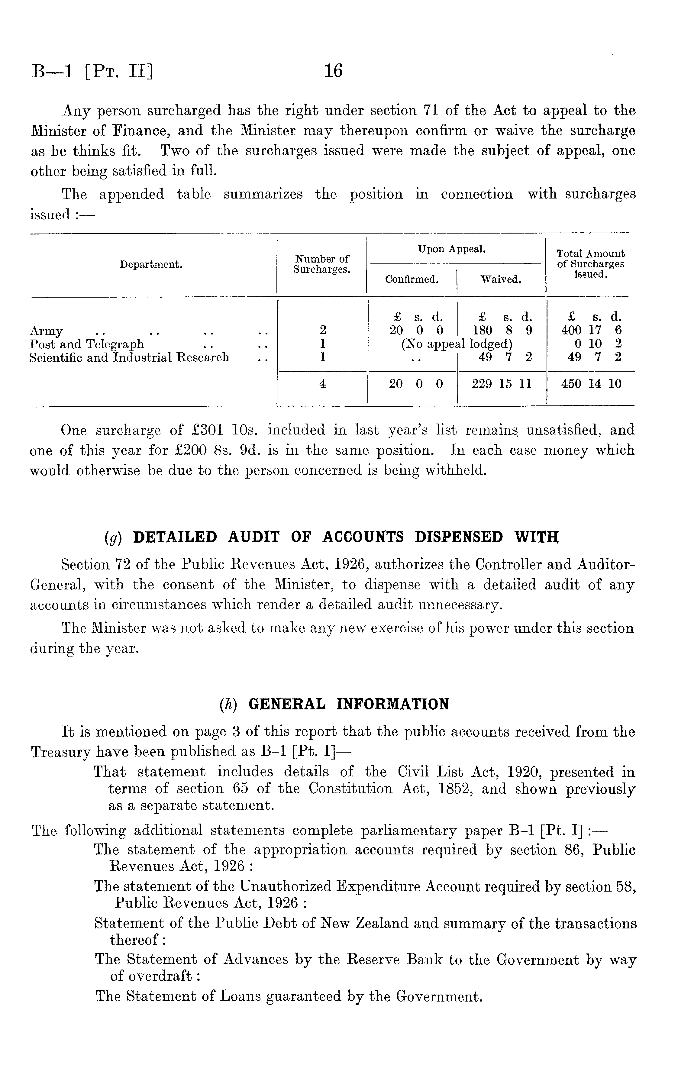 One surcharge of £3Ol 10s. included in last year's list remains unsatisfied, and one of this year for £2OO Bs. 9d. is in the same position. In each case money which would otherwise be due to the person concerned is being withheld. (g) DETAILED AUDIT OF ACCOUNTS DISPENSED WITH Section 72 of the Public Revenues Act, 1926, authorizes the Controller and AuditorGeneral, with the consent of the Minister, to dispense with a detailed audit of any accounts in circumstances which render a detailed audit unnecessary. The Minister was not asked to make any new exercise of his power under this section during the year. (h) GENERAL INFORMATION It is mentioned on page 3 of this report that the public accounts received from the Treasury have been published as B-l [Pt. I] — That statement includes details of the Civil List Aet, 1920, presented in terms of section 65 of the Constitution Act, 1852, and shown previously as a separate statement. The following additional statements complete parliamentary paper B-l [Pt. I]: — The statement of the appropriation accounts required by section 86, Public Revenues Act, 1926 : The statement of the Unauthorized Expenditure Account required by section 58, Public Revenues Act, 1926 : Statement of the Public Debt of New Zealand and summary of the transactions thereof; The Statement of Advances by the Reserve Bank to the Government by way of overdraft: The Statement of Loans guaranteed by the Government.
