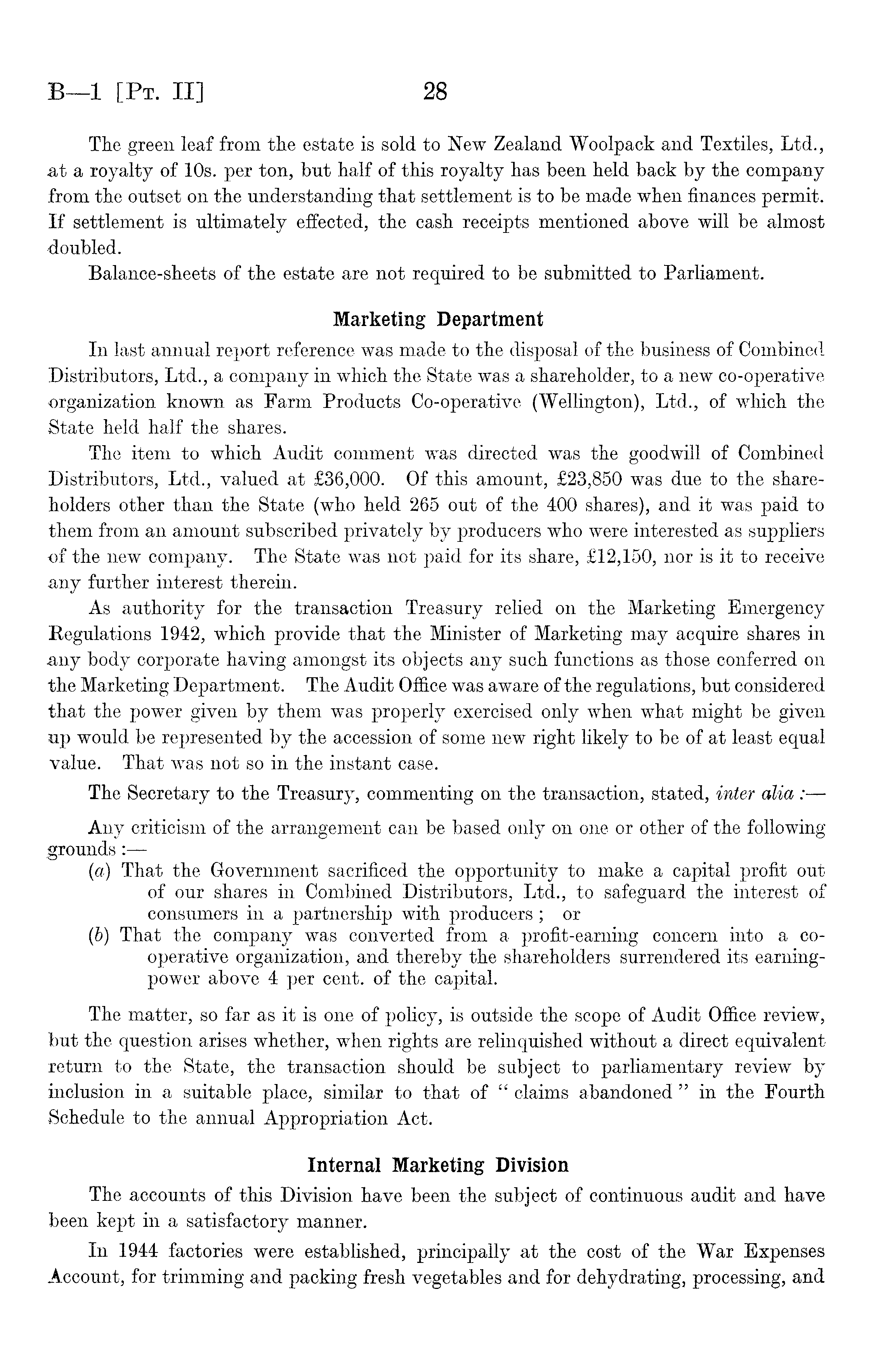 The green leaf from the estate is sold to New Zealand Woolpack and Textiles, Ltd., at a royalty of 10s. per ton, but half of this royalty has been held back by the company from the outset on the understanding that settlement is to be made when finances permit. If settlement is ultimately effected, the cash receipts mentioned above will be almost doubled. Balance-sheets of the estate are not required to be submitted to Parliament. Marketing Department In last annual report reference was made to the disposal of the business of Combined Distributors, Ltd., a company in which the State was a shareholder, to a new co-operative organization known as Farm Products Co-operative (Wellington), Ltd., of which the State held half the shares. The item to which Audit comment was directed was the goodwill of Combined Distributors, Ltd., valued at £36,000. Of this amount, £23,850 was due to the shareholders other than the State (who held 265 out of the 400 shares), and it was paid to them from an amount subscribed privately by producers who were interested as suppliers of the new company. The State was not paid for its share, £12,150, nor is it to receive any further interest therein. As authority for the transaction Treasury relied on the Marketing Emergency Eegulations 1942, which provide that the Minister of Marketing may acquire shares in any body corporate having amongst its objects any such functions as those conferred on the Marketing Department. The Audit Office was aware of the regulations, but considered that the power given by them was properly exercised only when what might be given up would be represented by the accession of some new right likely to be of at least equal value. That was not so in the instant case. The Secretary to the Treasury, commenting on the transaction, stated, inter alia : Any criticism of the arrangement can be based only on one or other of the following grounds: — (a) That the Government sacrificed the opportunity to make a capital profit out of our shares in Combined Distributors, Ltd., to safeguard the interest of consumers in a partnership with producers ; or (b) That the company was converted from a profit-earning concern into a cooperative organization, and thereby the shareholders surrendered its earningpower above 4 per cent, of the capital. The matter, so far as it is one of policy, is outside the scope of Audit Office review, but the question arises whether, when rights are relinquished without a direct equivalent return to the State, the transaction should be subject to parliamentary review by inclusion in a suitable place, similar to that of " claims abandoned " in the Fourth Schedule to the annual Appropriation Act. Internal Marketing Division The accounts of this Division have been the subject of continuous audit and have been kept in a satisfactory manner. In 1944 factories were established, principally at the cost of the War Expenses Account, for trimming and packing fresh vegetables and for dehydrating, processing, and