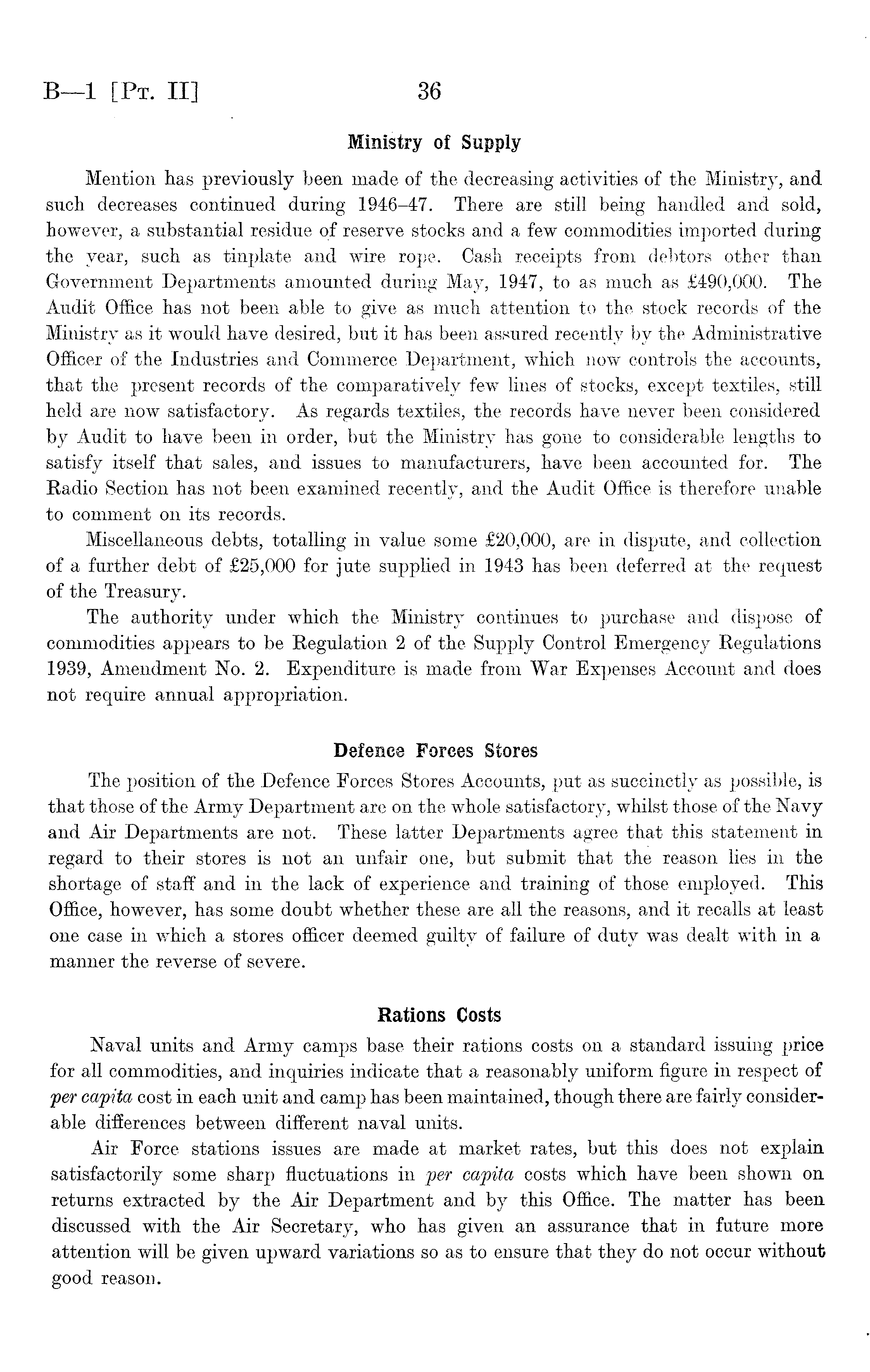 Ministry of Supply Mention lias previously been made of the decreasing activities of the Ministry, and such decreases continued during 1946-47. There are still being handled and sold, however, a substantial residue of reserve stocks and a few commodities imported during the year, such as tinplate and wire rope. Cash receipts from debtors other than Government Departments amounted during May, 1947, to as much as £490,000. The Audit Office has not been able to give as much attention to the stock records of the Ministry as it would have desired, but it has been assured recently by the Administrative Officer of the Industries and Commerce Department, which now controls the accounts, that the present records of the comparatively few lines of stocks, except textiles, still held are now satisfactory. As regards textiles, the records have never been considered by Audit to have been in order, but the Ministry has gone to considerable lengths to satisfy itself that sales, and issues to manufacturers, have been accounted for. The Radio Section has not been examined recently, and the Audit Office is therefore unable to comment on its records. Miscellaneous debts, totalling in value some £20,000, are in dispute, and collection of a further debt of £25,000 for jute supplied in 1943 has been deferred at the request of the Treasury. The authority under which the Ministry continues to purchase and dispose of commodities appears to be Regulation 2 of the Supply Control Emergency Regulations 1939, Amendment No. 2. Expenditure is made from War Expenses Account and does not require annual appropriation. Defence Forces Stores The position of the Defence Forces Stores Accounts, put as succinctly as possible, is that those of the Army Department are on the whole satisfactory, whilst those of the Navy and Air Departments are not. These latter Departments agree that this statement in regard to their stores is not an unfair one, but submit that the reason lies in the shortage of staff and in the lack of experience and training of those employed. This Office, however, has some doubt whether these are all the reasons, and it recalls at least one case in which a stores officer deemed guilty of failure of duty was dealt with in a manner the reverse of severe. Rations Costs Naval units and Army camps base their rations costs on a standard issuing price for all commodities, and inquiries indicate that a reasonably uniform figure in respect of per capita cost in each unit and camp has been maintained, though there are fairly considerable differences between different naval units. Air Force stations issues are made at market rates, but this does not explain, satisfactorily some sharp fluctuations in per capita costs which have been shown on returns extracted by the Air Department and by this Office. The matter has been discussed with the Air Secretary, who has given an assurance that in future more attention will be given upward variations so as to ensure that they do not occur without good reason.