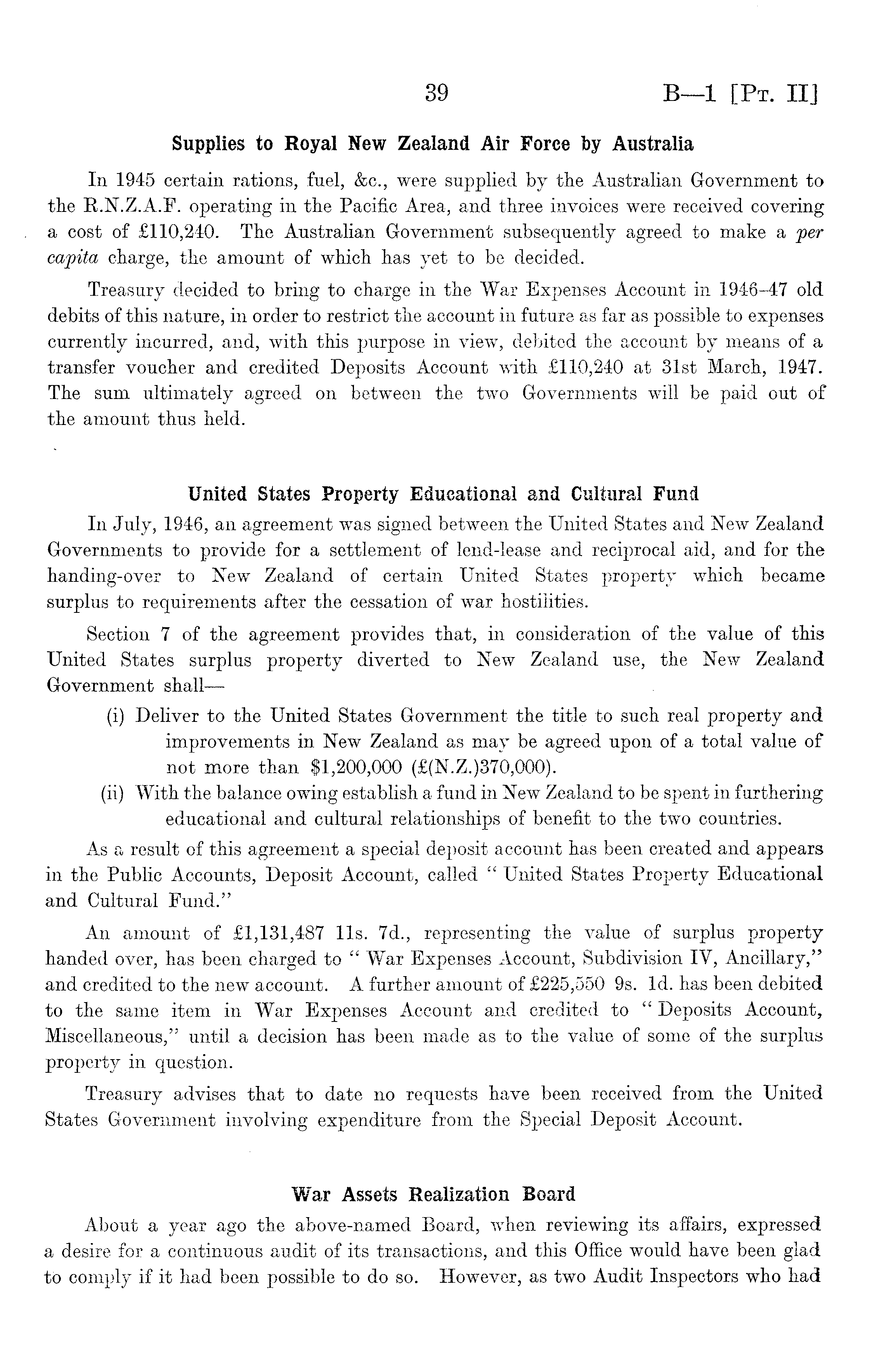 Supplies to Royal New Zealand Air Force by Australia In 1945 certain rations, fuel, &c., were supplied by the Australian Government to the R.N.Z.A.F. operating in the Pacific Area, and three invoices were received covering a cost of £110,240. The Australian Government subsequently agreed to make a per capita charge, the amount of which has yet to be decided. Treasury decided to bring to charge in the War Expenses Account in 1946-47 old debits of this nature, in order to restrict the account in future as far as possible to expenses currently incurred, and, with this purpose in view, debited the account by means of a transfer voucher and credited Deposits Account with £110,240 at 31st March, 1947. The sum ultimately agreed on between the two Governments will be paid out of the amount thus held. United States Property Educational and Cultural Fund In July, 1946, an agreement was signed between the United States and New Zealand Governments to provide for a settlement of lend-lease and reciprocal aid, and for the handing-over to New Zealand of certain United States property which became surplus to requirements after the cessation of war hostilities. Section 7 of the agreement provides that, in consideration of the value of this United States surplus property diverted to New Zealand use, the New Zealand Government shall — (i) Deliver to the United States Government the title to such real property and improvements in New Zealand as may be agreed upon of a total value of not more than $1,200,000 (£(N.Z.)370,000). (ii) With the balance owing establish a fund in New Zealand to be spent in furthering educational and cultural relationships of benefit to the two countries. As a result of this agreement a special deposit account has been created and appears in the Public Accounts, Deposit Account, called " United States Property Educational and Cultural Fund." An amount of £1,131,487 lis. 7d., representing the value of surplus property handed over, has been charged to " War Expenses Account, Subdivision IV, Ancillary," and credited to the new account. A further amount of £225,550 9s. Id. hap been debited to the same item in War Expenses Account and credited to " Deposits Account, Miscellaneous," until a decision has been made as to the value of some of the surplus property in question. Treasury advises that to date no requests have been received from the United States Government involving expenditure from the Special Deposit Account. War Assets Realization Board About a year ago the above-named Board, when reviewing its affairs, expressed a desire for a continuous audit of its transactions, and this Office would have been glad to comply if it had been possible to do so. However, as two Audit Inspectors who had