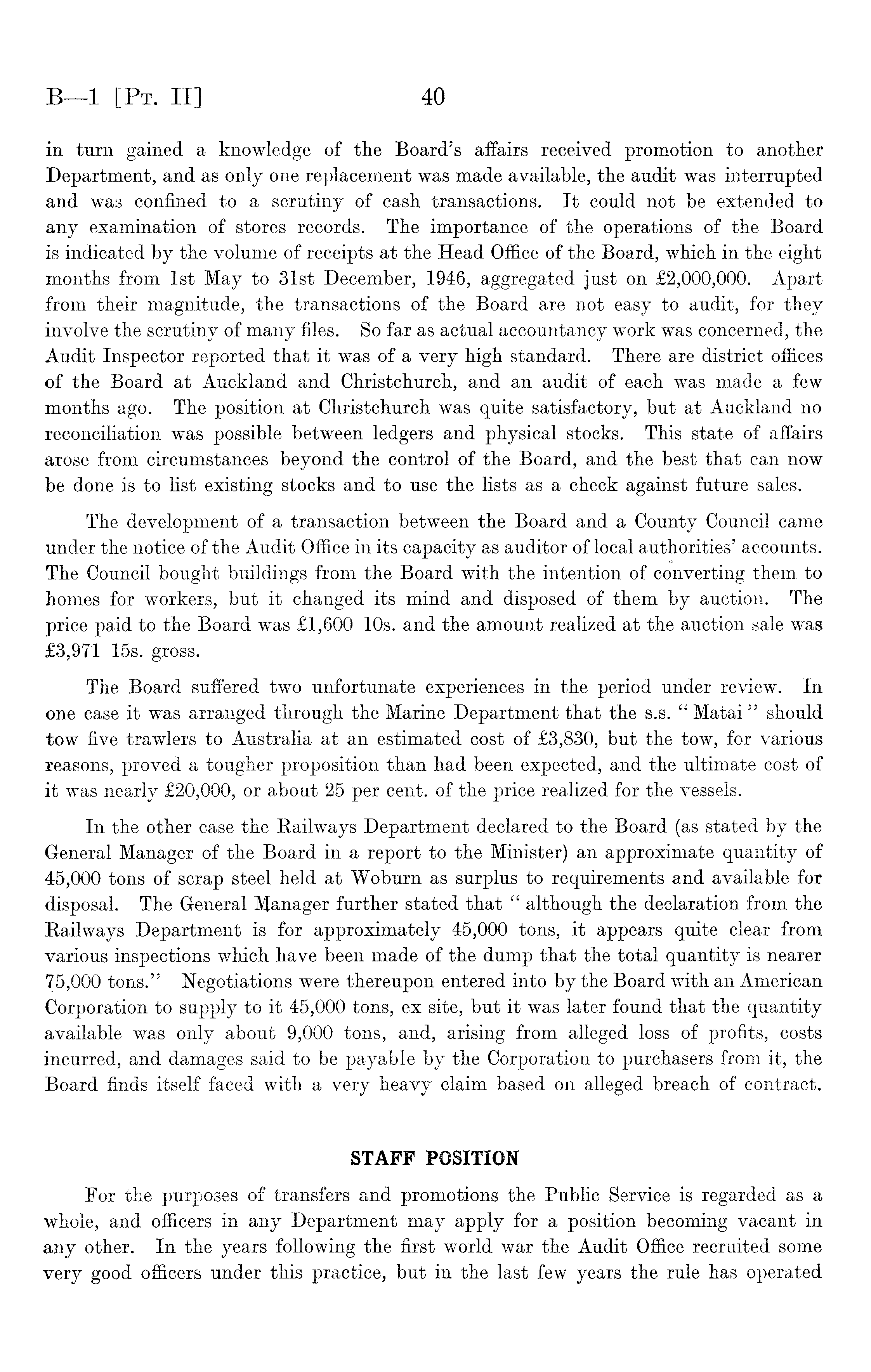 in turn gained a knowledge of the Board's affairs received promotion to another Department, and as only one replacement was made available, the audit was interrupted and was confined to a scrutiny of cash transactions. It could not be extended to any examination of stores records. The importance of the operations of the Board is indicated by the volume of receipts at the Head Office of the Board, which in the eight months from Ist May to 31st December, 1946, aggregated just on £2,000,000. Apart from their magnitude, the transactions of the Board are not easy to audit, for they involve the scrutiny of many files. So far as actual accountancy work was concerned, the Audit Inspector reported that it was of a very high standard. There are district offices of the Board at Auckland and Christchurch, and an audit of each was made a few months ago. The position at Christchurch was quite satisfactory, but at Auckland no reconciliation was possible between ledgers and physical stocks. This state of affairs arose from circumstances beyond the control of the Board, and the best that can now be done is to list existing stocks and to use the lists as a check against future sales. The development of a transaction between the Board and a County Council came under the notice of the Audit Office in its capacity as auditor of local authorities' accounts. The Council bought buildings from the Board with the intention of converting them to homes for workers, but it changed its mind and disposed of them by auction. The price paid to the Board was £1,600 10s. and the amount realized at the auction sale was £3,971 15s. gross. The Board suffered two unfortunate experiences in the period under review. In one case it was arranged through the Marine Department that the s.s. " Matai" should tow five trawlers to Australia at an estimated cost of £3,830, but the tow, for various reasons, proved a tougher proposition than had been expected, and the ultimate cost of it was nearly £20,000, or about 25 per cent, of the price realized for the vessels. In the other case the Railways Department declared to the Board (as stated by the General Manager of the Board in a report to the Minister) an approximate quantity of 45,000 tons of scrap steel held at Woburn as surplus to requirements and available for disposal. The General Manager further stated that " although the declaration from the Railways Department is for approximately 45,000 tons, it appears quite clear from various inspections which have been made of the dump that the total quantity is nearer 75,000 tons." Negotiations were thereupon entered into by the Board with an American Corporation to supply to it 45,000 tons, ex site, but it was later found that the quantity available was only about 9,000 tons, and, arising from alleged loss of profits, costs incurred, and damages said to be payable by the Corporation to purchasers from it, the Board finds itself faced with a very heavy claim based on alleged breach of contract. STAFF POSITION For the purposes of transfers and promotions the Public Service is regarded as a whole, and officers in any Department may apply for a position becoming vacant in any other. In the years following the first world war the Audit Office recruited some very good officers under this practice, but in the last few years the rule has operated