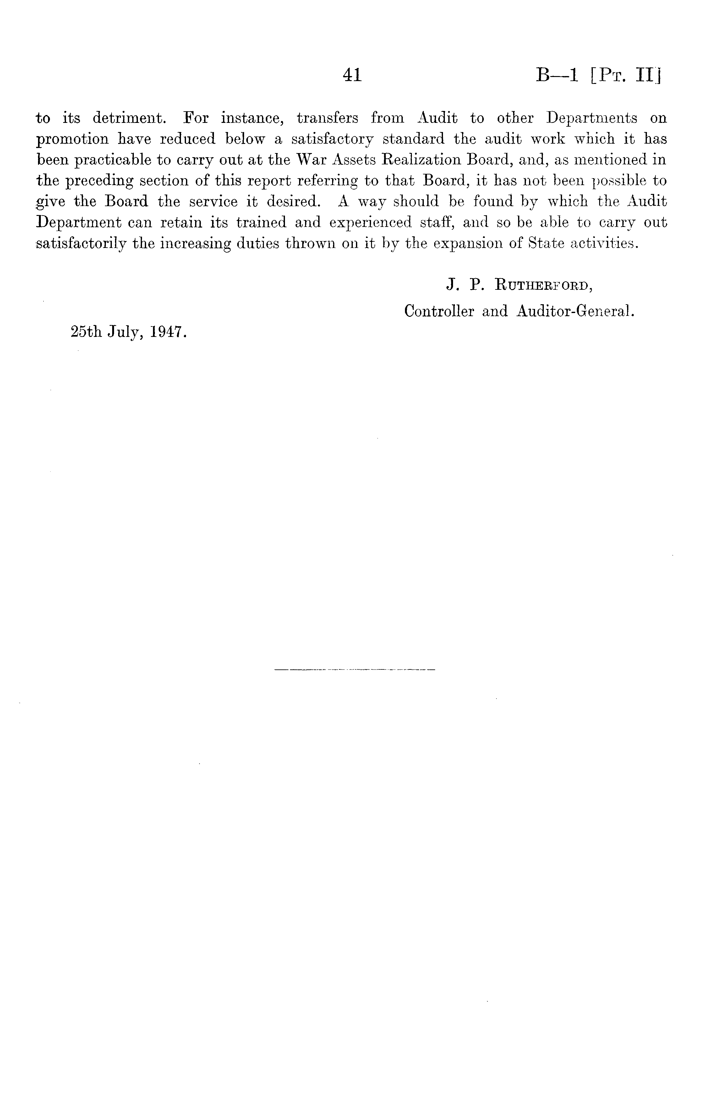 to its detriment. For instance, transfers from Audit to other Departments on promotion have reduced below a satisfactory standard the audit work which it has been practicable to carry out at the War Assets Realization Board, and, as mentioned in the preceding section of this report referring to that Board, it has not been possible to give the Board the service it desired. A way should be found by which the Audit Department can retain its trained and experienced staff, and so be able to carry out satisfactorily the increasing duties thrown on it by the expansion of State activities.
