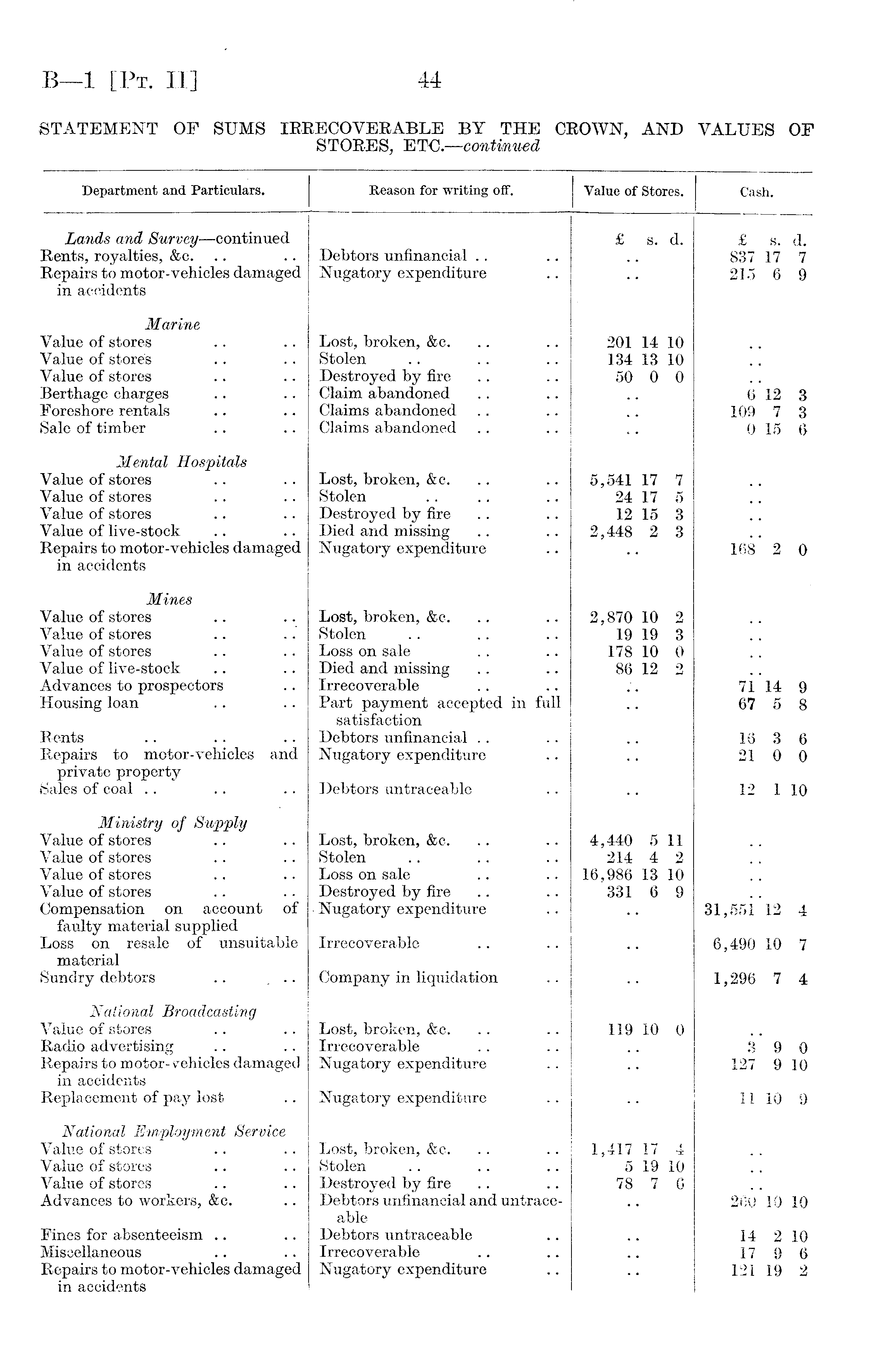 Department and Particulars. Reason for writing off. Value of Stores. Cash. Lands and Survey—continued £ s. d. £ s. d. Rents, royalties, &c. Debtors unfinancial 837 17 7 Repairs to motor-vehicles damaged Nugatory expenditure 215 6 9 in accidents Marine Value of stores Lost, broken, &c. 201 14 10 Value of stores Stolen 134 13 10 Value of stores Destroyed by fire 50 0 0 Berthage charges Claim abandoned 6 12 3 Foreshore rentals Claims abandoned .. 109 7 3 Sale of timber Claims abandoned 0 15 6 Mental Hospitals Value of stores Lost, broken, &c. 5,541 17 7 Value of stores Stolen 24 17 5 Value of stores Destroyed by fire 12 15 3 Value of live-stock Died and missing 2,448 2 3 Repairs to motor-vehicles damaged Nugatory expenditure 168 2 0 in accidents Mines Value of stores Lost, broken, &c. 2,870 10 2 Value of stores Stolen 19 19 3 Value of stores Loss on sale 178 10 0 Value of live-stock Died and missing 86 12 2 Advances to prospectors Irrecoverable 7i 14 9 Housing loan Part payment accepted in full 67 5 8 satisfaction Rents Debtors unfinancial 16 3 6 Repairs to motor-vehicles and Nugatory expenditure 21 0 0 private property Sales of coal Debtors untraceable 12 1 10 Ministry of Supply Value of stores Lost, broken, &c. 4,440 5 11 Value of stores Stolen 214 4 2 Value of stores Loss on sale 16,986 13 10 Value of stores Destroyed by fire 331 6 9 Compensation on account of • Nugatory expenditure 31,55i 12 4 faulty material supplied Loss on resale of unsuitable Irrecoverable 6,490 10 7 material Sundry debtors .. ... Company in liquidation 1,296 7 4 National Broadcasting Value of stores Lost, broken, &c. 119 10 0 Radio advertising Irrecoverable 3* 9 0 Repairs to motor-vehicles damaged Nugatory expenditure 127 9 10 in accidents Replacement of pay lost Nugatory expenditure 11 10 9 National Employment Service Value of stores Lost, broken, &c. 1,417 17 4 Value of stores Stolen 5 19 10 Value of stores Destroyed by fire 78 7 6 Advances to workers, &c. Debtors unfinancial and untrace260 10 10 able Fines for absenteeism Debtors untraceable 14 2 10 Miscellaneous Irrecoverable 17 9 6 Repairs to motor-vehicles damaged Nugatory expenditure 121 19 2 in accidents