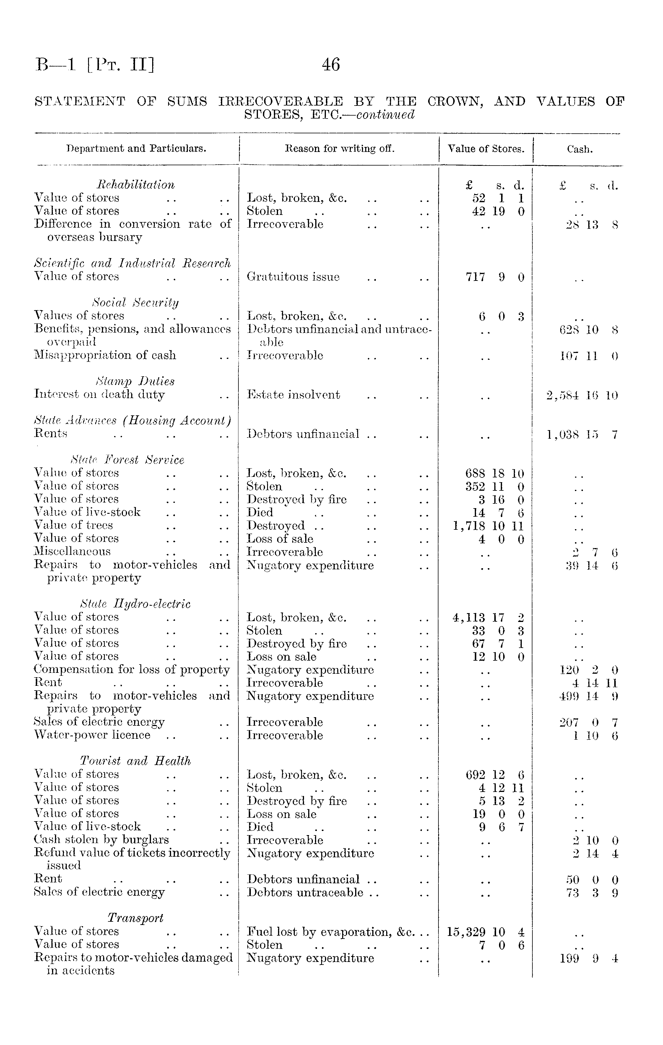 Department and Particulars. Reason for writing oft. Value of Stores. Cash. Rehabilitation £ S. d. £ s. d. Value of stores Lost, broken, &c. 52 1 1 Value of stores Stolen 42 19 0 Difference in conversion rate of Irrecoverable 2813 8 overseas bursary Scientific and Industrial Research, Value of stores Gratuitous issue 717 9 0 Social Security Values of stores Lost, broken, &c. 6 0 3 Benefits, pensions, and allowances Debtors unfinancial and untrace628*10 8 overpaid able Misappropriation of cash Irrecoverable 107 11 0 Stamp Duties Interest on death duty Estate insolvent 2,584 16 10 State Advances (Housing Account) Rents Debtors unfinancial 1,038 15 7 State Forest Service Value of stores Lost, broken, &c. 688 18 10 Value of stores Stolen 352 11 0 Value of stores Destroyed by fire 3 16 0 Value of live-stock Died 14 7 6 Value of trees Destroyed 1,718 10 11 Value of stores Loss of sale 4 0 0 Miscellaneous Irrecoverable 2 7 6 Repairs to motor-vehicles and Nugatory expenditure 39 14 6 private property State Hydro-electric Value of stores Lost, broken, &c. 4,113 17 2 Value of stores Stolen 33 0 3 Value of stores Destroyed by fire 67 7 1 Value of stores Loss on sale 12 10 0 Compensation for loss of property Nugatory expenditure 120 2 0 Rent Irrecoverable 4 14 11 Repairs to motor-vehicles and Nugatory expenditure 499 14 9 private property Sales of electric energy Irrecoverable 207 0 7 Water-power licence Irrecoverable 1 10 6 Tourist and Health Value of stores Lost, broken, &c. 692 12 6 Value of stores Stolen 4 12 11 Value of stores Destroyed by fire 5 13 2 Value of stores Loss on sale 19 0 0 Value of live-stock Died .. 9 6 7 Cash stolen by burglars Irrecoverable 2 10 0 Refund value of tickets incorrectly issnftH Nugatory expenditure 2 14 4 J.QO UvU. Rent Debtors unfinancial 50 0 0 Sales of electric energy Debtors untraceable 73 3 9 Transport Value of stores Fuel lost by evaporation, &c. .. 15,329 10 4 Value of stores Stolen 7 0 6 Repairs to motor-vehicles damaged Nugatory expenditure 199 9 4 in accidents