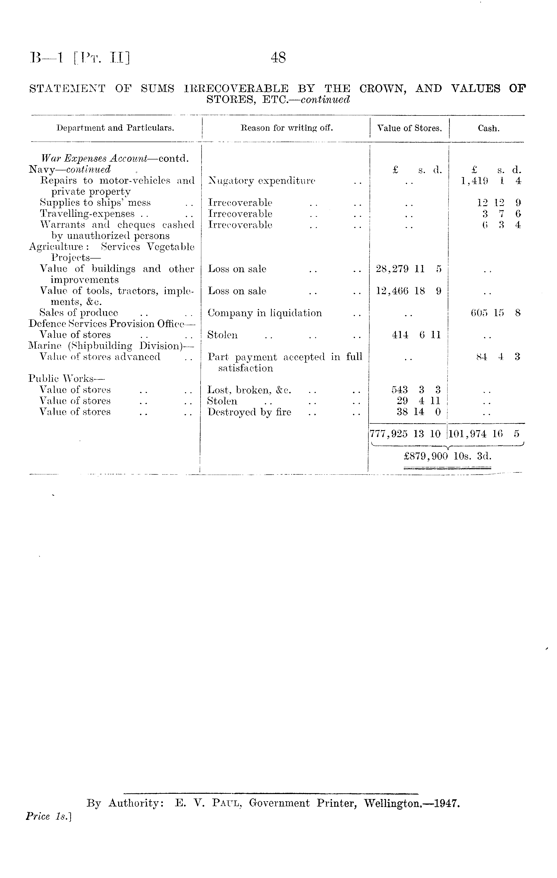 Department and Particulars. Reason for writing off. "Value of Stores. Cash. War Expenses Account —eontd. Navy—continued £ s. d. £ s. d. Repairs to motor-vehicles and Nugatory expenditure 1,419 1 4 private property Supplies to ships' mess Irrecoverable 12 12 9 Travelling-expenses Irrecoverable 3 7 6 Warrants and cheques cashed Irrecoverable 6 3 4 by unauthorized persons Agriculture: Services Vegetable ProjectsValue of buildings and other Loss on sale 28,279 11 5 improvements Value of tools, tractors, impleLoss on sale 12,466 18 9 ments, &c. Sales of produce Company in liquidation 605 15 8 Defence Services Provision Office— Value of stores Stolen 414 6 11 Marine (Shipbuilding Division) — Value of stores advanced Part payment accepted in full 00 satisfaction Public Works — Value of stores Lost, broken, &c. 543 3 3 Value of stores Stolen 29 4 11 Value of stores Destroyed by fire 38 14 0 777,925 13 10 101,974 16 5 J £879,900 CO o
