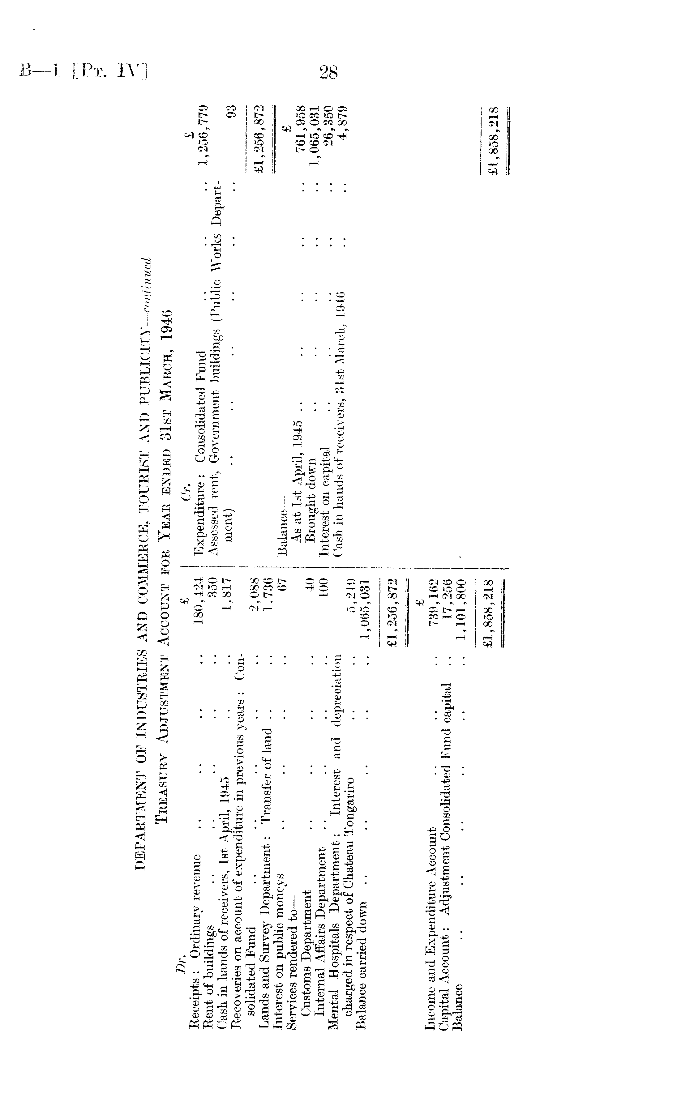 DEPARTMENT OF INDUSTRIES AND COMMERCE, TOURIST AND PUBLICITY— continued Treasury Adjustment Account for Year ended 31st March, 1946 Df. £ ~ Receipts : Ordinary revenue 180,424 Expenditure: Consolidated Fund 1 256 779 rw? in Wif? • " i+ A "■! ,n«" " 350 Assessed rent > Government buildings (Public Works DepartCasn in bands of receivers, Ist April, 1945 .. .. 1,817 ment) .... oq Recoveries on account of expenditure in previous vears: Con- '' '' ' ' " '' solidated Fund .. .. .. " .. .. 2,088 £1 S7? Lands and Survey Department : Transfer of land .. ..1,736 ' ' Interest on public moneys . . .. .. .. 67 Balance— £ Services rendered to- As at Ist April, 1945 761 958 Customs Department 40 Brought down .. ! loesloSl Internal Affairs Department .. .. .. .. 100 Interest on capital .. .. .. . 26 350 Mental Hospitals Department: Interest and depreciation Cash in hands of receivers, 31st March, 1946 " 4'879 charged m respect of Chateau Tongariro .. .. 5,219 " " Balance carried down .. .. .. .. 1,065 031 £1,256,872 £ Income and Expenditure Account .. .. .. 739,162 Capital Account: Adjustment Consolidated Fund capital .. 17,'256 Balance .. .. .. .. .. .. 1,101,800 ■ £h^2lB