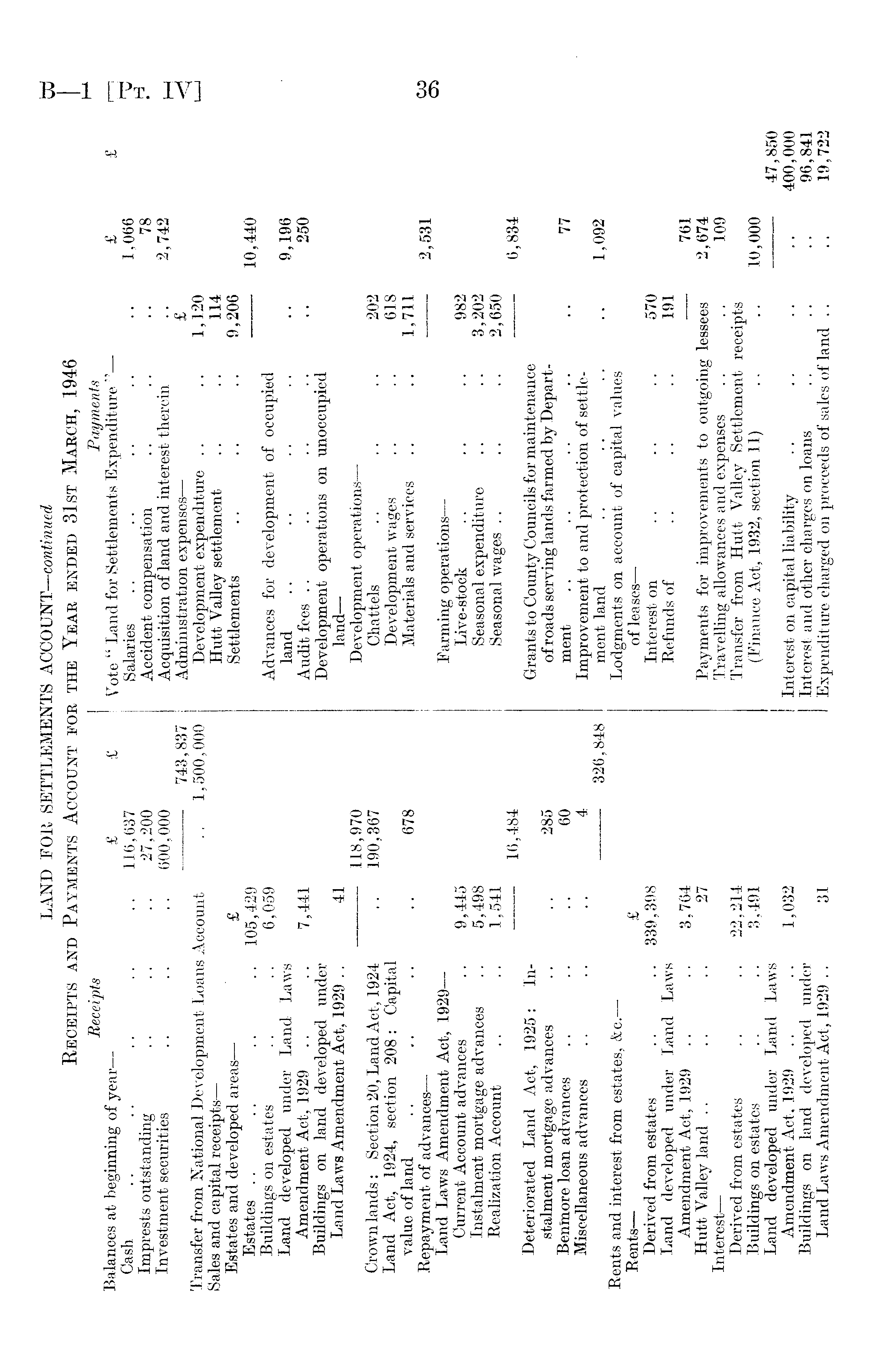 LAND FOE SETTLEMENTS ACCOUNT— continued Receipts and Payments Account for the Year ended 31st March, 1946 Receipts Payments Balances at beginning of year— £ £ Vote" Land for Settlements Expenditure"— £ £ Cash .. .. .. .. .. 116,637 Salaries .. .. .. .. .. 1,066 Imprests outstanding .. .. .. 27,200 Accident compensation .. .. .. 78 Investment securities .. .. .. 600,000 Acquisition of land and interest therein .. 2,742 743,837 : Administration expenses— £ Transfer from National Development Loans Account 1,500,000 Development expenditure .. .. 1,120 Sales and capital receipts— Hutt Valley settlement .. .. 114 Estates and developed areas— £ Settlements .. .. .. 9,206 Estates .. .. .. .. 105,429 10,440 Buildings on estates .. .. 6,059 Advances for development of occupied Land developed under Land Laws land .. .. .. .. .. 9,196 Amendment Act, 1929 .. .. 7,441 Audit fees .. .. .. .. .. 250 Buildings on land developed under Development operations on unoccupied Land Laws Amendment Act, 1929 .. 41 land— 118,970 Development operations— Crown lands: Section 20, Land Act, 1924 .. 190,367 Chattels .. .. .. 202 Land Act, 1924, section 208: Capital Development wages .. .. 618 value of land .. ... .. .. 678 Materials and services .. .. 1,711 Repayment of advances— 2,531 Land Laws Amendment Act, 1929— Farming operations— Current Account advances .. 9,445 Live-stock .. .. .. 982 Instalment mortgage advances .. 5,498 Seasonal expenditure .. .. 3,202 Realization Account .. .. 1,541 Seasonal wages .. .. .. 2,650 16,484 6,834 Deteriorated Land Act, 1925 : In- Grants to County Councils for maintenance stalment mortgage advances .. .. 285 of roads serving lands farmed by DepartBenmore loan advances .. . . . . 60 ment .. .. .. .. .. 77 Miscellaneous advances .. .. .. 4 Improvement to and protection of settle326,848 ment land .. .. .. .. 1,092 Rents and interest from estates, &c.— Lodgments on account of capital values Rents— £ of leases— Derived from estates .. .. 339, 398 Interest on .. .. . . 570 Land developed under Land Laws Refunds of .. .. .. 191 Amendment Act, 1929 .. .. 3,764 761 Hutt Valley land .. .. .. 27 Payments for improvements to outgoing lessees 2,674 Interest— Travelling allowances and expenses .. .. 109 Derived from estates .. .. 22,214- Transfer from Hutt Valley Settlement receipts Buildings on estates .. .. 3,491 (Finance Act, 1932, section 11) .. .. 10,000 Land developed under Land Laws 47,850 Amendment Act, 1929 .. .. 1,032 Interest on capital liability .. .. .. .. 400,000 Buildings on land developed under Interest and other charges on loans . . . . . . 96,841 Land Laws Amendment Act, 1929 .. 31 Expenditure charged on proceeds of sales of land . . .. 19,722