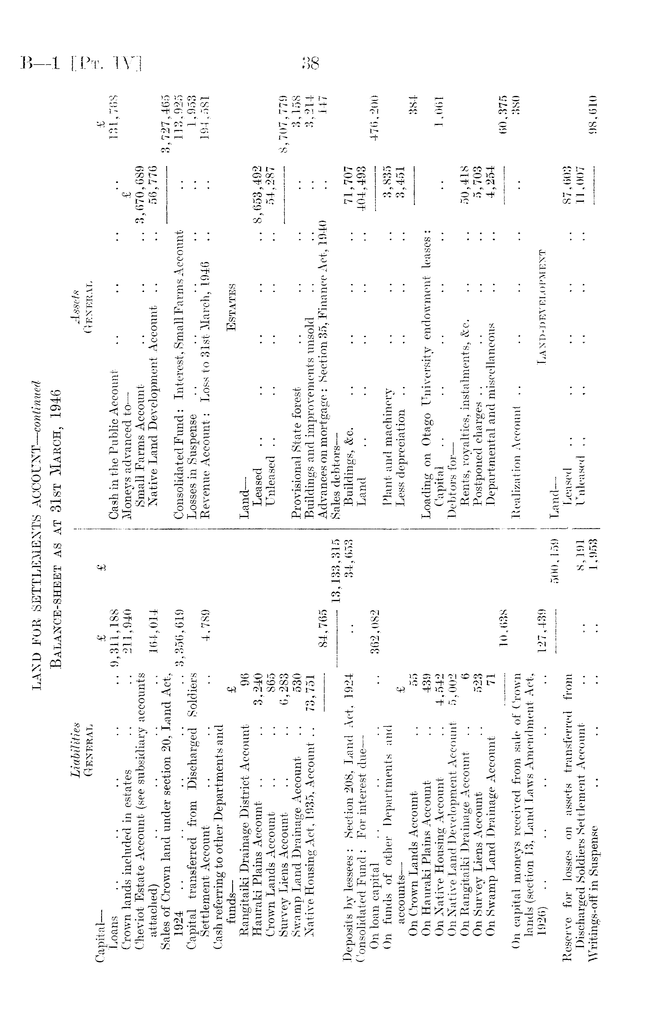 LAND FOR SETTLEMENTS ACCOUNT— continued Balance-sheet as at 31st March, 1946 Liabilities Assets General General Capital— £ £ £ Loans .. .. .. .. .. 9,311,188 Cash in the Public Account .. .. .. .. 131,788 Crown lands included in estates .. .. 211,940 Moneys advanced to— £ Cheviot Estate Account (see subsidiary accounts Small Farms Account .. .. .. 3,670,689 attached) .. .. .. .. 164,014 Native Land Development Account .. .. 56,776 Sales of Crown land under section 20, Land Act, 3,727,465 1924 .. .. .. .. .. 3,356,619 Consolidated Fund: Interest, Small Farms Account .. 113,925 Capital transferred from Discharged Soldiers Losses in Suspense .. .. .. .. .. 1,953 Settlement Account .. .. .. 4,789 Revenue Account: Loss to 31st March, 1946 .. .. 194,581 Cash referring to other Departments and funds— £ Estates Rangitaiki Drainage District Account 96 Land— Hauraki Plains Account .. .. 3,240 Leased .. .. .. .. .. 8,653, 492 Crown Lands Account .. .. 865 Unleased .. .. .. .. .. 54,287 Survey Liens Account .. .. 6,283 8,707,779 Swamp Land Drainage Account .. 530 Provisional State forest .. .. .. .. 3,158 Native Housing Act, 1935, Account .. 73,751 Buildings and improvements unsold .. .. .. 3,214 84,765 Advances on mortgage: Section 35, Finance Act, 1940 .. 147 13,133,315 Sales debtors— Deposits by lessees: Section 208, Land Act, 1924 .. 34,653 Buildings, &c. .. .. .. .. 71,707 Consolidated Fund: For interest due— Land .. .. .. .. .. 404,493 On loan capital .. .. .. .. 362,082 476,200 On funds of other Departments and Plant and machinery .. .. .. 3,835 accounts— £ Less depreciation .. .. .. .. 3,451 On Crown Lands Account .. 55 384 On Hauraki Plains Account .. 439 Loading on Otago University endowment leases: On Native Housing Account .. 4,542 Capital .. .. .. .. .. .. 1,061 On Native Land Development Account 5,002 Debtors for— On Rangitaiki Drainage Account . . 6 Rents, royalties, instalments, &c. .. .. 50,418 On Survey Liens Account .. 523 Postponed charges .. .. .. .. 5,703 On Swamp Land Drainage Account 71 Departmental and miscellaneous .. .. 4,254 10,638 60,375 On capital moneys received from sale of Crown Realization Account .. .. .. .. .. 380 lands (section 13, Land Laws Amendment Act, 1926) .. .. .. .. .. 127,439 Land-development 500,159 Land— Reserve for losses on assets transferred from Leased .. .. .. .. .. 87,603 Discharged Soldiers Settlement Account . . .. 8,191 Unleased .. ~ ~ .. .. 11,007 Writings-off in Suspense .. .. ~ ~ 1,953 98,610