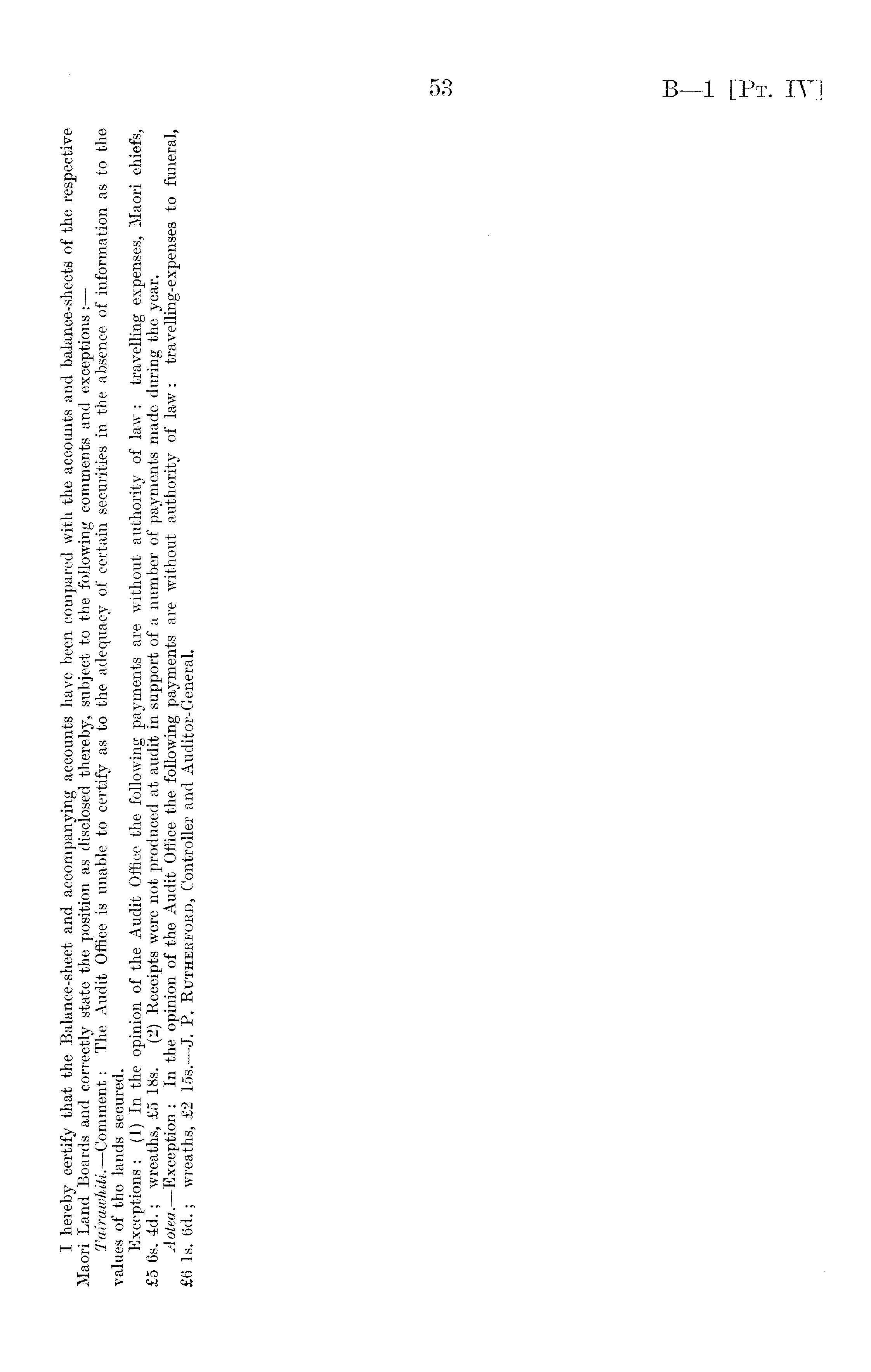 I hereby certify that the Balance-sheet and accompanying accounts have been compared with the accounts and balance-sheets of the respective Maori Land Boards and correctly state the position as disclosed thereby, subject to the following comments and exceptions : Tairawhiti.—Comment: The Audit Office is unable to certify as to the adequacy of certain securities in the absence of information as to the values of the lands secured. Exceptions : (1) In the opinion of the Audit Office the following payments are without authority of law : travelling expenses, Maori chiefs, £5 6s. 4d.; wreaths, £5 18s. (2) Receipts were not produced at audit in support of a number of payments made during the year. Aotea.—Exception : In the opinion of the Audit Office the following payments are without authority of law : travelling-expenses to funeral, £6 Is. 6d.; wreaths, £2 15s.— J. P. Rutherford, Controller and Auditor- General.