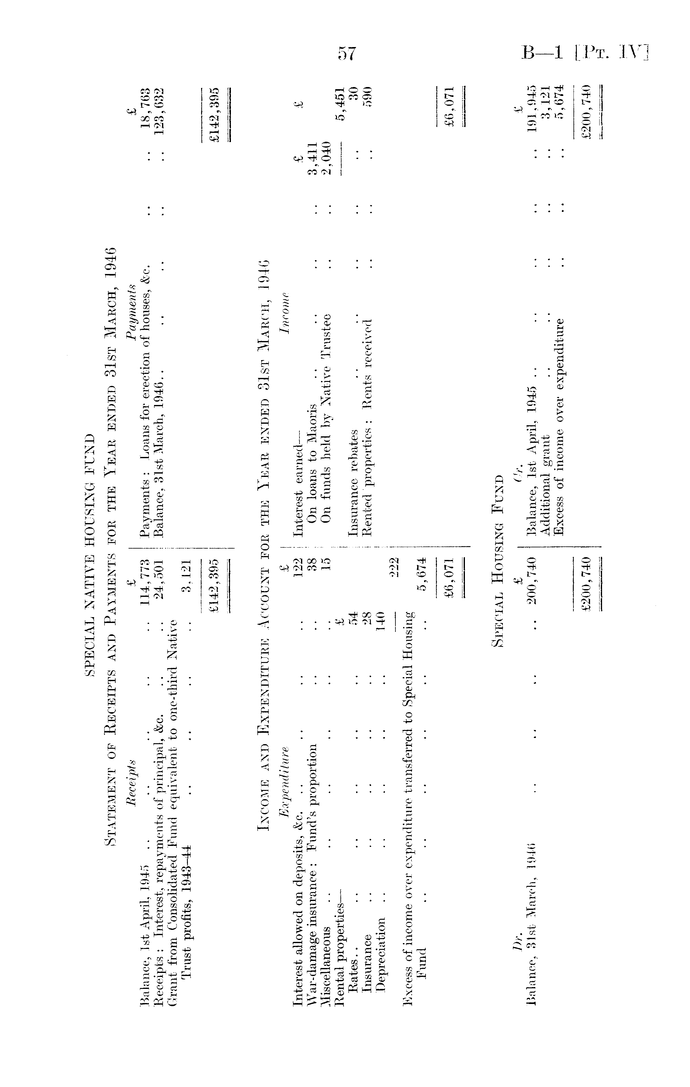 SPECIAL NATIVE HOUSING FUND Statement op Receipts and Payments for the Year ended 31st March, 1946 Receipts £ Payments £ Balance, Ist April, 1945 .. .. .. .. .. 114,773 Payments: Loans for erection of houses, &c. .. .. 18,763 Receipts: Interest, repayments of principal, &c. .. 24,501 Balance, 31st March, 1946.. .. .. .. .. 123,632 Grant from Consolidated Fund equivalent to one-third Native Trust profits, 1943-44 .. .. .. .. 3,121 £142,395 £142,395 Income and Expenditure Account for the Year ended 31st March, 1946 Expenditure £ | Income Interest allowed on deposits, &c. .. .. .. .. 122 Interest earned— £ £ War-damage insurance: Fund's proportion .. .. 38 On loans to Maoris .. .. .. .. 3,411 Miscellaneous .. .. .. .. .. .. 15 On funds held by Native Trustee .. .. 2,040 Rental properties— £ 5,451 Rates.. .. .. .. .. .. 54 Insurance rebates .. .. .. .. .. 30 Insurance .. .. .. .. .. 28 Rented properties : Rents received .. .. .. 590 Depreciation .. .. .. .. .. 140 222 Excess of income over expenditure transferred to Special Housing Fund .. .. .. .. .. .. 5,674 £6,071 £6,071 Special Housing Fund Dr. £ Or. £ Balance, 31st March, 1946 .. .. .. .. 200,740 Balance, Ist April, 1945 .. .. .. .. .. 191,945 Additional grant .. .. .. .. .. 3,121 Excess of income over expenditure .. .. .. 5,674 £200,740 £200,740