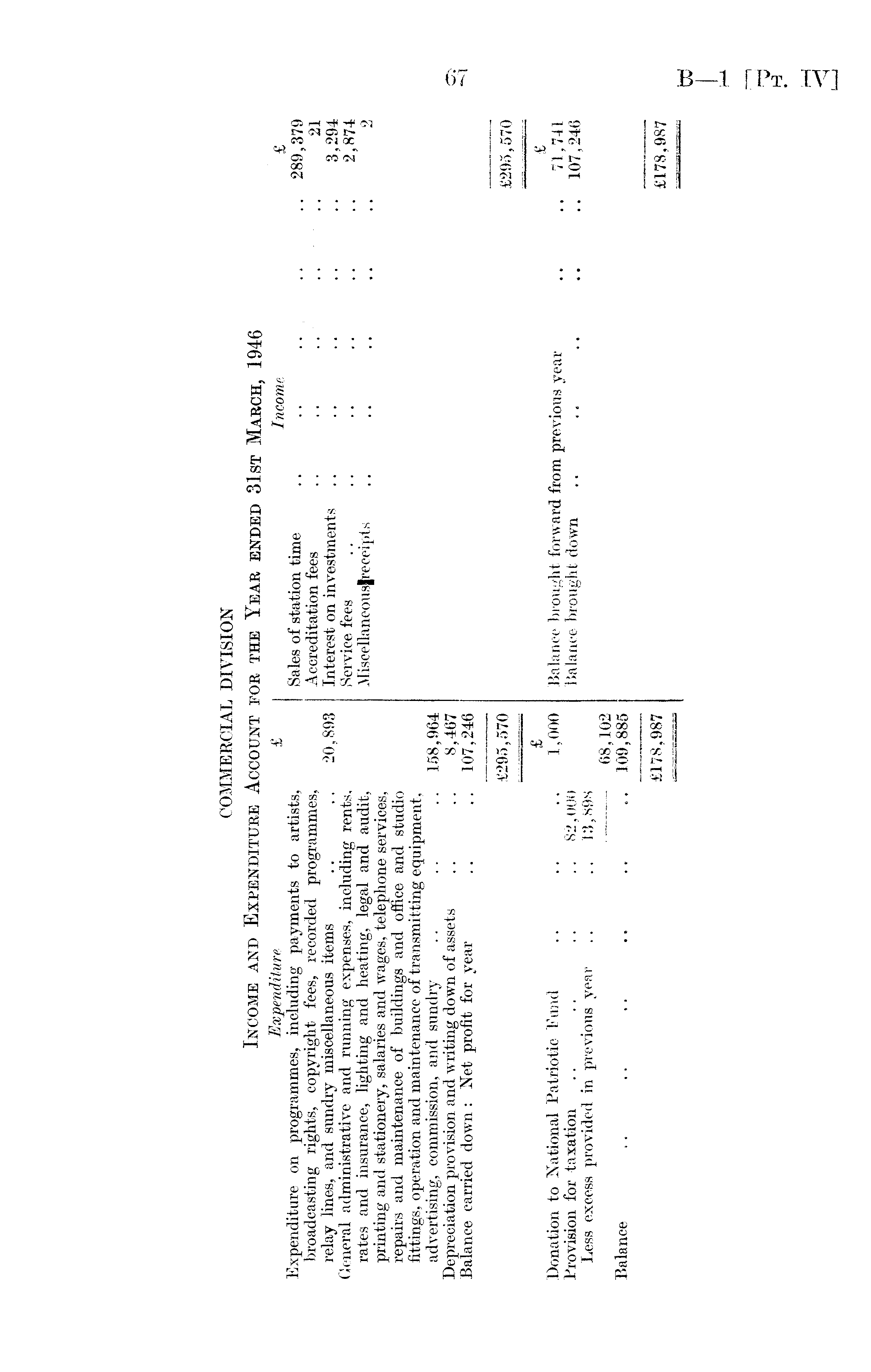 COMMERCIAL DIVISION Income and Expenditure Account for the Year ended 31st March, 1946 Expenditure £ Income £ Expenditure on programmes, including payments to artists, Sales of station time .. .. .. .. 289,379 broadcasting rights, copyright fees, recorded programmes, Accreditation fees .. .. .. .. 21 relay lines, and sundry miscellaneous items .. .. 20,893 Interest on investments .. .. .. .. . . 3,294 General administrative and running expenses, including rents, Service fees .. .. .. .. ■ ~ 2 874 rates and insurance, lighting and heating, legal and audit, Miscellaneous|receipts .. .. .. .. .' '2 printing and stationery, salaries and wages, telephone services, repairs and maintenance of buildings and office and studio fittings, operation and maintenance of transmitting equipment, advertising, commission, and sundry .. .. .. 158,964 Depreciation provision and writing down of assets .. .. 8,467 Balance carried down : Net profit for year .. .. 107, 246 £295,570 £295^570 . £ r~ Donation to National Patriotic Fund .. .. ~ 1,000 Balance brought forward from previous year .. .. 71,741 Provision for taxation .. .. .. .. 82,000 Balance brought down .. .. .. .. 107,246 Less excess provided in previous year .. .. j 3,898 68,102 Balance .. .. .. .. .. .. 109,885 £178,987 £178,987