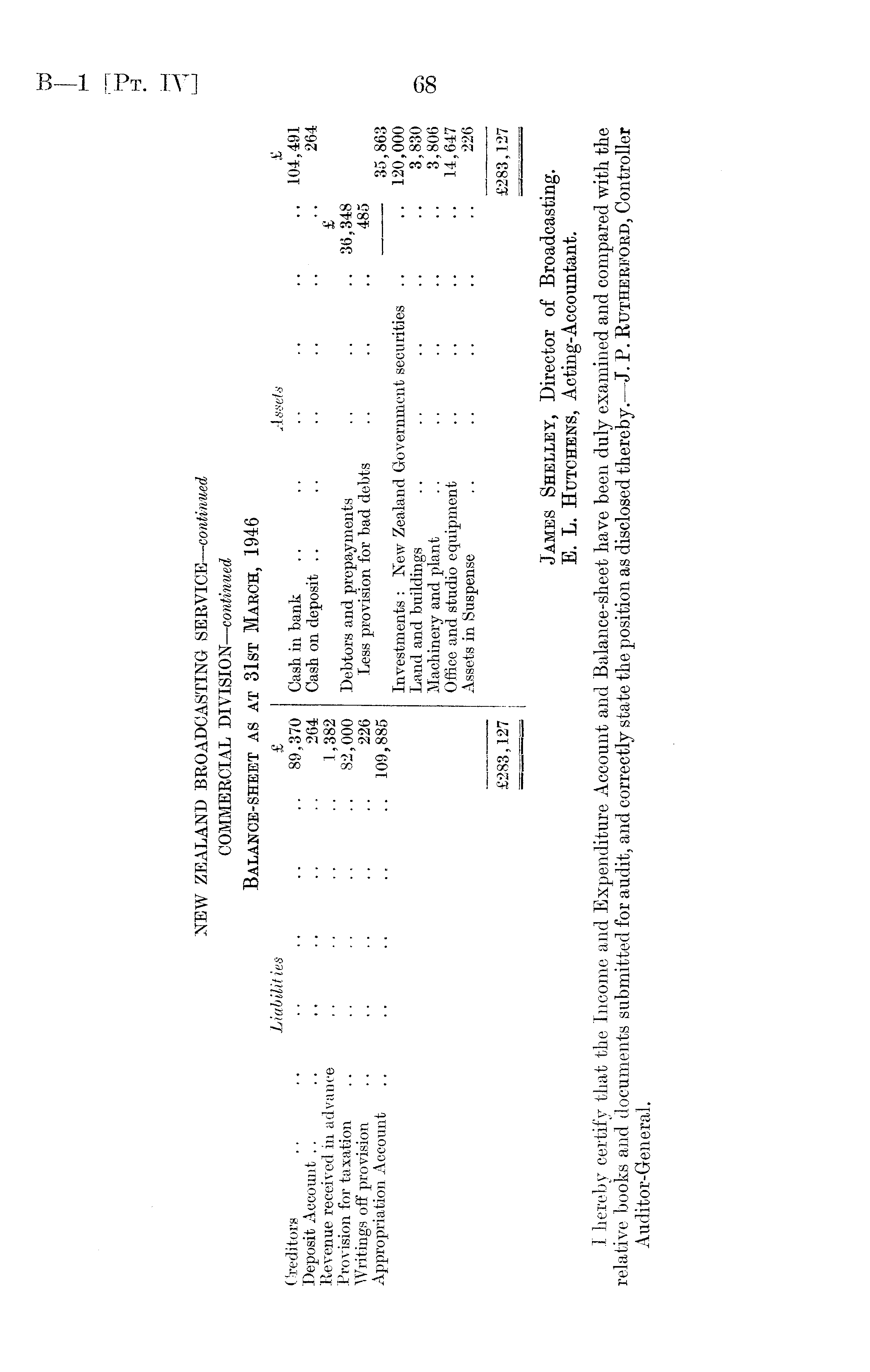 NEW ZEALAND BROADCASTING SERVICE— continued COMMERCIAL DIVISION— continued Balance-sheet as at 31st March, 1946 Liabilities £ Assets £ Creditors .. .. .. .. .. .. 89,370 Cash in bank .. .. .. .. .. .. 104,491 Deposit Account .. ~ ~ ~ ~ .. 264 Cash on deposit .. .. .. .. .. .. 264 Revenue received in advance . . . . .. .. 1,382 £ Provision for taxation .. .. .. .. .. 82,000 Debtors and prepayments .. .. .. 36,348 Writings off provision .. ~ .. .. .. 226 Less provision for bad debts .. .. .. 485 Appropriation Account .. .. .. ..109,885 35,863 Investments : New Zealand Government securities .. .. 120,000 Land and buildings .. .. .. .. .. 3,830 Machinery and plant .. .. .. .. .. 3,806 Office and studio equipment .. .. .. .. 14,647 Assets in Suspense .. .. .. .. .. 226 £283,127 £283,127 James Shelley, Director of Broadcasting. E. L. Hutchens, Acting-Accountant. I liereby certify that the Income and Expenditure Account and Balance-sheet have been duly examined and compared with the relative books and documents submitted for audit, and correctly state the position as disclosed thereby.— J. P. Rutherford, Controller Auditor-General.
