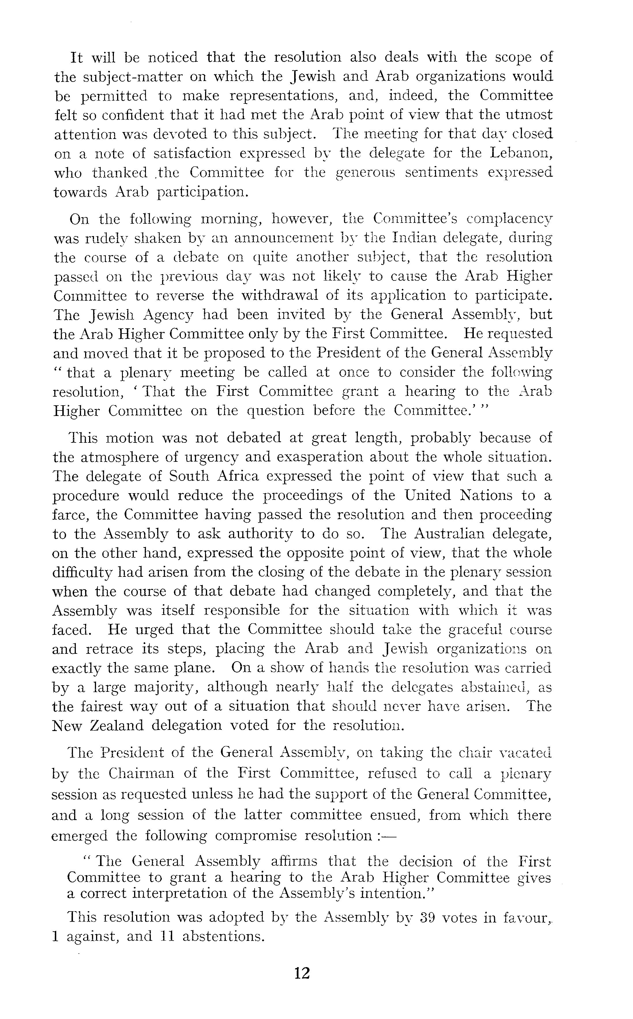 It will be noticed that the resolution also deals with the scope of the subject-matter on which the Jewish and Arab organizations would be permitted to make representations, and, indeed, the Committee felt so confident that it had met the Arab point of view that the utmost attention was devoted to this subject. The meeting for that day closed on a note of satisfaction expressed by the delegate for the Lebanon, who thanked .the Committee for the generous sentiments expressed towards Arab participation. On the following morning, however, the Committee's complacency was rudely shaken by an announcement by the Indian delegate, during the course of a debate on quite another subject, that the resolution passed on the previous day was not likely to cause the Arab Higher Committee to reverse the withdrawal of its application to participate. The Jewish Agency had been invited by the General Assembly, but the Arab Higher Committee only by the First Committee. He requested and moved that it be proposed to the President of the General Assembly " that a plenary meeting be called at once to consider the following resolution, ' That the First Committee grant a hearing to the Arab Higher Committee on the question before the Committee.' " This motion was not debated at great length, probably because of the atmosphere of urgency and exasperation about the whole situation. The delegate of South Africa expressed the point of view that such a procedure would reduce the proceedings of the United Nations to a farce, the Committee having passed the resolution and then proceeding to the Assembly to ask authority to do so. The Australian delegate, on the other hand, expressed the opposite point of view, that the whole difficulty had arisen from the closing of the debate in the plenary session when the course of that debate had changed completely, and that the Assembly was itself responsible for the situation with which it was faced. He urged that the Committee should take the graceful course and retrace its steps, placing the Arab and Jewish organizations on exactly the same plane. On a show of hands the resolution was carried by a large majority, although nearly half the delegates abstained, as the fairest way out of a situation that should never have arisen. The New Zealand delegation voted for the resolution. The President of the General Assembly, on taking the chair vacated by the Chairman of the First Committee, refused to call a plenary session as requested unless he had the support of the General Committee, and a long session of the latter committee ensued, from which there emerged the following compromise resolution : " The General Assembly affirms that the decision of the First Committee to grant a hearing to the Arab Higher Committee gives a correct interpretation of the Assembly's intention." This resolution was adopted by the Assembly by 39 votes in favour, 1 against, and 11 abstentions.