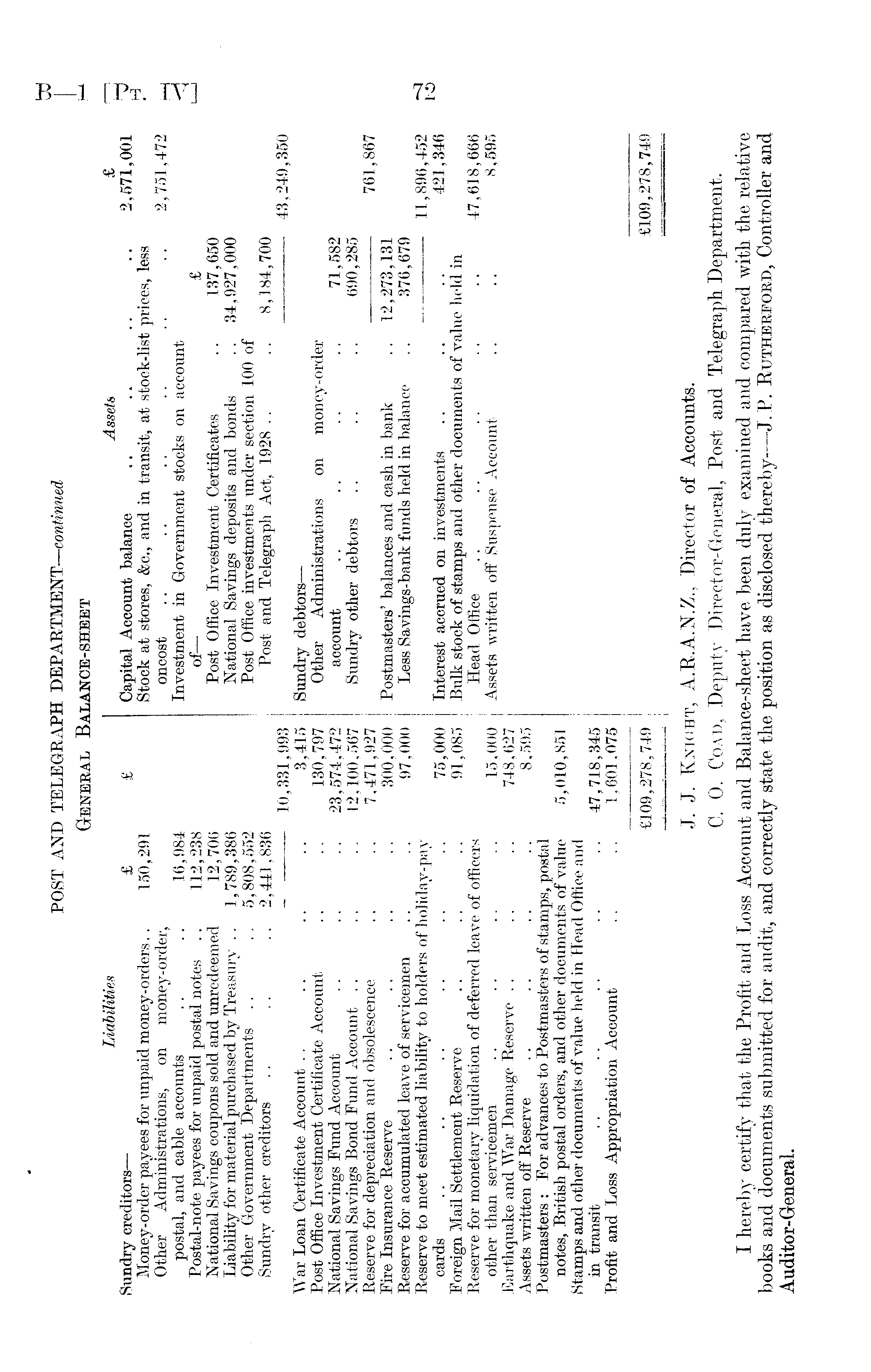 POST AND TELEGRAPH DEPARTMENT— continued General Balance-sheet Liabilities Assets £ Sundry creditors— £ £ Capital Account balance .. .. .. .. 2,571,001 Money-order payees for unpaid money-orders.. 150,291 Stock at stores, &c., and in transit, at stock-list prices, less Other Administrations, on money-order, oncost .. .. .. .. .. .. 2,751,472 postal, and cable accounts .. .. 16,984 Investment in Government stocks on account Postal-note payees for unpaid postal notes .. 112,238 of— £ National Savings coupons sold and unredeemed 12,706 Post Office Investment Certificates .. 137,650 Liability for material purchased by Treasury .. 1,789,386 National Savings deposits and bonds .. 34,927,000 Other Government Departments .. .. 5,808,552 Post Office investments under section 100 of Sundry other creditors .. .. .. 2,441,836 Post and Telegraph Act, 1928 .. .. 8,184,700 _ 10,331,993 43,249,350 War Loan Certificate Account .. .. .. .. 3,415 Sundry debtors— Post Office Investment Certificate Account .. .. 130,797 Other Administrations on money-order National Savings Fund Account .. .. .. 23,574,472 account .. .. .. .. 71,582 National Savings Bond Fund Account .. .. .. 12,100,567 Sundry other debtors .. .. .. 690,285 Reserve for depreciation and obsolescence .. .. 7,471,927 761,867 Eire Insurance Reserve .. .. .. .. 300,000 Postmasters' balances and cash in bank .. 12,273,131 Reserve for accumulated leave of servicemen .. .. 97,000 Less Savings-bank funds held in balance .. 376,679 Reserve to meet estimated liability to holders of holiday-pay 11,896, 452 cards .. .. .. .. .. .. 75,000 Interest accrued on investments .. .. .. 421,346 Foreign Mail Settlement Reserve .. .. .. 91,085 Bulk stock of stamps and other documents of value held in Reserve for monetary liquidation of deferred leave of officers Head Office .. .. .. .. .. 47,618,666 other than servicemen .. .. .. .. 15,000 Assets written off Suspense Account .. .. 8,595 Earthquake and War Damage Reserve .. .. .. 748, 627 Assets written off Reserve .. .. .. .. 8,595 Postmasters : For advances to Postmasters of stamps, postal notes, British postal orders, and other documents of value 5,010,851 Stamps and other documents of value held in Head Office and in transit .. .. .. .. .. 47,718,345 Profit and Loss Appropriation Account .. .. 1,601,075 £109,278,749 £109,278,749 J. J. Knight, A.R.A.N.Z., Director of Accounts. C. 0. Coad, Deputy Director- General, Post and Telegraph Department. I hereby certify that the Profit and Loss Account and Balance-sheet have been duly examined and compared with the relative books and documents submitted for audit, and correctly state the position as disclosed thereby— J. P. Rutherford, Controller and Auditor-General.