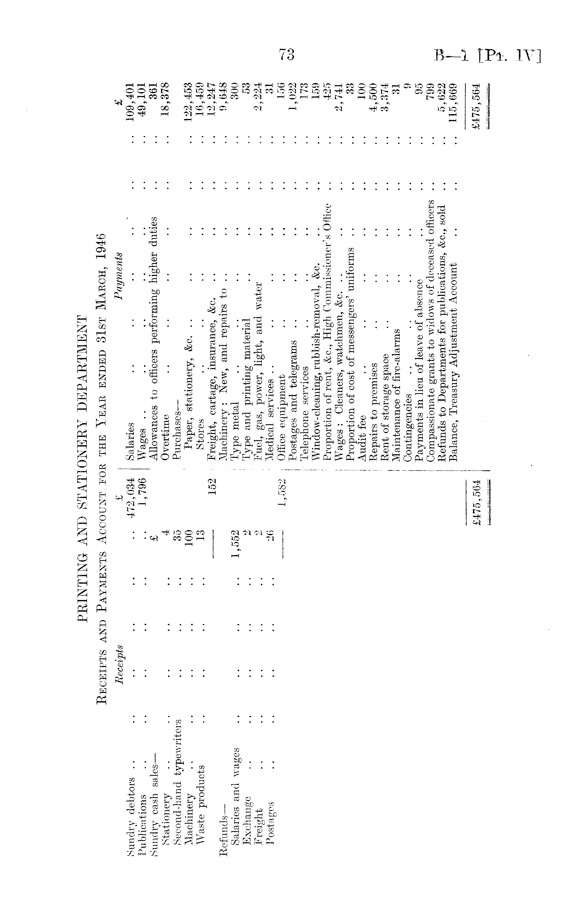 PRINTING AND STATIONERY DEPARTMENT Receipts and Payments Account for the Year ended 31st March, 1946 Receipts £ Payments £ Sundry debtors .. .. .. .. .. .. 472,034 Salaries .. .. .. .. .. .. 109,401 Publications .. .. .. .. .. .. 1,796 Wages .. .. .. .. .. .. .. 49,101 Sundry cash sales— £ Allowances to officers performing higher duties .. .. 361 Stationery .. .. .. .. .. 4 Overtime .. .. .. .. .. .. 18,378 Second-hand typewriters .. .. .. 35 j Purchases— Machinery .. .. .. .. 100 I Paper, stationery, &c. .. .. .. .. .. 122,453 Waste products .. .. .. .. 13 j Stores .. .. .. .. .. .. 16,459 152 I Freight, cartage, insurance, &c. .. .. .. .. 12,247 Refunds— Machinery: New, and repairs to .. .. .. .. 9,648 Salaries and wages .. .. .. .. 1,552 Type metal .. .. .. .. .. .. 300 Exchange .. .. .. .. .. 2 Type and printing material .. .. .. .. 53 Freight . . .. .. .. .. 2 Fuel, gas, power, light, and water .. .. .. 2,224 Postages .. .. .. .. .. 26 I Medical services .. .. .. .. .. .. 31 1,582 Office equipment .. .. .. .. .. 156 Postages and telegrams .. .. .. .. .. 1,022 Telephone services .. .. .. .. .. 173 Window-cleaning, rubbish-removal, &c. .. .. .. 159 Proportion of rent, &c., High Commissioner's Office .. .. 425 Wages: Cleaners, watchmen, &c. .. .. .. .. 2,741 Proportion of cost of messengers' uniforms .. .. .. 33 Audit fee .. .. .. .. .. .. 100 Repairs to premises .. .. .. .. .. 4,500 Rent of storage space .. .. .. .. . . 3,374 Maintenance of fire-alarms .. .. .. .. 31 Contingencies .. .. .. .. .. .. 9 Payments in lieu of leave of absence .. .. .. 95 Compassionate grants to widows of deceased officers .. .. 799 Refunds to Departments for publications, &c., sold .. .. 5,622 Balance, Treasury Adjustment Account .. .. .. 115,669 £475,564 £475,564