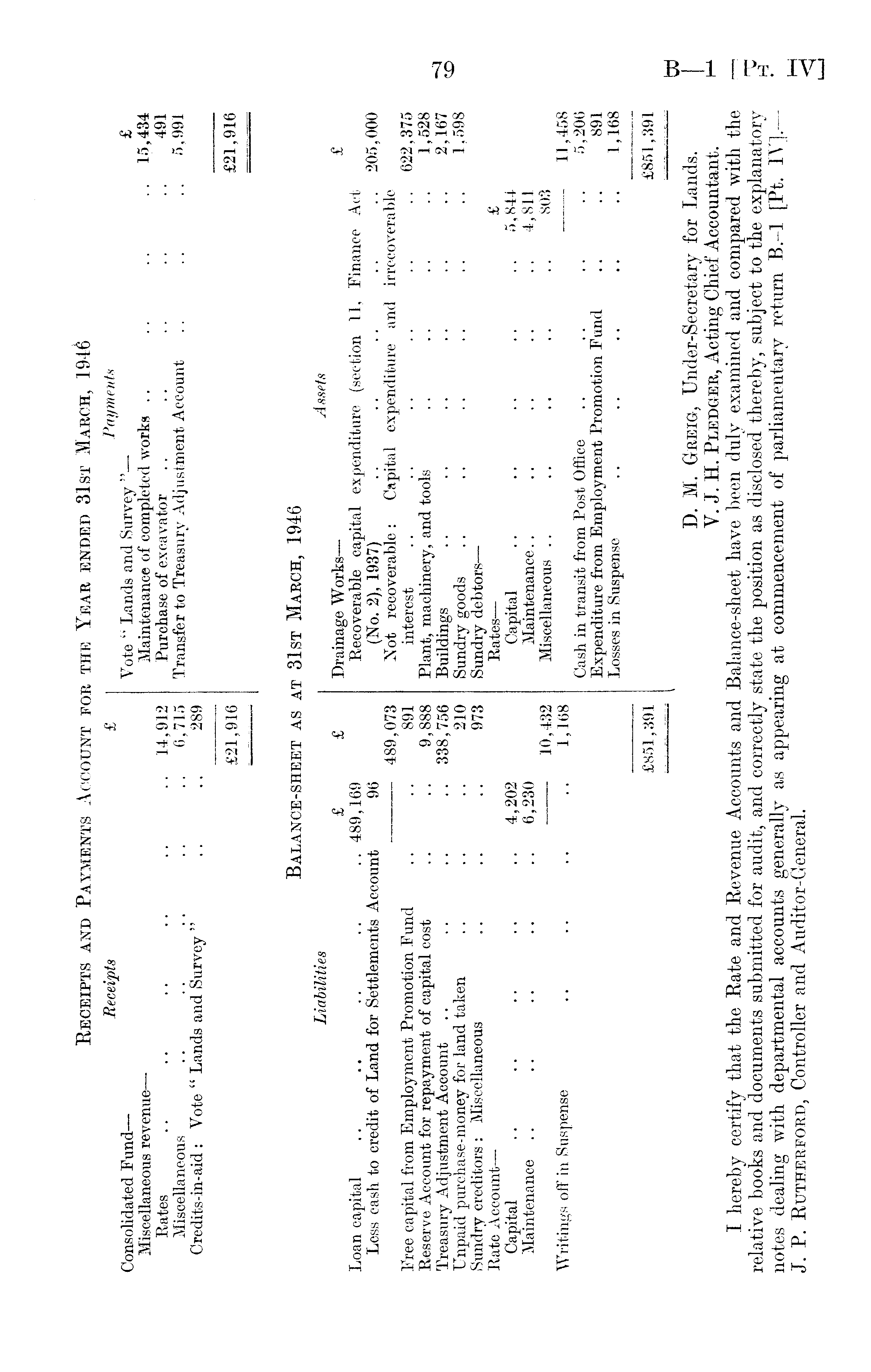 Beceipts and Payments Account for the Year ended 31st March, 1946 Receipts £ Payments Consolidated Fund— Vote " Lands and Survey " £ Miscellaneous revenue— Maintenance of completed works .. .. .. .. 15,434 Rates .. .. .. .. .. .. 14,912 Purchase of excavator .. .. .. .. .. 491 Miscellaneous .. .. .. .. .. 6,715 Transfer to Treasury Adjustment Account .. .. .. 5,991 Credits -in- aid : Vote " Lands and Survey " .. .. 289 £21,916 £21,916 Balance-sheet as at 31st March, 1946 Liabilities Assets £ £ Drainage Works— £ Loan capital .. .. .. .. .. 489,169 Recoverable capital expenditure (section 11, Finance Act Less cash to credit of Land for Settlements Account 96 (No. 2), 1937) .. .. .. .. .. 205,000 489,073 Not recoverable: Capital expenditure and irrecoverable Free capital from Employment Promotion Fund .. .. 891 interest .. .. .. .. .. .. 622,375 Reserve Account for repayment of capital cost .. .. 9,888 Plant, machinery, and tools .. .. .. .. 1,528 Treasury Adjustment Account .. .. .. .. 338,756 Buildings .. .. .. .. .. .. 2,167 Unpaid purchase-money for land taken .. .. .. 210 Sundry goods .. .. .. .. .. .. 1,598 Sundry creditors: Miscellaneous .. .. .. 973 Sundry debtors— Rate Account— Rates— £ Capital .. .. .. .. .. 4,202 Capital .. .. .. .. .. 5,844 Maintenance .. .. .. .. .. 6,230 Maintenance.. .. .. .. .. 4,811 1 0,432 Miscellaneous .. .. .. .. .. 803 Writings off in Suspense .. .. .. .. 1,168 11,458 Cash in transit from Post Office .. .. .. .. 5,206 Expenditure from Employment Promotion Fund .. .. 891 Losses in Suspense .. .. .. .. .. 1,168 £851,391 £851,391 D. M. Greig, Under-Secretary for Lands. V. J. H. Pledger, Acting Chief Accountant. I hereby certify that the Rate and Revenue Accounts and Balance-sheet have been duly examined and compared with the relative books and documents submitted for audit, and correctly state the position as disclosed thereby, subject to the explanatory notes dealing with departmental accounts generally as appearing at commencement of parliamentary return 8.-l [Pt. IV].— J. P. Rutherford, Controller and Auditor-General.