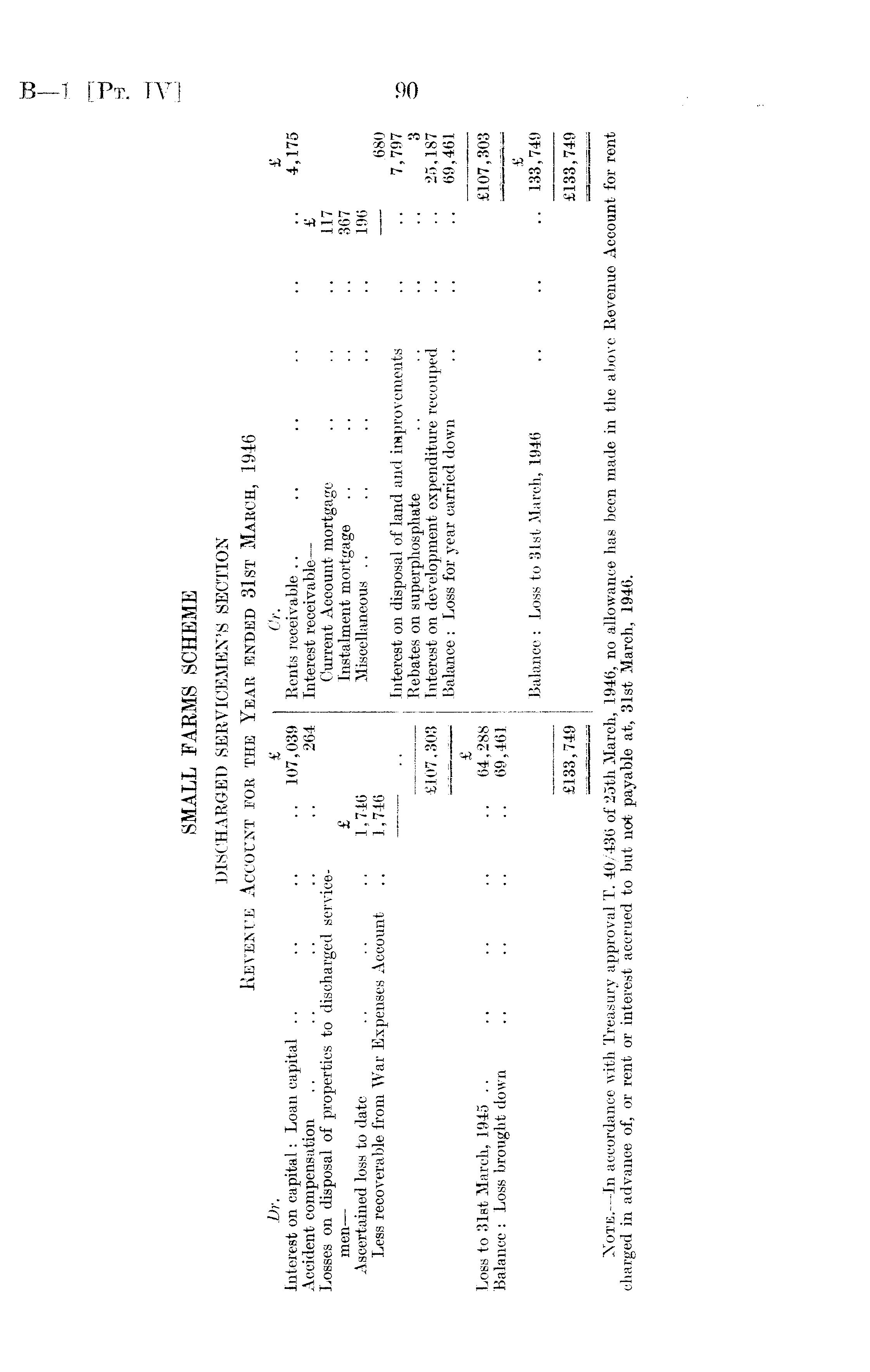 SMALL FARMS SCHEME DISCHARGED SERVICEMEN'S SECTION Revenue Account for the Year ended 31st March, 1946 Dr. £ Or. £ Interest on capital: Loan capital .. .. .. .. 107,089 Rents receivable .. .. .. .. .. .. 4,175 Accident compensation .. .. .. .. .. 264 Interest receivable— £ Losses on disposal of properties to discharged service- Current Account mortgage .. .. .. 117 men— £ Instalment mortgage .. .. .. .. 367 Ascertained loss to date .. .. .. 1,746 Miscellaneous .. .. .. .. .. 196 Less recoverable from War Expenses Account .. 1,746 680 .. Interest on disposal of land and improvements .. .. 7,797 _____ Rebates on superphosphate .. . . .. .. 3 £107,303 Interest on development expenditure recouped .. .. 25,187 —Balance: Loss for year carried down .. .. .. 69,461 £ Loss to 31st March, 1945 .. .. .. .. .. 64,288 £107,303 Balance: Loss brought down ~ .. .. .. 69,461 £ Balance: Loss to 31st March, 1946 .. .. .. 133,749 £133,749 £133,749 Note.—In accordance with Treasury approval T. 40/436 of 25th March, 1946, no allowance has been made in the above Revenue Account for rent charged in advance of, or rent or interest accrued to but not payable at, 31st March, 1946.
