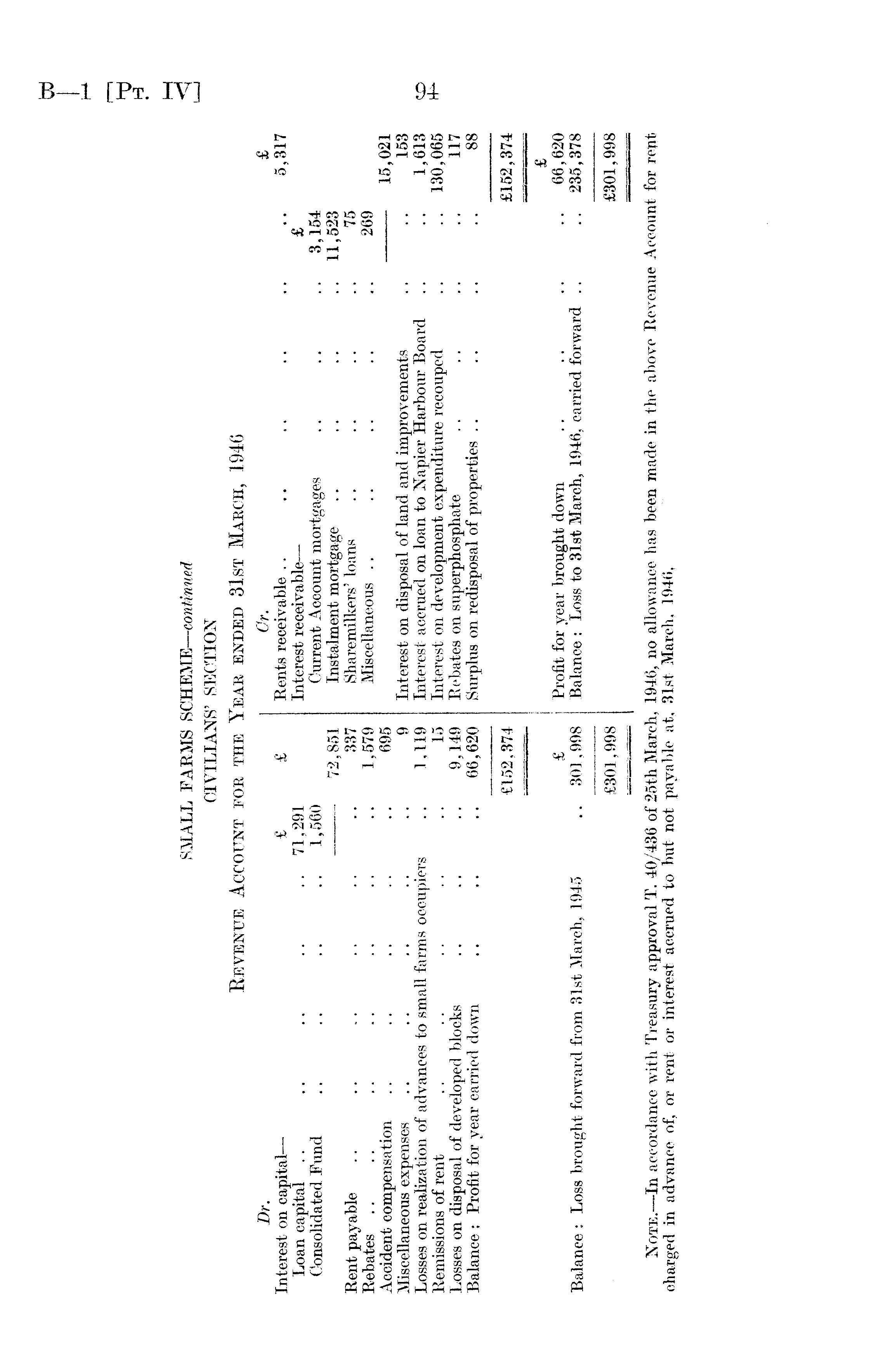 SMALL FARMS SCHEME— continued CIVILIANS' SECTION Bevenue Account for the Year ended 31st March, 1946 Dr. Or. £ Interest on capital— £ £ Rents receivable .. .. .. .. .. .. 5,317 Loan capital .. .. .. .. .. 71,291 Interest receivable— £ Consolidated Fund .. .. .. .. 1,560 Current Account mortgages .. .. .. 3,154 72,851 Instalment mortgage .. .. .. .. 11,523 Rent payable .. .. .. .. . . .. 337 Sharemilkers' loans .. .. .. .. 75 Rebates .. .. .. .. .. .. .. 1,579 Miscellaneous .. .. .. .. .. 269 Accident compensation .. .. .. .. .. 695 15,021 Miscellaneous expenses .. .. .. .. .. 9 Interest on disposal of land and improvements .. .. 153 Losses on realization of advances to small farms occupiers .. 1,119 Interest accrued on loan to Napier Harbour Board .. .. 1,613 Remissions of rent .. .. .. .. .. 15 Interest on development expenditure recouped .. .. 130,065 Losses on disposal of developed blocks .. .. .. 9,149 Rebates on superphosphate .. .. .. .. 117 Balance : Profit for year carried down .. .. .. 66,620 Surplus on redisposal of properties .. .. .. .. 88 £152,374 £152,374 £ £ Profit for year brought down .. .. .. .. 66,620 Balance: Loss brought forward from 31st March, 1945 .. 301,998 Balance: Loss to 31st March, 1946, carried forward .. .. 235,378 £301,998 £301,998 Note.—In accordance with Treasury approval T. 40/436 of 25th March, 1946, no allowance has been made in the above Revenue Account for rent charged in advance of, or rent or interest accrued to but not payable at, 31st March, 1946,