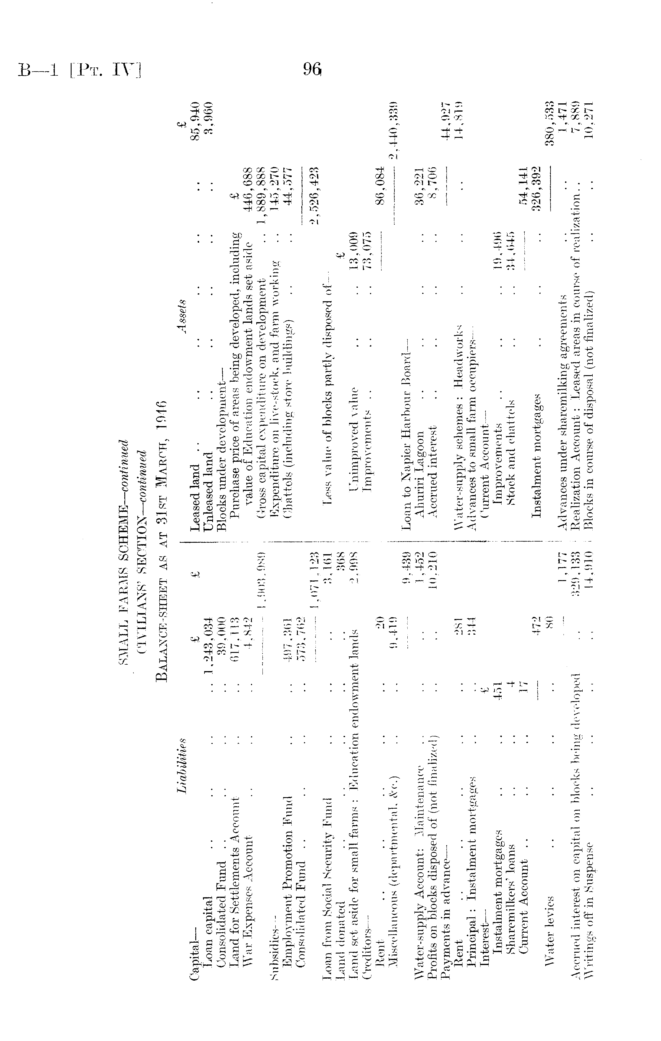 SMALL FARMS SCHEME— continued CIVILIANS' SECTION— continued Balance-sheet as at 31st March, 1946 Liabilities Assets £ Capital— £ £ Leased land .. .. .. .. .. .. 85,940 Loan capital .. .. .. .. 1,243,034 Unleased land .. .. .. .. .. 3,960 Consolidated Fund .. .. .. .. 39,000 Blocks under development— Land for Settlements Account .. .. 617,113 Purchase price of areas being developed, including £ War Expenses Account .. .. .. 4,842 value of Education endowment lands set aside 446,688 •——— 1,903, 989 Gross capital expenditure on development .. 1,889, 888 Subsidies— Expenditure on live-stock, and farm working .. 145,270 Employment Promotion Fund .. .. 497,361 Chattels (including store buildings) .. .. 44,577 Consolidated Fund .. .. .. .. 573,762 - 1,071,123 2,526,423 Loan from Social Security Fund .. .. .. ' 3,161 Less value of blocks partly disposed of— Land donated .. .. .. .. .. 368 £ Land set aside for small farms : Education endowment lands 2,998 Unimproved value .. .. 13,009 Creditors— Improvements .. .. .. 73,075 Rent .. .. .. .. .. 20 86,084 Miscellaneous (departmental, &c.) .. .. 9,419 2,440,339 9,439 Loan to Napier Harbour Board-Water-supply Account: Maintenance .. .. .. 1,452 Ahuriri Lagoon .. .. .. .. 36,221 Profits on blocks disposed of (not finalized) .. .. 10,210 Accrued interest .. .. .. .. 8,706 Payments in advance— - 44,927 Rent .. .. .. .. .. 281 Water-supply schemes: Headworks .. .. .. 14,81.9 Principal: Instalment mortgages .. . . 344 Advances to small farm occupiers— Interest— £ Current Account— Instalment mortgages .. .. 451 Improvements .. .. .. 19,496 Sharemilkers' loans . . .. 4 Stock and chattels . . 34, (545 Current Account .. .. .. 17 54,141 472 Instalment mortgages .. .. .. 326,392 Water levies .. .. .. .. 80 380,533 1,177 Advances under sharemilking agreements .. .. 1,471 Accrued interest on capital on blocks being developed .. 329,133 Realization Account: Leased areas in course of realization.. 7,889 Writings off in Suspense .. ~ 14,910 Blocks in course of disposal (not finalized) .. .. 10,271