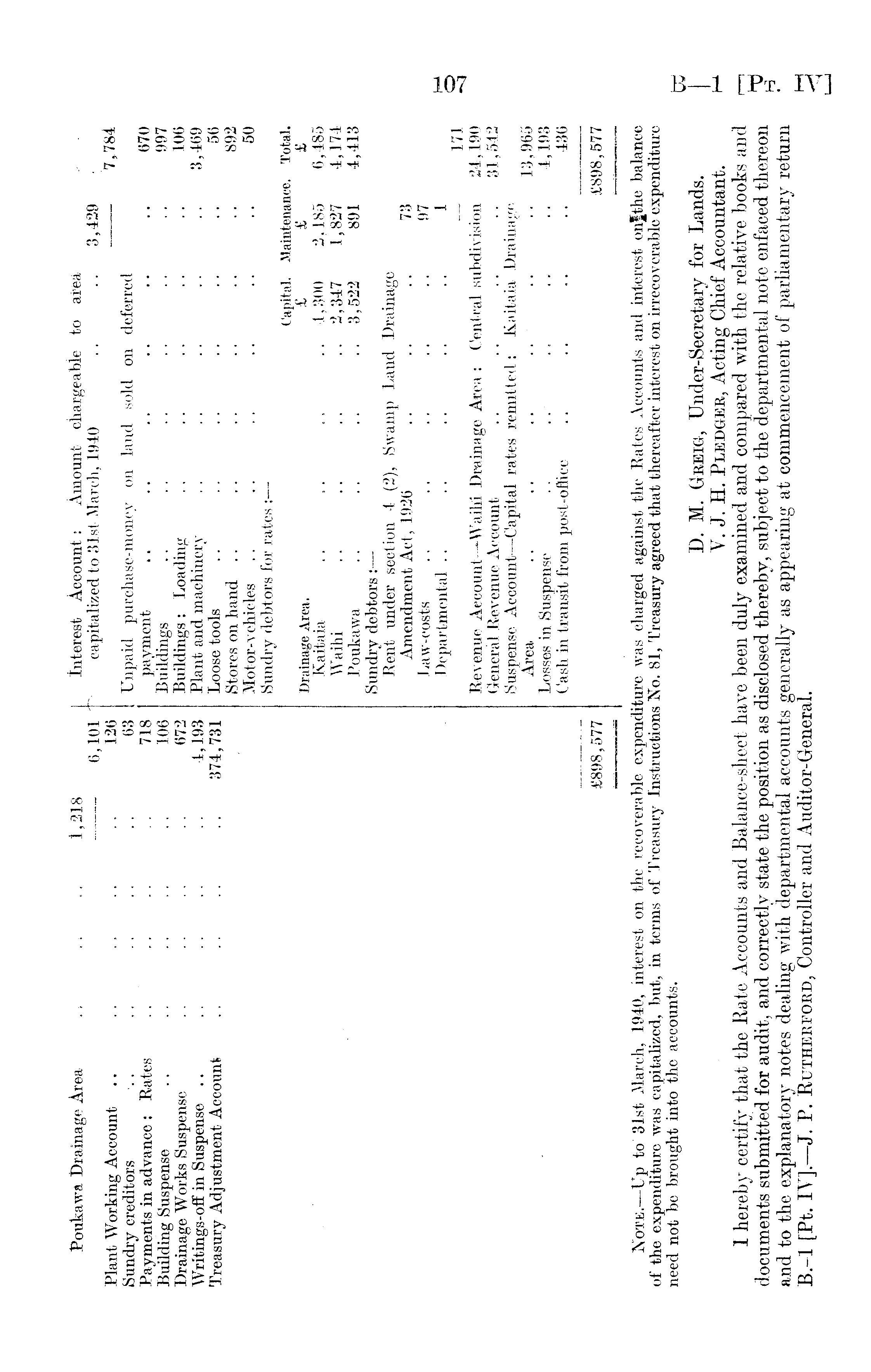 Poukawa, Drainage Area . > .. 1,218 Interest Account : Amount chargeable to area 6,101 capitalized to 31st March, 1940 .. .. 3,429 Plant Working Account .. , . , . . . ~ 126 7, 784 Sundry creditors .. . . . . . . . . 63 Unpaid purchase-money on land sold on deferred Payments in advance: Rates . . . . . . 718 payment .. .. .. .. .. .. 670 Building Suspense .. .. . . . . . . 106 Buildings .. .. .. .. .. . . 997 Drainage Works Suspense . . . . .. 672 Buildings: Loading . . . . . . .. .. 106 Writings-off in Suspense .. .. .. .. .. 4,193 Plant and machinery .. .. .. .. 3,469 Treasury Adjustment Account .. .. .. .. 374,731 Loose tools .. .. .. .. .. .. 56 Stores on hand .. .. .. .. .. .. 892 Motor-vehicles .. .. .. .. .. .. 50 Sundry debtors for rates : Capital. Maintenance. Total. Drainage Area. £ £ £ Kaitaia .. .. .. 4,300 2,185 6,485 Waihi .. .. .. .. 2,347 1,827 4,174 Poukawa .. .. .. .. 3,522 891 4,413 Sundry debtors:— Rent under section 4 (2), Swamp Land Drainage Amendment Act, 1926 .. .. .. 73 Law-costs .. .. .. .. .. 97 Departmental .. . . .. .. .. 1 171 Revenue Aecount— »Wailu Drainage Area: Central subdivision 24,190 General Revenue Account .. .. .. .. 31,542 Suspense Account— Capital rates remitted: Kaitaia Drainage Area .. .. .. 13,965 Losses iii Suspense .. .. .. .* ■ .. 4,193 Cash in transit from post-office .. .. .. .. 436 £898,577 £898,577 Note.—Up to 31st March, 1940, interest on the recoverable expenditure was charged against the Rates Accounts and interest onfthe balance of the expenditure was capitalized, but, in terms of Treasury Instructions No. 81, Treasury agreed that thereafter interest on irrecoverable expenditure need not be brought into the accounts. D. M. Greig, Under-Secretary for Lands. Y. J. H. Pledger, Acting Chief Accountant. I hereby certify that the Eate Accounts and Balance-sheet have been duly examined and compared with the relative books and documents submitted for audit, and correctly state the position as disclosed thereby, subject to the departmental note enfaced thereon and to the explanatory notes dealing with departmental accounts generally as appearing at commencement of parliamentary return 8.-l [Ft. IV].—J. P. Rutherford, Controller and Auditor- General.