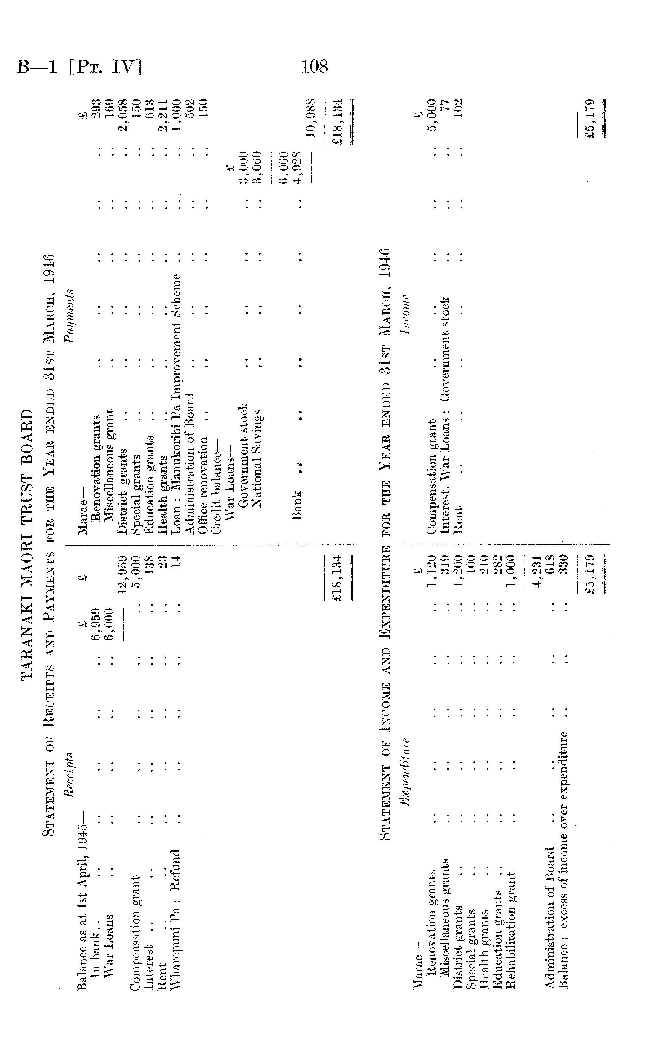 TARANAKI MAORI TRUST BOARD Statement op Receipts and Payments por the Year ended 31st March, 1946 Receipts Payments Balance as at Ist April, 1945— £ £ Marae— £ In bank.. .. .. .. .. 6,959 Renovation grants .. .. .. .. .. 293 War Loans .. .. .. .. .. 6,000 Miscellaneous grant .. .. .. .. .. 169 —— 12,959 District grants .. .. .. .. .. .. 2,058 Compensation grant .. .. .. .. .. 5,000 Special grants .. .. .. .. .. .. 150 Interest .. .. .. .. .. .. .. 138 Education grants .. .. .. .. .. .. 613 Bent .. .. .. .. .. .. .. 23 Health grants .. .. .. .. .. .. 2,211 Wharepuni Pa: Refund .. .. .. .. 14 Loan: Manukorihi Pa Improvement Scheme .. .. .. 1,000 Administration of Board .. .. .. . . .. 502 Office renovation .. .. .. .. .. .. 150 Credit balance— War Loans— £ Government stock .. .. .. 3,000 National Savings .. .. 3,060 6,060 Bank ,# .. .. .. .. 4,928 10,988 £18,134 £18,134 Statement op Income and Expenditure por the Year ended 31st March, 1946 Expenditure Income Marae— £ £ Renovation grants .. .. .. .. ..1,120 Compensation grant .. .. .. .. .. 5,000 Miscellaneous grants . . .. . . .. .. 319 Interest, War Loans: Government stock .. .. .. 77 District grants .. .. .. .. .. .. 1,200 Rent .. .. .. .. .. .. .. 102 Special grants .. .. .. .. .. .. 100 Health grants .. .. . . . . .. .. " 210 Education grants .. .. .. .. .. .. 282 Rehabilitation grant .. . . . . .. 1,000 4,231 Administration of Board .. .. .. .. .. 618 Balance : excess of income over expenditure .. .. .. 330 £5,179 £5,179