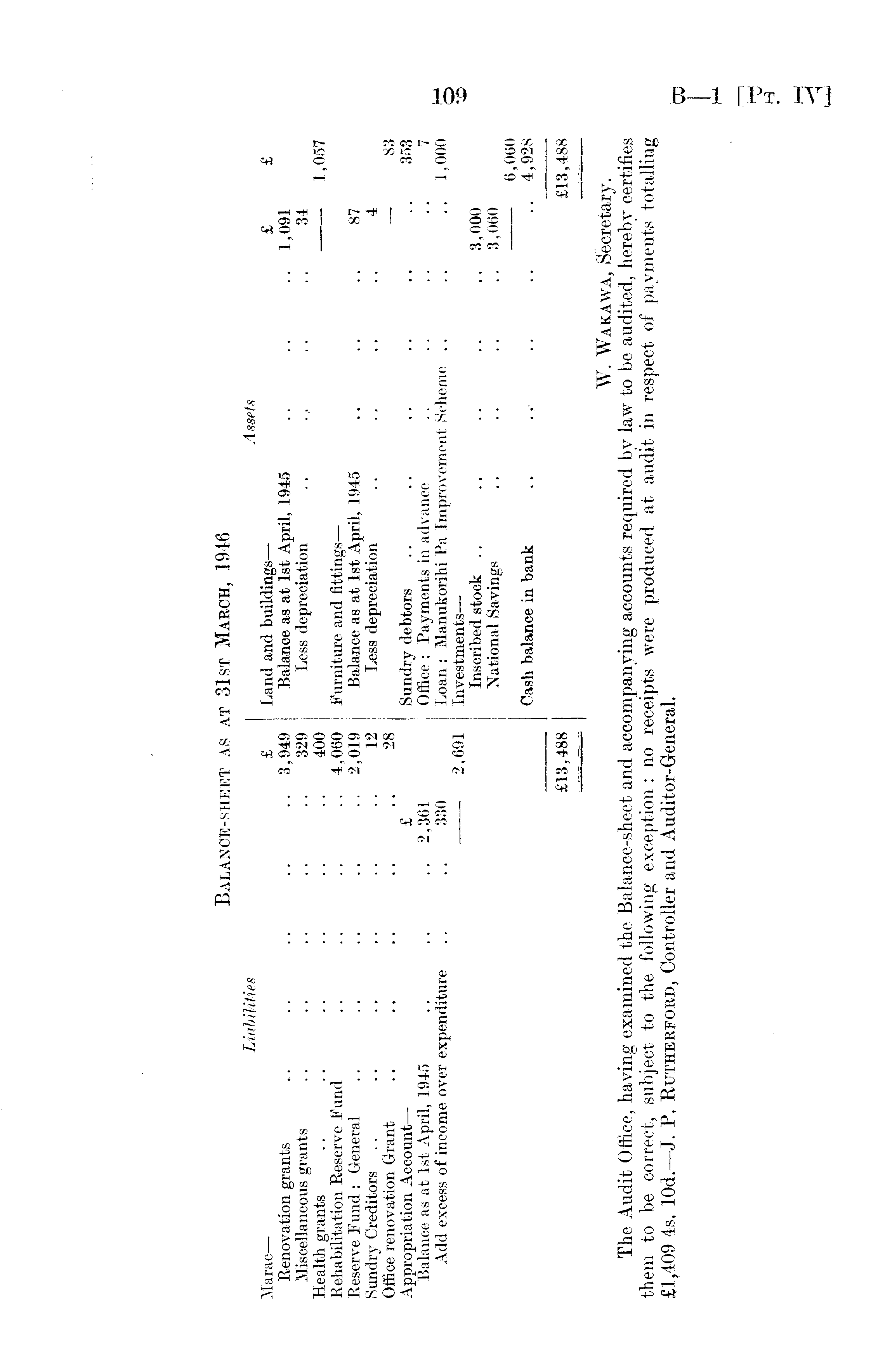 Balance-sheet as at 31st March, 1946 Liabilities Assets Marae— £ Land and buildings— £ £ Renovation grants .. .. .. .. .. 3,949 Balance as at Ist April, 1945 .. .. .. 1,091 Miscellaneous grants .. .. .. .. .. 329 Less depreciation .. ~ .. .. 34 Health grants .. .. .. .. .. .. 400 1,057 Rehabilitation Reserve Fund .. .. .. .. 4,060 Furniture and fittings— Reserve Fund: General .. .. .. .. .. 2,019 Balance as at Ist April, 1945 .. .. .. 87 Sundry Creditors .. .. ~ .. .. .. 12 Less depreciation .. .. .. .. 4 Office renovation Grant .......... 28 83 Appropriation Account— £ Sundry debtors .. .. .. .. .. .. 353 Balance as at Ist April, 1945 .. .. .. 2,361 Office: Payments in advance .. .. .. .. 7 Add excess of income over expenditure .. .. 330 Loan : Manukorihi Pa Improvement Scheme .. .. 1,000 2,691 Investments— Inscribed stock .. .. .. .. 3,000 National Savings .. .. .. .. 3,060 6,060 Cash balance in bank .. .. .. .. .. 4,928 £13,488 £13,488 W. Wakawa, Secretary. The Audit Office, having examined the Balance-sheet and accompanying accounts required by law to be audited, hereby certifies them to be correct, subject to the following exception : no receipts were produced at audit in respect of payments totalling £1,409 4s, lOd.—J. P, Rutherford, Controller and Auditor-General.