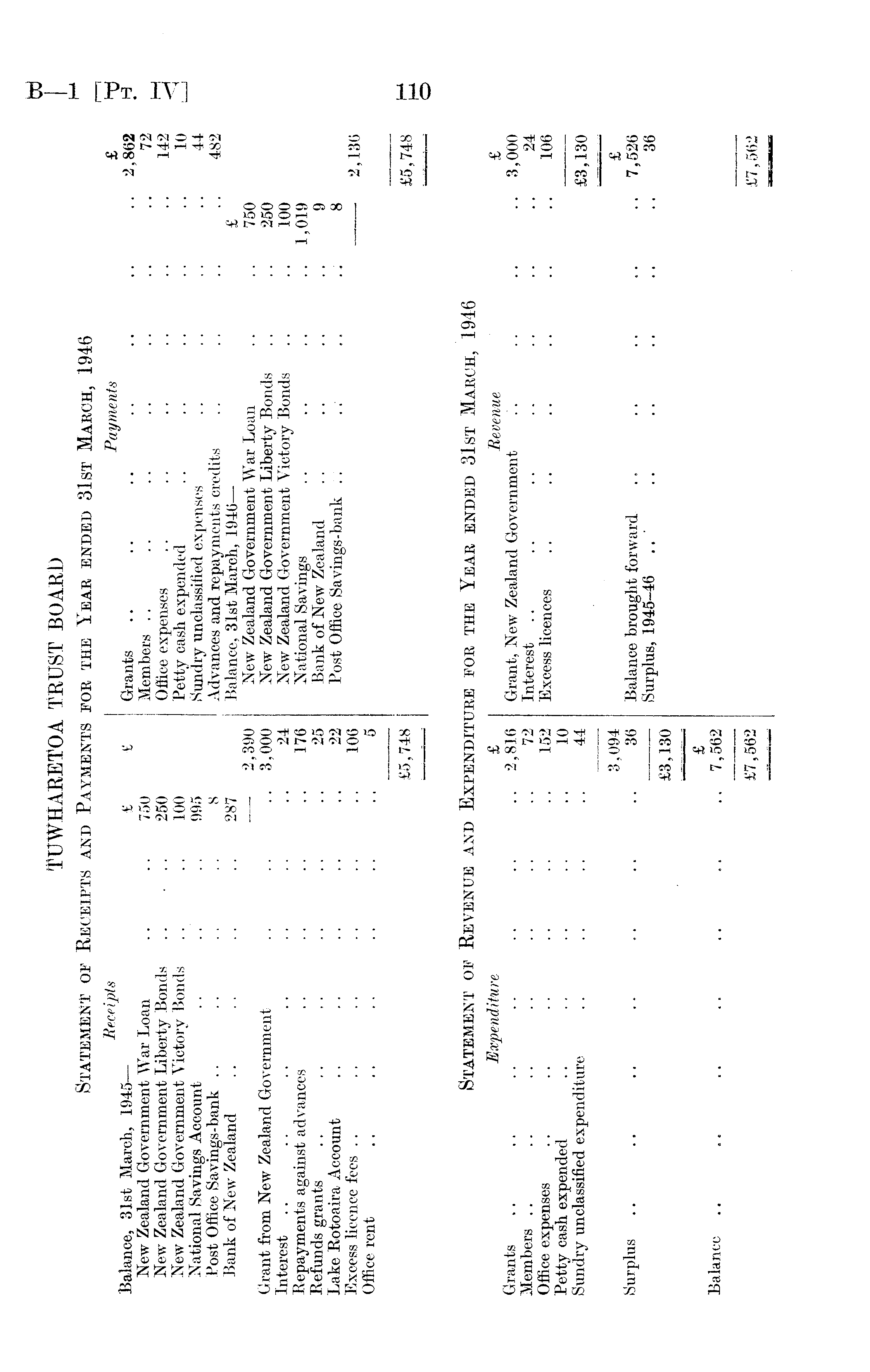 TUWHARETOA TRUST BOARD Statement of Receipts and Payments for the Year ended 31st March, 1946 Receipts Payments £ Balance, 31st March, 1945— £ £ Grants .. .. .. .. .. .. .. 2,862 New Zealand Government War Loan .. .. 750 Members .. .. .. .. . . .. .. 72 New Zealand Government Liberty Bonds .. ... 250 Office expenses .. .. .. .. .. .. 142 New Zealand Government Victory Bonds . . . . 100 Petty cash expended .. .. .. .. .. 10 National Savings Account .. .. .. 995 Sundry unclassified expenses .. .. .. .. 44 Post Office Savings-bank .. . . . . . . 8 Advances and repayments credits .. . . .. .. 482 Bank of New Zealand .. . . . . .. 287 Balance, 31st March, 1946— £ 2,390 New Zealand Government War Loan .. .. 750 Grant from New Zealand Government . . .. 3,000 New Zealand Government Liberty Bonds .. . . 250 Interest .. .. . . . . .. .. .. 24 New Zealand Government Victory Bonds . . . . 100 Repayments against advances .. . . .. .. 176 National Savings .. .. .. .. 1,019 Refunds grants .. .. . . . . .. .. 25 Bank of New Zealand .. .. .. .. 9 Lake Rotoaira Account .. . . . . .. .. 22 Post Office Savings-bank .; .. .. ; c 8 Excess licence fees .. .. .. .. ~ .. 106 2,136 Office rent .. .. . . .. .. .. 5 £5,748 £5,748 Statement oe Revenue and Expenditure for the Year ended 31st March, 1946 Expenditure £ Revenue £ Grants .. .. .. .. .. .. .. 2,816 Grant, New Zealand Government .. .. .. 3,000 Members .. .. .. . . . . .. .. 72 Interest .. .. .. .. .. .. .. 24 Office expenses .. .. . . . . .. . . 152 Excess licences .. .. .. . . .. .. 106 Petty cash expended .. . . . . . . .. 10 Sundry unclassified expenditure ........ 44 £3,130 3,094 £~~ Surplus .. .. .. .. .. .. 36 Balance brought forward .. .. .. .. .. 7,526 — Surplus, 1945-46 .. ' .. .. .. .. .. 36 £3,130 £ Balance .. .. .. .. .. .. .. 7,562 £7,562 £7,562