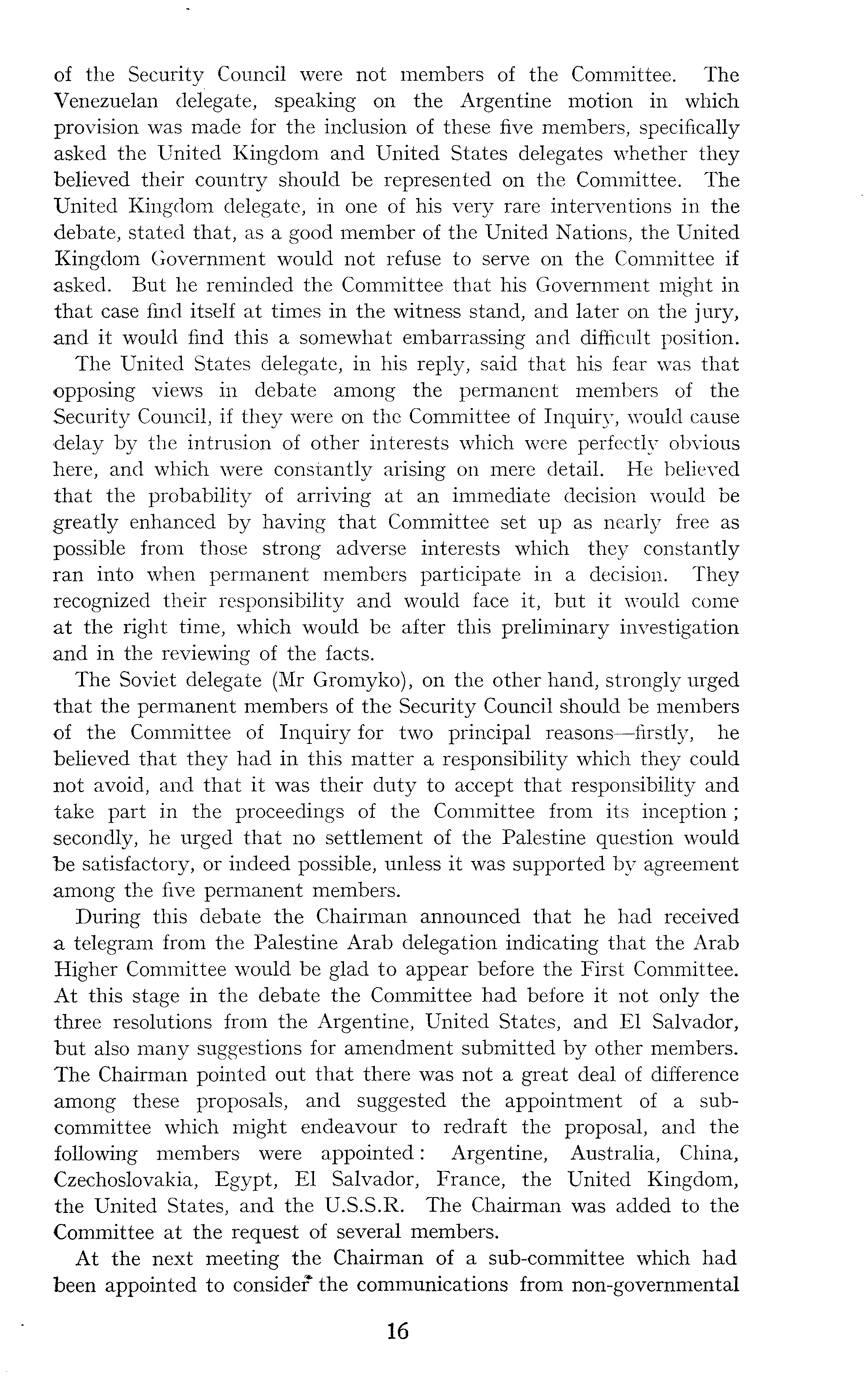 of the Security Council were not members of the Committee. The Venezuelan delegate, speaking on the Argentine motion in which provision was made for the inclusion of these five members, specifically asked the United Kingdom and United States delegates whether they believed their country should be represented on the Committee. The United Kingdom delegate, in one of his very rare interventions in the debate, stated that, as a good member of the United Nations, the United Kingdom Government would not refuse to serve on the Committee if asked. But he reminded the Committee that his Government might in that case find itself at .times in the witness stand, and later on the jury, and it would find this a somewhat embarrassing and difficult position. The United States delegate, in his reply, said that his fear was that opposing views in debate among the permanent members of the Security Council, if they were on the Committee of Inquiry, would cause delay by the intrusion of other interests which were, perfectly obvious here, and which were constantly arising on mere detail. He believed that the probability of arriving at an immediate decision would be greatly enhanced by having that Committee set up as nearly free as possible from those strong adverse interests which they constantly ran into when permanent members participate in a decision. They recognized their responsibility and would face it, but it would come at the right time, which would be after this preliminary investigation and in the reviewing of the facts. The Soviet delegate (Mr Gromyko), on the other hand, strongly urged that the permanent members of the Security Council should be members of the Committee of Inquiry for two principal reasons —firstly, he believed that they had in this matter a responsibility which they could not avoid, and that it was their duty to accept that responsibility and take part in the proceedings of the Committee from its inception ; secondly, he urged that no settlement of the Palestine question would be satisfactory, or indeed possible, unless it was supported by agreement among the five permanent members. During this debate the Chairman announced that he had received a telegram from the Palestine Arab delegation indicating that the Arab Higher Committee would be glad to appear before the First Committee. At this stage in the debate the Committee had before it not only the three resolutions from the Argentine, United States, and El Salvador, but also many suggestions for amendment submitted by other members. The Chairman pointed out that there was not a great deal of difference among these proposals, and suggested the appointment of a subcommittee which might endeavour to redraft the proposal, and the following members were appointed: Argentine, Australia, China, Czechoslovakia, Egypt, El Salvador, France, the United Kingdom, the United States, and the U.S.S.R. The Chairman was added to the Committee at the request of several members. At the next meeting the Chairman of a sub-committee which had been appointed to consider the communications from non-governmental
