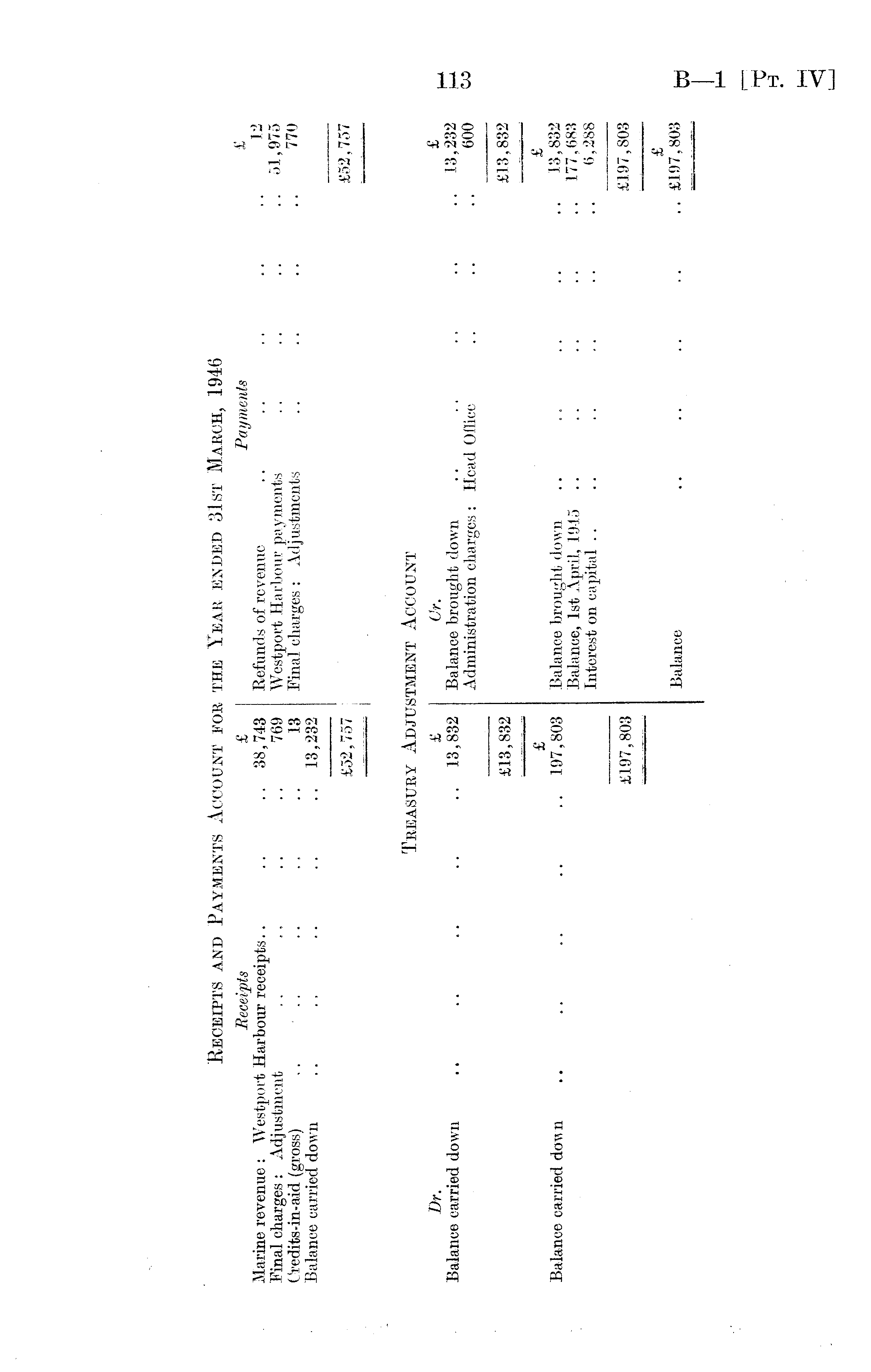 Receipts and Payments Account for the Year ended 31st March, 1946 Receipts £ Payments £ Marine revenue: Westport Harbour receipts.. .. .. 38,743 Refunds of revenue .. .. .. .. 12 Final charges: Adjustment .. .. .. 769 Westport Harbour payments .. .. .. ..51,975 Oedits-in-aid (gross) .. * .. .. .. .. 13 Final charges: Adjustments .. .. .. •. 770 Balance carried down .. .. .. .. .. 13,232 £52,757 £52,757 Treasury Adjustment Account Dr. £ Or. £ Balance carried down .. .. .. .. .. 13,832 Balance brought down .. .. .. .. .. 13,232 Administration charges: Head Office .. .. .. 600 £13,832 £13,832 _ ___ Balance carried down .. .. .. .. .. 197,803 Balance brought down .. .. .. .. .. 13,832 Balance, Ist April, 1945 .. .. .. .. .. 177,683 Interest on capital .. .. .. .. •. • • 6,288 £197,803 £197,803 Balance .. .. .. .. .. £197, 803