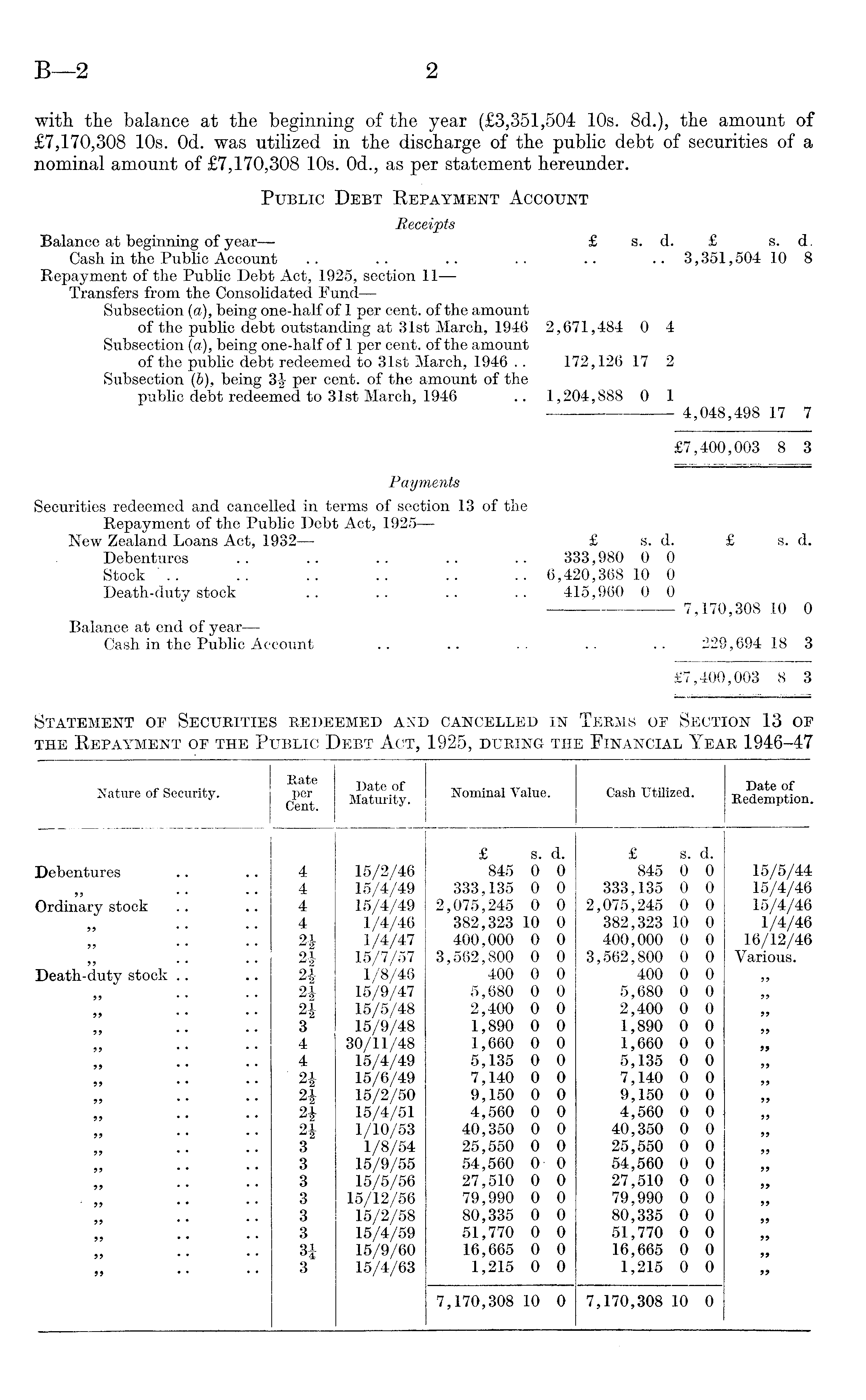 with the balance at the beginning of the year (£3,351,504 10s. Bd.), the amount of £7,170,308 10s. Od. was utilized in the discharge of the public debt of securities of a nominal amount of £7,170,308 10s. od., as per statement hereunder. Public Debt Repayment Account Receipts Balance at beginning of year — £ s. d. £ s. d. Cash in the Public Account .. .. .. .. .. .. 3,351,504 10 8 Repayment of the Public Debt Act, 1925, section 11— Transfers from the Consolidated Fund— Subsection (a), being one-half of 1 per cent, of the amount of the public debt outstanding at 31st March, 1946 2,671,484 0 4 Subsection (a), being one-half of 1 per cent, of the amount of the public debt redeemed to 31st March, 1946 .. 172,126 17 2 Subsection (b), being 3| per cent, of the amount of the public debt redeemed to 31st March, 1946 .. 1,204,888 0 1 4,048,498 17 7 £7,400,003 8 3 Payments Securities redeemed and cancelled in terms of section 13 of the Repayment of the Public Debt Act, 1925 — New Zealand Loans Act, 1932 — £ s. d. £ s. d. Debentures .. .. .. .. .. 333,980 0 0 Stock .. .. .. .. .. .. 6,420,368 10 0 Death-duty stock .. .. .. .. 415,960 0 0 7,170,308 10 0 Balance at end of year — Cash in the Public Account .. .. .. .. .. 229,694 18 3 £7,400,003 8 3