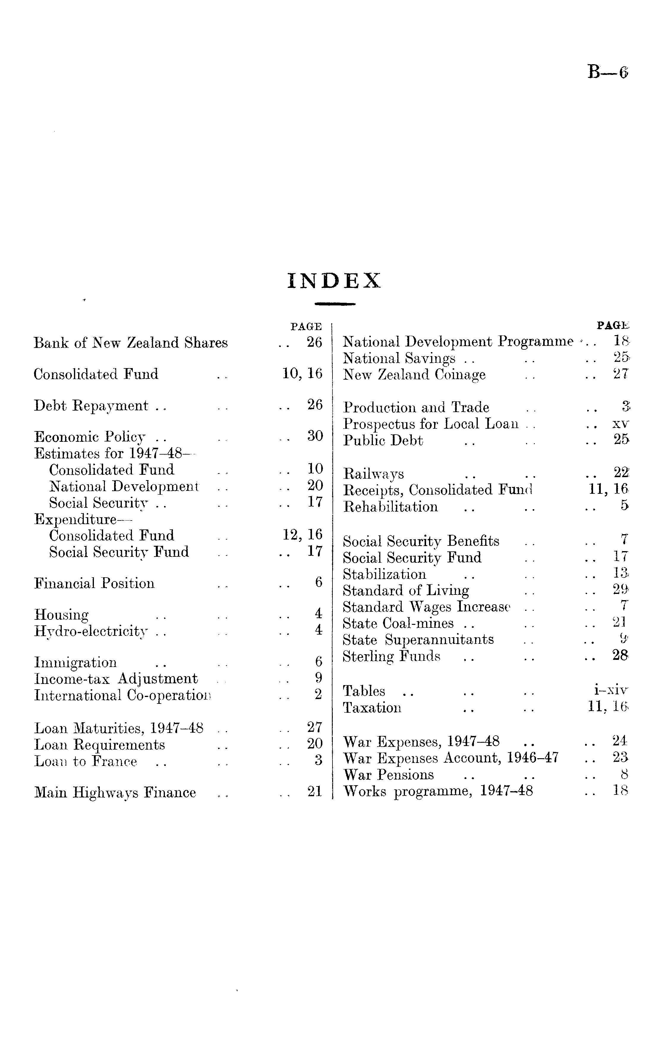 PAGK National Development Programme '.. 18National Savings .. .. .. 2& New Zealand Coinage .. .. 27 Production and Trade .. 3 Prospectus for Local Loan . . .. xv Public Debt .. .. 25 Railways .. .. .. 22 Receipts, Consolidated Fund 11, 16 Rehabilitation .. .. .. & Social Security Benefits .. .. 1 Social Security Fund .. .. IT Stabilization .. 13. Standard of Living .. .. 29> Standard Wages Increase .. 7 State Coal-mines .. .. 21 State Superannuitants .. 9* Sterling Funds .. .. .. 28 Tables .. .. .. i-xiv Taxation .. .. 11. 16 War Expenses, 1947-48 .. .. 24 War Expenses Account, 1946-47 .. 23 War Pensions .. .. .. 8 Works programme, 1947-48 .. 18