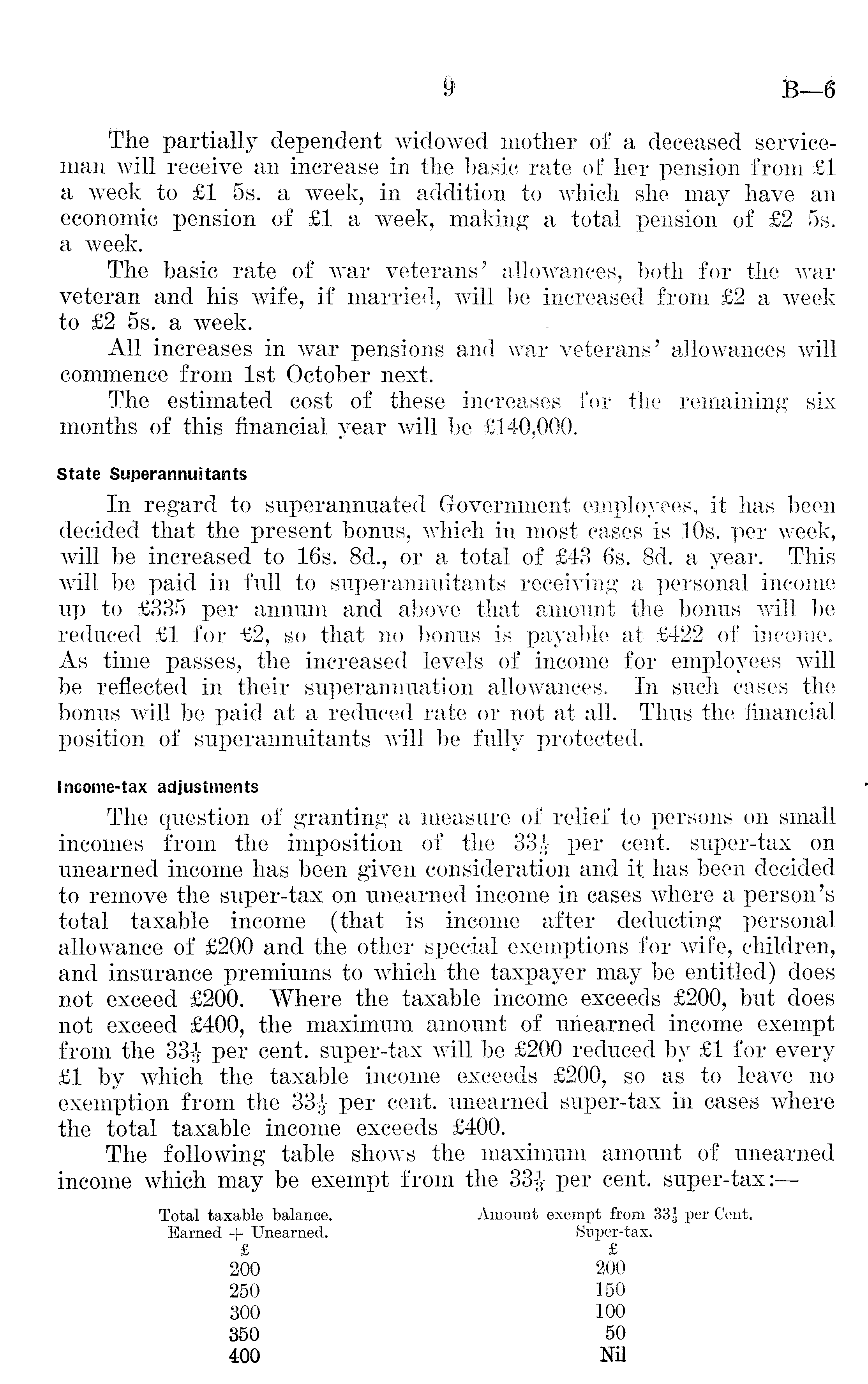 The partially dependent widowed mother of a deceased serviceman will receive an increase in the basic rate of her pension from £1 a week to £1 ss. a week, in addition to which she may have an economic pension of £1 a week, making a total pension of £2 ss. a week. The basic rate of war veterans' allowances, both for the war veteran and his wife, if married, will be increased from £2 a week to £2 ss. a week. All increases in war pensions and war veterans' allowances will commence from Ist October next. The estimated cost of these increases for the remaining six months of this financial year will be £140,000. State Superannuitants In regard to superannuated Government employees, it has been decided that the present bonus, which in most cases is 10s. per week, will be increased to 16s. Bd., or a total of £43 6s. Bd. a year. This will be paid in full to superannuitants receiving a personal income up to £335 per annum and above that amount the bonus will be reduced £1 for £2, so that no bonus is payable at £422 of income. As time passes, the increased levels of income for employees will be reflected in their superannuation allowances. In such cases the bonus will be paid at a reduced rate or not at all. Thus the financial position of superannuitants will be fully protected. Income-tax adjustments The question of granting a measure of relief to persons on small incomes from the imposition of the 33£ per cent, super-tax on unearned income has been given consideration and it. has been decided to remove the super-tax on unearned income in cases where a person's total taxable income (that is income after deducting personal allowance of £2OO and the other special exemptions for wife, children, and insurance premiums to which the taxpayer may be entitled) does not exceed £2OO. Where the taxable income exceeds £2OO, but does not exceed £4OO, the maximum amount of unearned income exempt from the 33| per cent, super-tax will be £2OO reduced by £1 for every £1 by which the taxable income exceeds £2OO, so as to leave no exemption from the 33J per cent, unearned super-tax in cases where the total taxable income exceeds £4OO. The following table shows the maximum amount of unearned income which may be exempt from the per cent, super-tax:— Total taxable balance. Amount exempt from 33£ per Cent. Earned + Unearned. Super-tax. £ £ 200 200 250 150 300 100 350 50 400 Nil