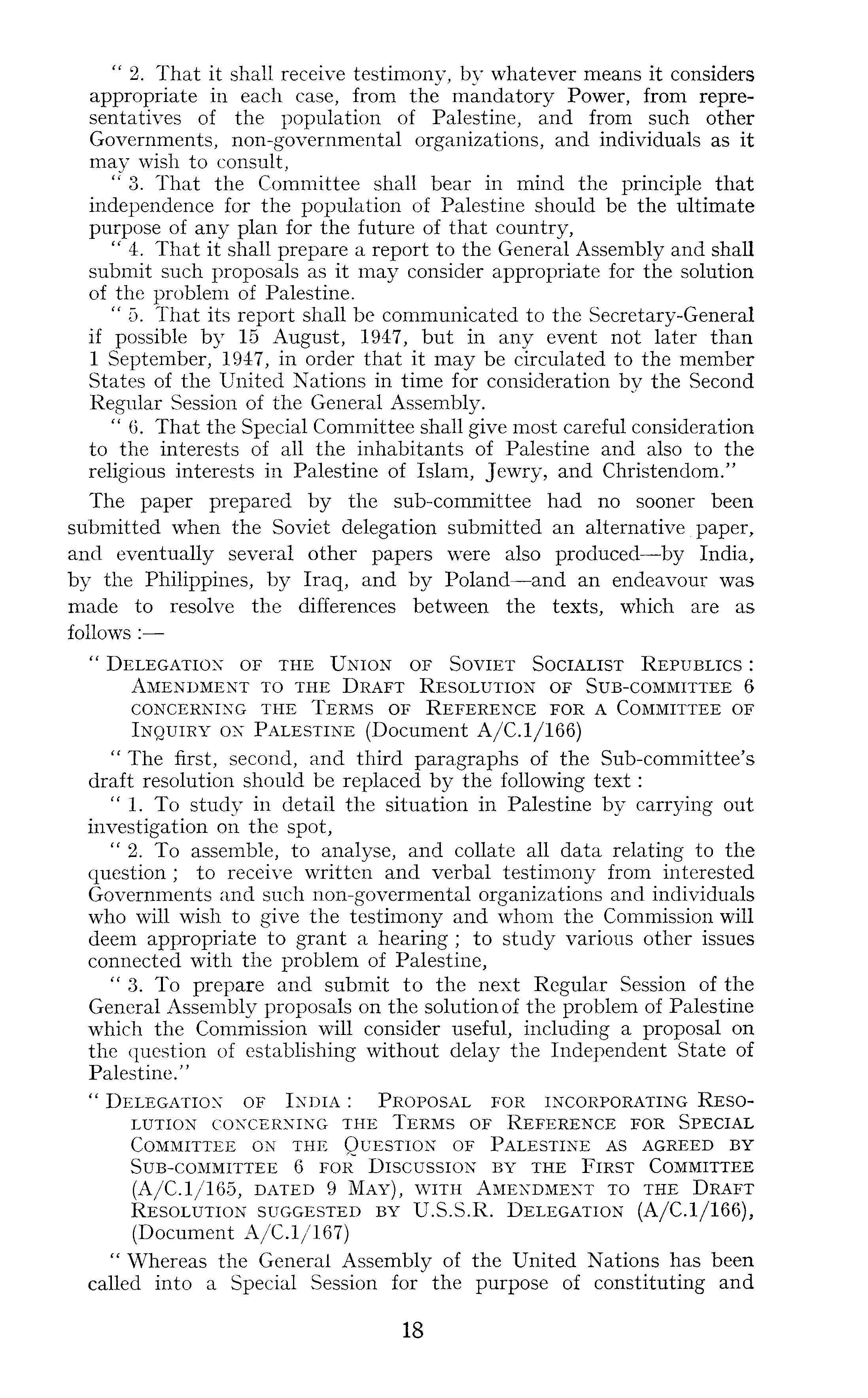"2. That it shall receive testimony, by whatever means it considers appropriate in each case, from the mandatory Power, from representatives of the population of Palestine, and from such other Governments, non-governmental organizations, and individuals as it may wish to consult, "3. That the Committee shall bear in mind the principle that independence for the population of Palestine should be the ultimate purpose of any plan for the future of that country, "4. That it shall prepare a report to the General Assembly and shall submit such proposals as it may consider appropriate for the solution of the problem of Palestine. "5. That its report shall be communicated to the Secretary-General if possible by 15 August, 1947, but in any event not later than 1 September, 1947, in order that it may be circulated to the member States of the United Nations in time for consideration by the Second Regular Session of the General Assembly. "6. That the Special Committee shall give most careful consideration to the interests of all the inhabitants of Palestine and also to the religious interests in Palestine of Islam, Jewry, and Christendom." The paper prepared by the sub-committee had no sooner been submitted when the Soviet delegation submitted an alternative paper, and eventually several other papers were also produced —by India, by the Philippines, by Iraq, and by Poland —and an endeavour was made to resolve the differences between the texts, which are as follows : " Delegation of the Union of Soviet Socialist Republics : Amendment to the Draft Resolution of Sub-committee 6 CONCERNING THE TERMS OF REFERENCE FOR A COMMITTEE OF Inquiry on Palestine (Document A/C.l/166) " The first, second, and third paragraphs of the Sub-committee's draft resolution should be replaced by the following text: "1. To study in detail the situation in Palestine by carrying out investigation on the spot, "2. To assemble, to analyse, and collate all data relating to the question; to receive written and verbal testimony from interested Governments and such non-govermental organizations and individuals who will wish to give the testimony and whom the Commission will deem appropriate to grant a hearing; to study various other issues connected with the problem of Palestine, "3. To prepare and submit to the next Regular Session of the General Assembly proposafs on the solution of the problem of Palestine which the Commission will consider useful, including a proposal on the question of establishing without delay the Independent State of Palestine." " Delegation of India : Proposal for incorporating Resolution concerning the Terms of Reference for Special Committee on the Question of Palestine as agreed by Sub-committee 6 for Discussion by the First Committee (A/C.l/165, dated 9 May), with Amendment to the Draft Resolution suggested by U.S.S.R. Delegation (A/C.l/166), (Document A/C.l/167) " Whereas the General Assembly of the United Nations has been called into a Special Session for the purpose of constituting and