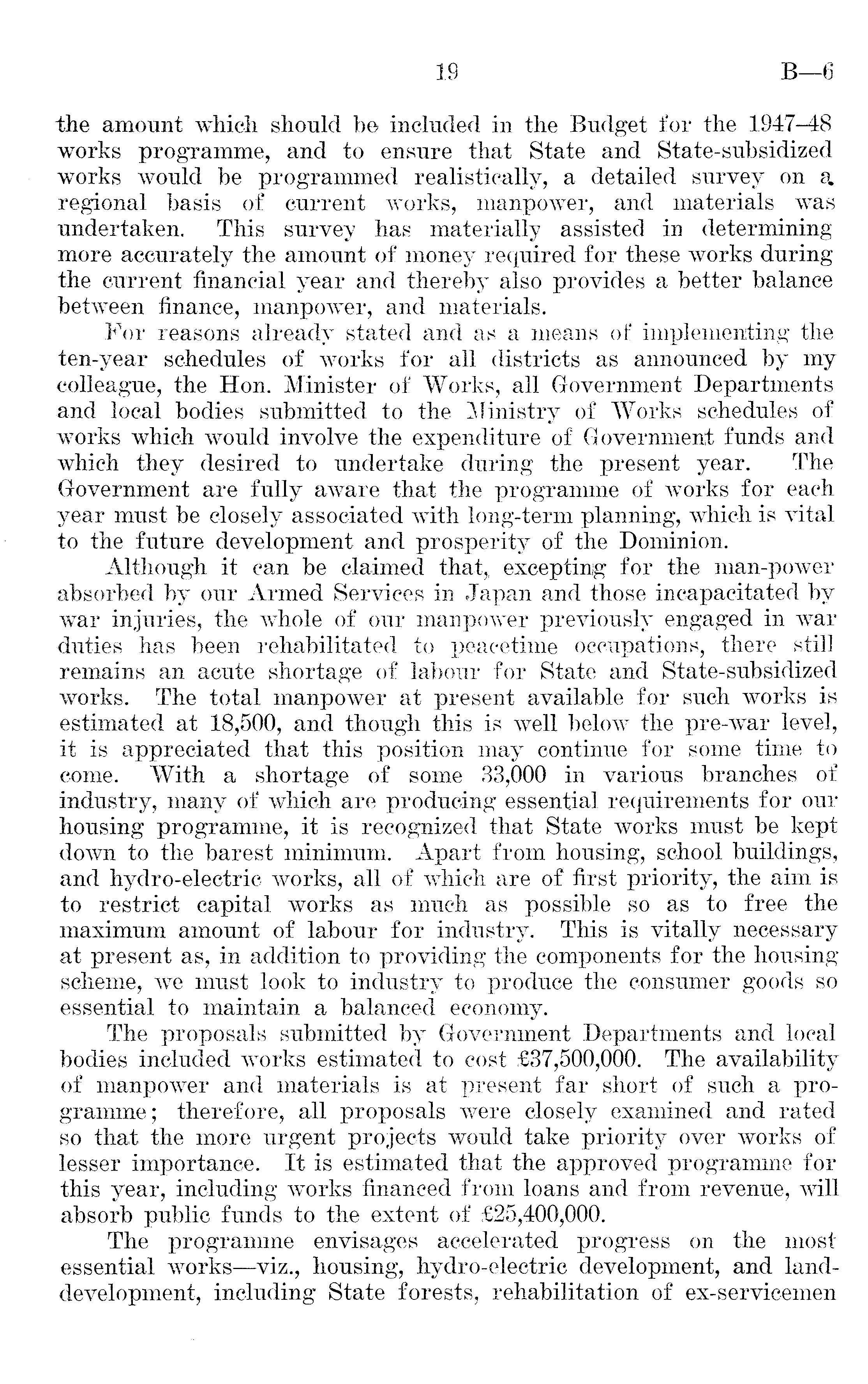 the amount which should bo included in the Budget for the 1947-48 works programme, and to ensure that State and State-subsidized works would be programmed realistically, a detailed survey on a regional basis of current works, manpower, and materials was undertaken. This survey has materially assisted in determining more accurately the amount of money required for these works during the current financial year and thereby also provides a better balance between finance, manpower, and materials. For reasons already stated and as a means of implementing the ten-year schedules of works for all districts as announced by my colleague, the Hon. Minister of Works, all Government Departments and local bodies submitted to the Ministry of Works schedules of works which would involve the expenditure of Government funds and which they desired to undertake during the present year. The Government are fully aware that the programme of works for each year must be closely associated with long-term planning, which is vital to the future development and prosperity of the Dominion. Although it can be claimed that,, excepting for the man-power absorbed by our Armed Services in Japan and those incapacitated by war injuries, the whole of our manpower previously engaged in war duties has been rehabilitated to peacetime occupations, there still remains an acute shortage of labour for State and State-subsidized works. The total manpower at present available for such works is estimated at 18,500, and though this is well below the pre-war level, it is appreciated that this position may continue for some time to come. With a shortage of some 33,000 in various branches of industry, many of which are producing essential requirements for our housing programme, it is recognized that State works must be kept down to the barest minimum. Apart from housing, school buildings, and hydro-electric works, all of which are of first priority, the aim is to restrict capital works as much as possible so as to free the maximum amount of labour for industry. This is vitally necessary at present as, in addition to providing the components for the housing scheme, we must look to industry to produce the consumer goods so essential to maintain a balanced economy. The proposals submitted by Government Departments and local bodies included works estimated to cost £37,500,000. The availability of manpower and materials is at present far short of such a programme; therefore, all proposals were closely examined and rated so that the more urgent projects would take priority over works of lesser importance. It is estimated that the approved programme for this year, including works financed from loans and from revenue, will absorb public funds to the extent of £25,400,000. The programme envisages accelerated progress on the most essential works —viz., housing, hydro-electric development, and landdevelopment, including State forests, rehabilitation of ex-servicemen