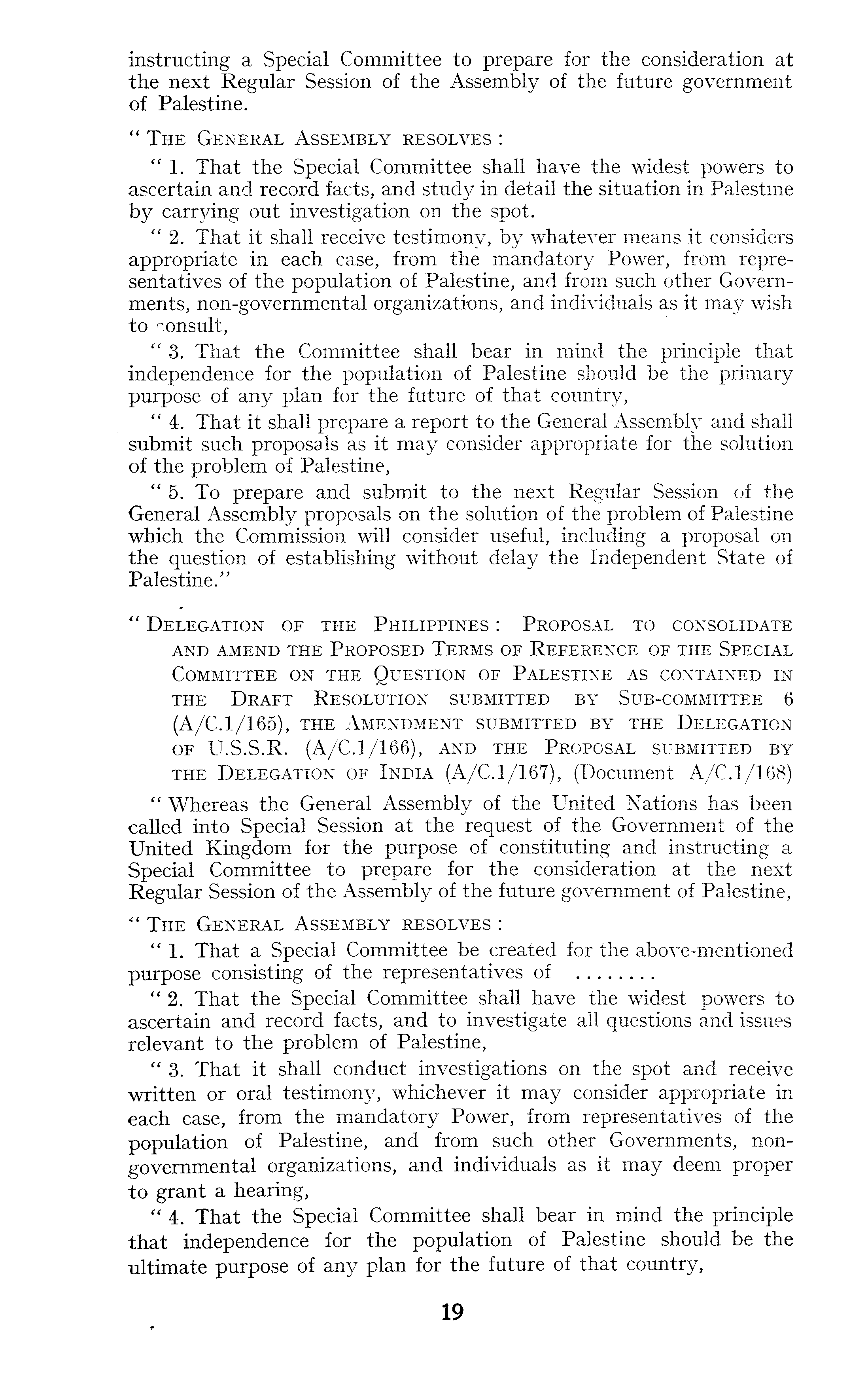 instructing a Special Committee to prepare for the consideration at the next Regular Session of the Assembly of the future government of Palestine. "The General Assembly resolves : "I. That the Special Committee shall have the widest powers to ascertain and record facts, and study in detail the situation in Palestine by carrying out investigation on the spot. " 2. That it shall receive testimony, by whatever means it considers appropriate in each case, from the mandatory Power, from representatives of the population of Palestine, and from such other Governments, non-governmental organizations, and individuals as it may wish to consult, " 3. That the Committee shall bear in mind the principle that independence for the population of Palestine should be the primary purpose of any plan for the future of that country, " 4. That it shall prepare a report to the General Assembly and shall submit such proposals as it may consider appropriate for the solution of the problem of Palestine, "5. To prepare and submit to the next Regular Session of the General Assembly proposals on the solution of the problem of Palestine which the Commission will consider useful, including a proposal on the question of establishing without delay the Independent State of Palestine." " Delegation of the Philippines : Proposal to consolidate AND AMEND THE PROPOSED TERMS OF REFERENCE OF THE SPECIAL Committee on the Question of Palestine as contained in the Draft Resolution submitted by Sub-committee 6 (A/C.l/165), the Amendment submitted by the Delegation of U.S.S.R. (A/C.l/166), and the Proposal submitted by the Delegation of India (A/C.l/167), (Document A/C.l/168) " Whereas the General Assembly of the United Nations has been called into Special Session at the request of the Government of the United Kingdom for the purpose of constituting and instructing a Special Committee to prepare for the consideration at the next Regular Session of the Assembly of the future government of Palestine, " The General Assembly resolves : "1. That a Special Committee be created for the above-mentioned purpose consisting of the representatives of "2. That the Special Committee shall have the widest powers to ascertain and record facts, and to investigate all questions and issues relevant to the problem of Palestine, " 3. That it shall conduct investigations on the spot and receive written or oral testimony, whichever it may consider appropriate in each case, from the mandatory Power, from representatives of the population of Palestine, and from such other Governments, nongovernmental organizations, and individuals as it may deem proper to grant a hearing, " 4. That the Special Committee shall bear in mind the principle that independence for the population of Palestine should be the ultimate purpose of any plan for the future of that country,