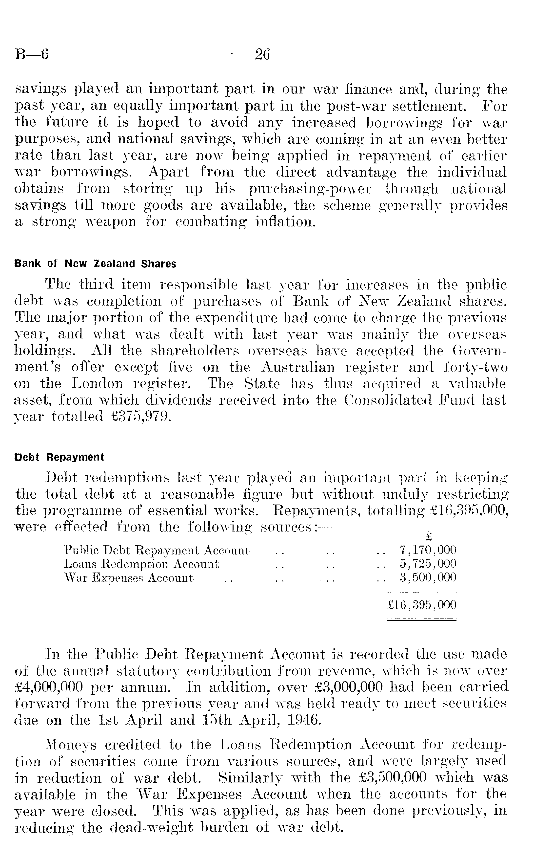 savings played an important part in our war finance and, during the past year, an equally important part in the post-war settlement. For the future it is hoped to avoid, any increased borrowings for war purposes, and national savings, which are coming in at an even better rate than last year, are now being applied in repayment of earlier war borrowings. Apart from the direct advantage the individual obtains from storing up his purchasing-power through national savings till more goods are available, the scheme generally provides a strong weapon for combating inflation. Bank of New Zealand Shares The third item responsible last year for increases in the public debt was completion of purchases of Bank of New Zealand shares. The major portion of the expenditure had come to charge the previous year, and what was dealt with last year was mainly the overseas holdings. All the shareholders overseas have accepted the Government's offer except five on the Australian register and forty-two on the London register. The State has thus acquired a valuable asset, from which dividends received into the Consolidated Fund last year totalled £375,979. Debt Repayment Debt redemptions last year played an important part in keeping the total debt at a reasonable figure but without unduly restricting the programme of essential works. Repayments, totalling £16,395,000, were effected from the following sources: — Public Debt Repayment Account .. .. .. 7,170,000 Loans Redemption Account .. .. .. 5,725,000 War Expenses Account .. .. ... .. 3,500,000 £16,395,000 In the Public Debt Repayment Account is recorded the use made of the annual statutory contribution from revenue, which is now over £4,000,000 per annum. In addition, over £3,000,000 had been carried forward from the previous year and was held ready to meet securities due on the Ist April and 15th April, 1946. Moneys credited to the Loans Redemption Account for redemption of securities come from various sources, and were largely used in reduction of war debt. Similarly with the £3,500,000 which was available in the War Expenses Account when the accounts for the year were closed. This was applied, as has been done previously, in reducing the dead-weight burden of war debt.