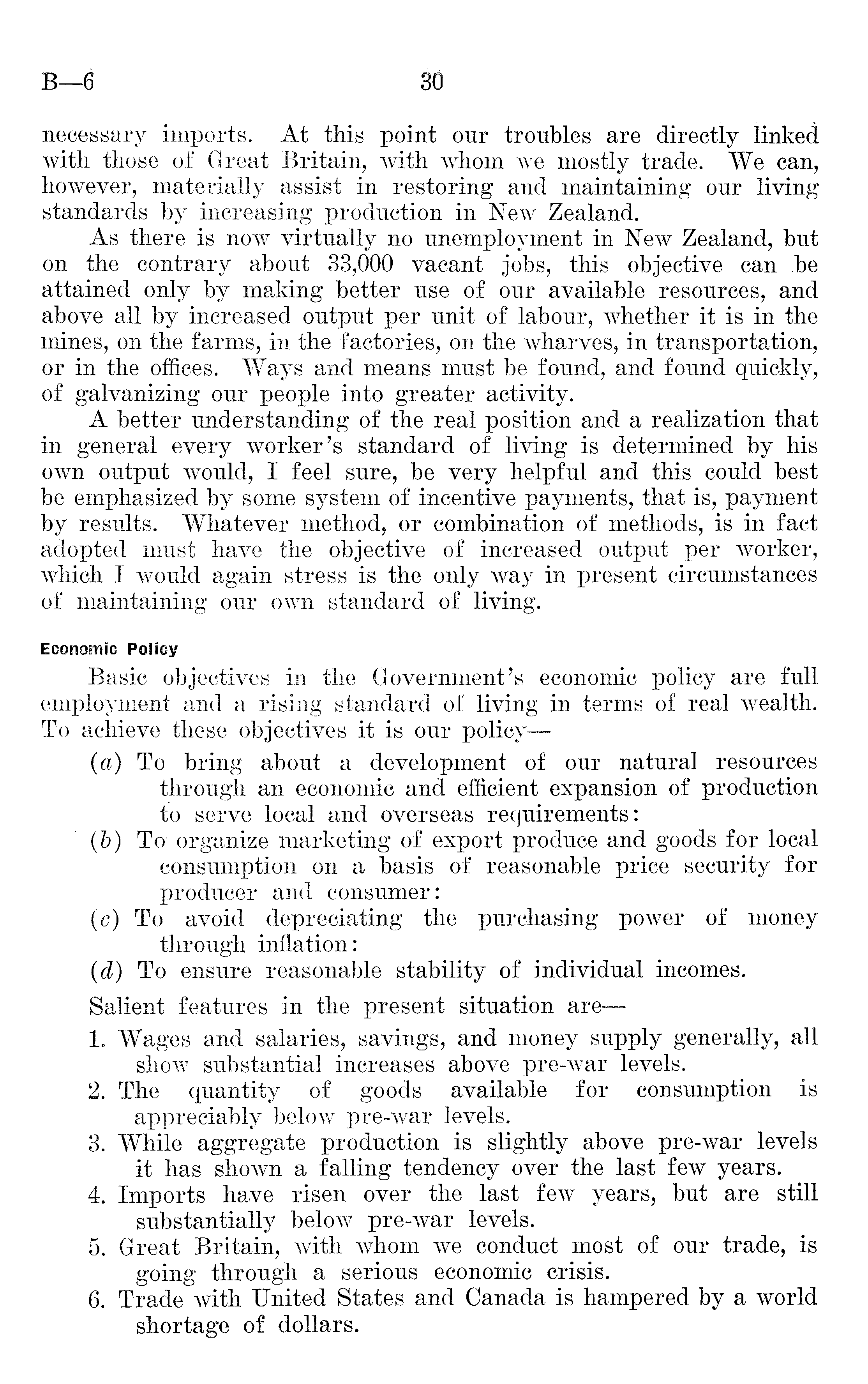 necessary imports. At this point our troubles are directly linked with those of Great Britain, with whom we mostly trade. We can, however, materially assist in restoring and maintaining our living standards by increasing production in New Zealand. As there is now virtually no unemployment in New Zealand, but on the contrary about 33,000 vacant jobs, this objective can be attained only by making better use of our available resources, and above all by increased output per unit of labour, whether it is in the mines, on the farms, in the factories, on the wharves, in transportation, or in the offices. Ways and means must be found, and found quickly, of galvanizing our people into greater activity. A better understanding of the real position and a realization that in general every worker's standard of living is determined by his own output would, I feel sure, be very helpful and this could best be emphasized by some system of incentive payments, that is, payment by results. Whatever method, or combination of methods, is in fact adopted must have the objective of increased output per worker, which I would again stress is the only way in present circumstances of maintaining our own standard of living. Economic Policy Basic objectives in the Government's economic policy are full employment and a rising standard of living in terms of real wealth. To achieve these objectives it is our policy—{a) To bring about a development of our natural resources through an economic and efficient expansion of production to serve local and overseas requirements: (b) To organize marketing of export produce and goods for local consumption on a basis of reasonable price security for producer and consumer: (c) To avoid depreciating the purchasing power of money through inflation: (d) To ensure reasonable stability of individual incomes. Salient features in the present situation are — 1. Wages and salaries, savings, and money supply generally, all show substantial increases above pre-war levels. 2. The quantity of goods available for consumption is appreciably below pre-war levels. 3. While aggregate production is slightly above pre-war levels it has shown a falling tendency over the last few years. 4. Imports have risen over the last few years, but are still substantially below pre-war levels. 5. Great Britain, with whom we conduct most of our trade, is going through a serious economic crisis. 6. Trade with United States and Canada is hampered by a world shortage of dollars.