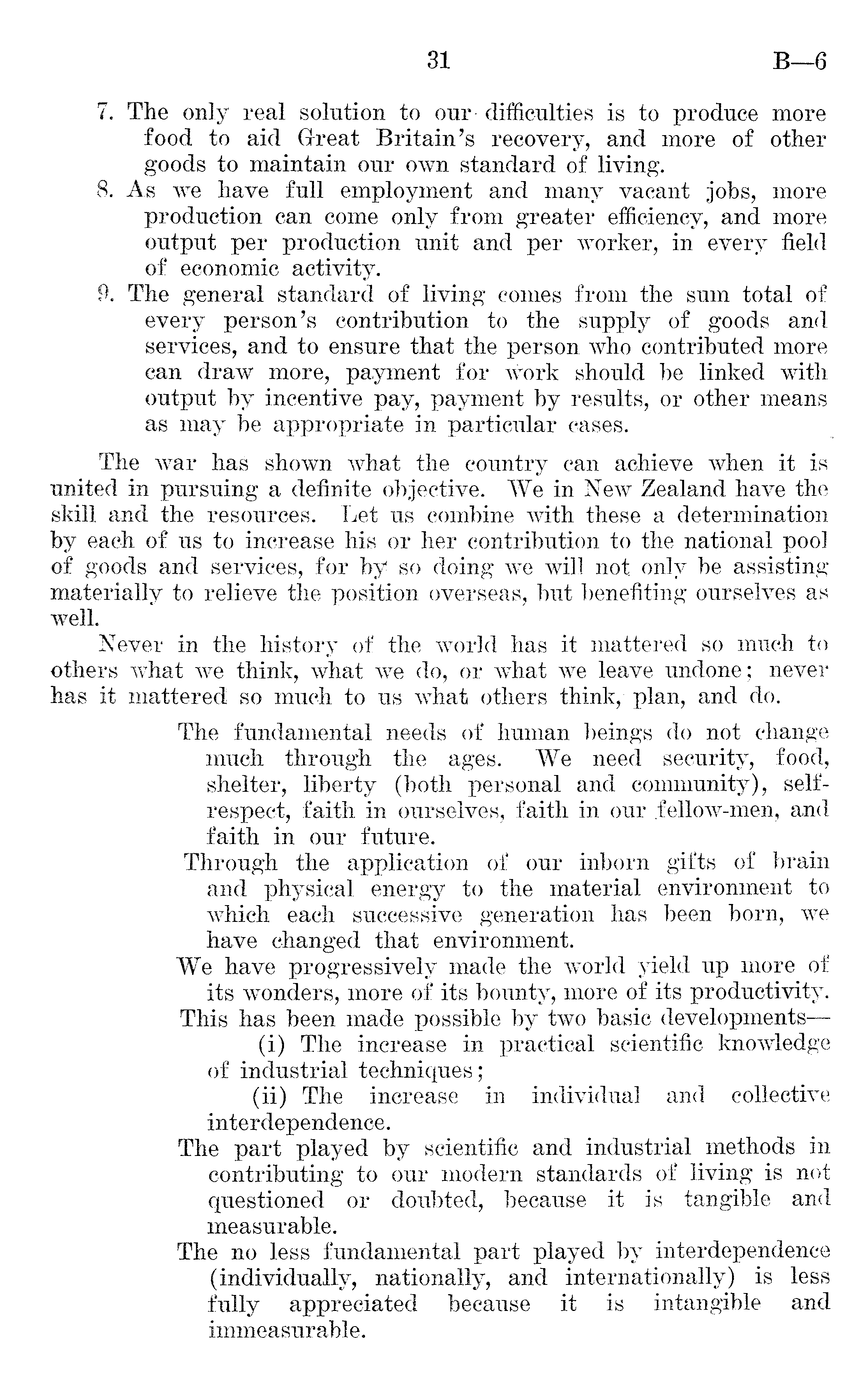 7. The only real solution to our - difficulties is to produce more food to aid Great Britain's recovery, and more of other goods to maintain our own standard of living. 8. As we have full employment and many vacant jobs, more production can come only from greater efficiency, and more output per production unit and per worker, in every field of economic activity. 9. The general standard of living comes from the sum total of every person's contribution to the supply of goods and services, and to ensure that the person who contributed more can draw more, payment for work should be linked with output by incentive pay, payment by results, or other means as may be appropriate in particular cases. The war has shown what the country can achieve when it is united in pursuing a definite objective. We in New Zealand have the skill and the resources. Let us combine with these a determination by each of us to increase his or her contribution to the national pool of goods and services, for by so doing we will not only be assisting materially to relieve the position overseas, but benefiting ourselves as well. Never in the history of the world has it mattered so much to others what we think, what we do, or what we leave undone; never has it mattered so much to us what others think, plan, and do. The fundamental needs of human beings do not change much through the ages. We need security, food, shelter, liberty (both personal and community), selfrespect, faith in ourselves, faith in our fellow-men, and faith in our future. Through the application of our inborn gifts of brain and physical energy to the material environment to which each successive generation has been born, we have changed that environment. We have progressively made the world yield up more of its wonders, more of its bounty, more of its productivity. This has been made possible by two basic developments — (i) The increase in practical scientific knowledge of industrial techniques; (ii) The increase in individual and collective interdependence. The part played by scientific and industrial methods in contributing to our modern standards of living is not questioned or doubted, because it is tangible and measurable. The no less fundamental part played by interdependence (individually, nationally, and internationally) is less fully appreciated because it is intangible and immeasurable.