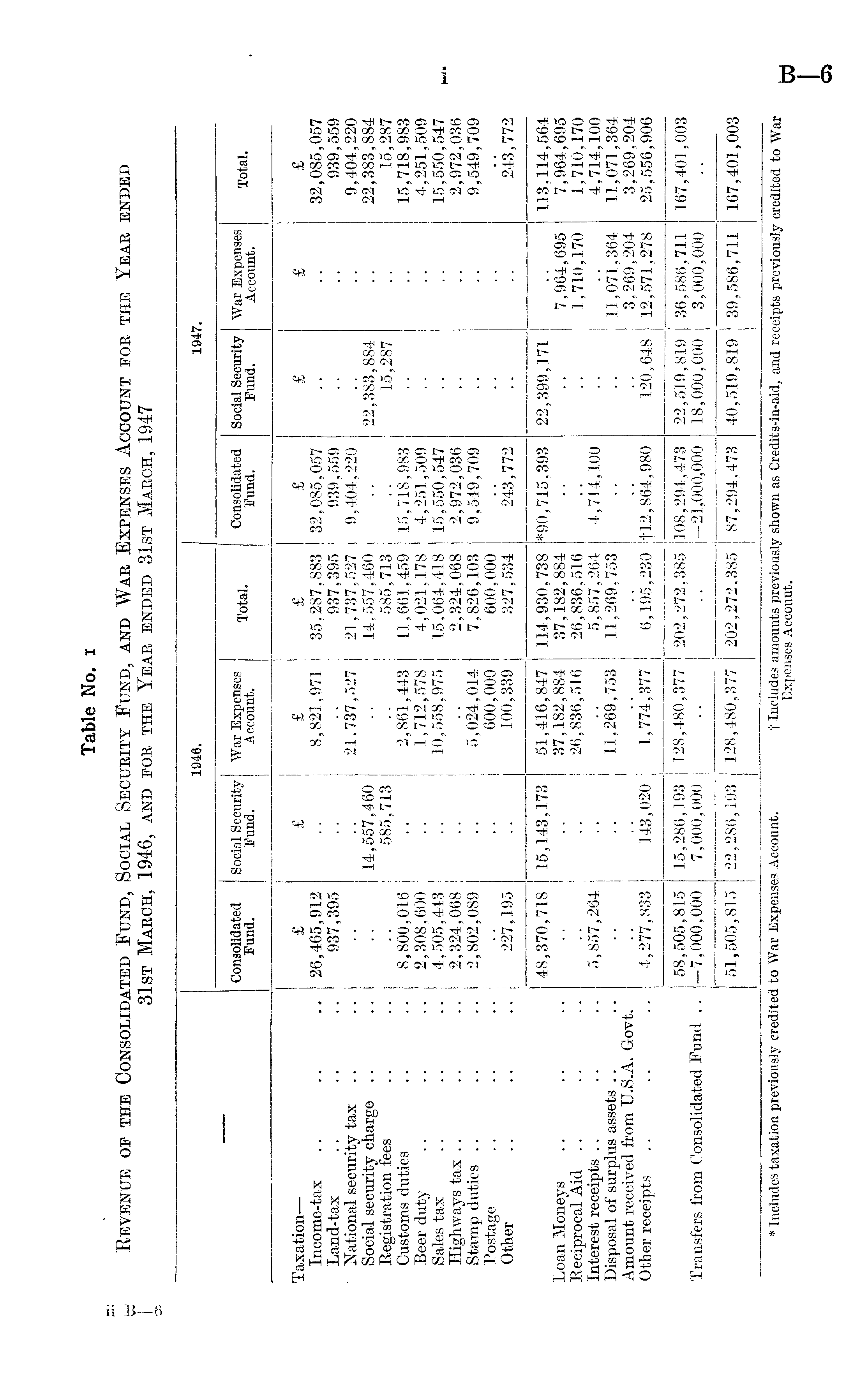 1946. 1947. Consolidated Fund. Social Security Fund. War Expenses Account. Total. Consolidated Fund. Social Security Fund. War Expenses Account. Total. Taxation — Income-tax Land-tax National security tax Social security charge Registration fees Customs duties Beer duty Sales tax Highways tax Stamp duties Postage Other £ 26,465,912 937,395 8,800,016 2,308,600 4,505,443 2,324,068 2,802,089 227,195 £ 14,557,460 585,713 £ 8,821,971 21,737,527 2,86jL,443 1,712,578 10,558,975 5,024,014 600,000 100,339 £ 35,287,883 937,395 21,737,527 14,557,460 585,713 11,661,459 4,021,178 15,064,418 2,324,068 7,826,103 600,000 327,534 £ 32,085,057 939,559 9,404,220 4,251,509 15,550,547 • 2,972,036 9,549,709 243,772 £ 22,383,884 15,287 £ £ 32,085,057 939,559 9,404,220 22,383,884 15,287 15,718,983 4,251,509 15,550,547 2,972,036 9,549,709 243,772 Loan Moneys Reciprocal Aid Interest receipts Disposal of surplus assets Amount received from U.S.A. Govt. Other receipts 48,370,718 5,857,264 4,277,833 15,143,173 I * ' 143,020 51,416,847 37,182,884 26,836,516 11,269,753 1,774*377 114,930,738 37,182,884 26,836,516 5,857,264 11,269,753 6,195,230 *90,715,393 4,714,100 1*12,864,980 22,399,171 120,648 7,964,695 1,710,170 11,071,364 3,269,204 12,571,278 113,114,564 7,964,695 1,710,170 4,714,100 11,071,364 3,269,204 25,556,906 Transfers from Consolidated Fund .. 58,505,815 -7,000,000 15,286,193 7,000,000 128,480,377 202,272,385 108,294,473 -21,000,000 22,519,819 18,000,000 36,586,711 3,000,000 167,401,003 51,505,815 22,286,193 128,480,377 202,272,385 87,294,473 40,519,819 39,586,711 167,401,003 * Includes taxation previously credited to War Expenses Account. t Includes amounts previously shown as Credits-in-aid, and receipts previously credited to War Expenses Account.